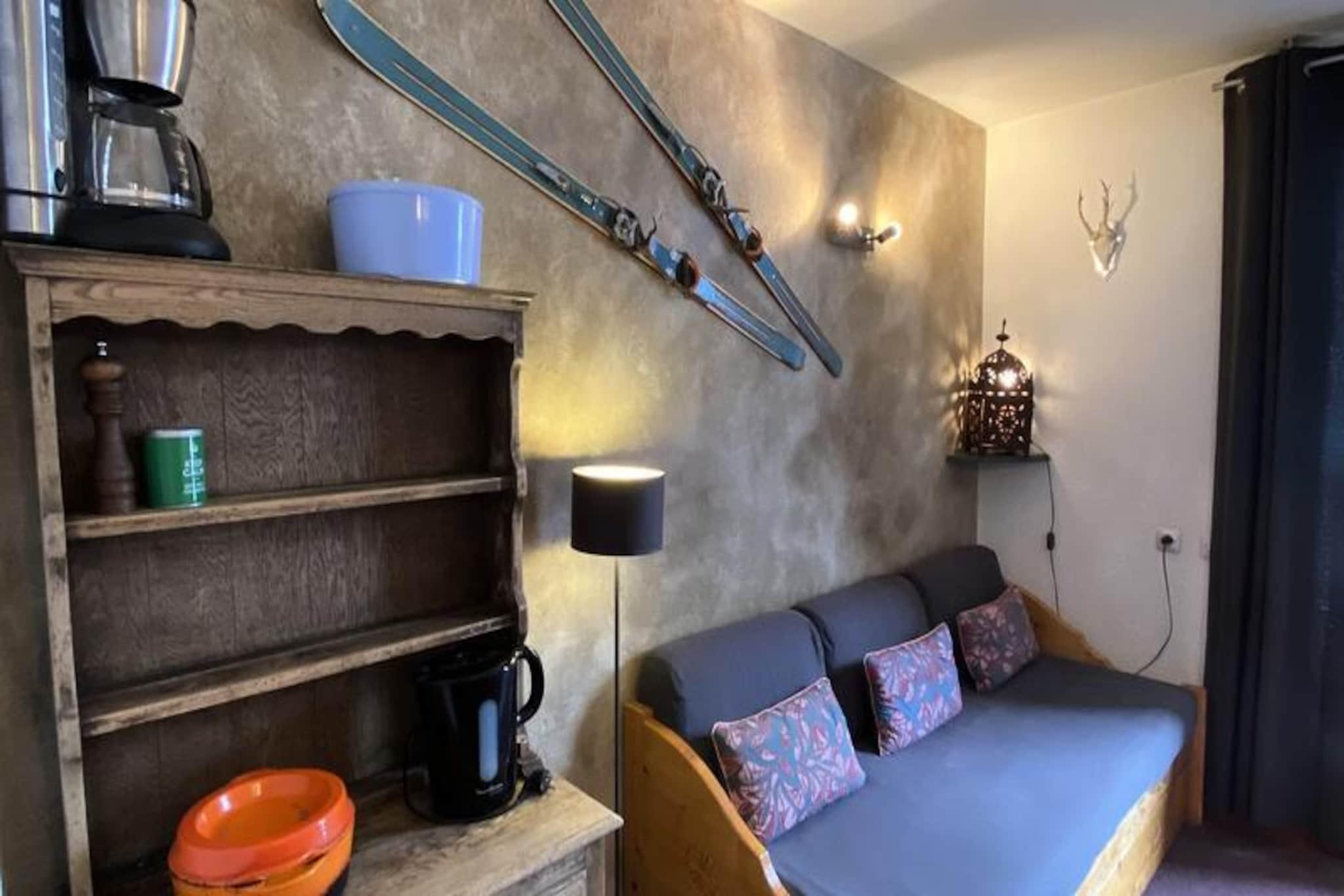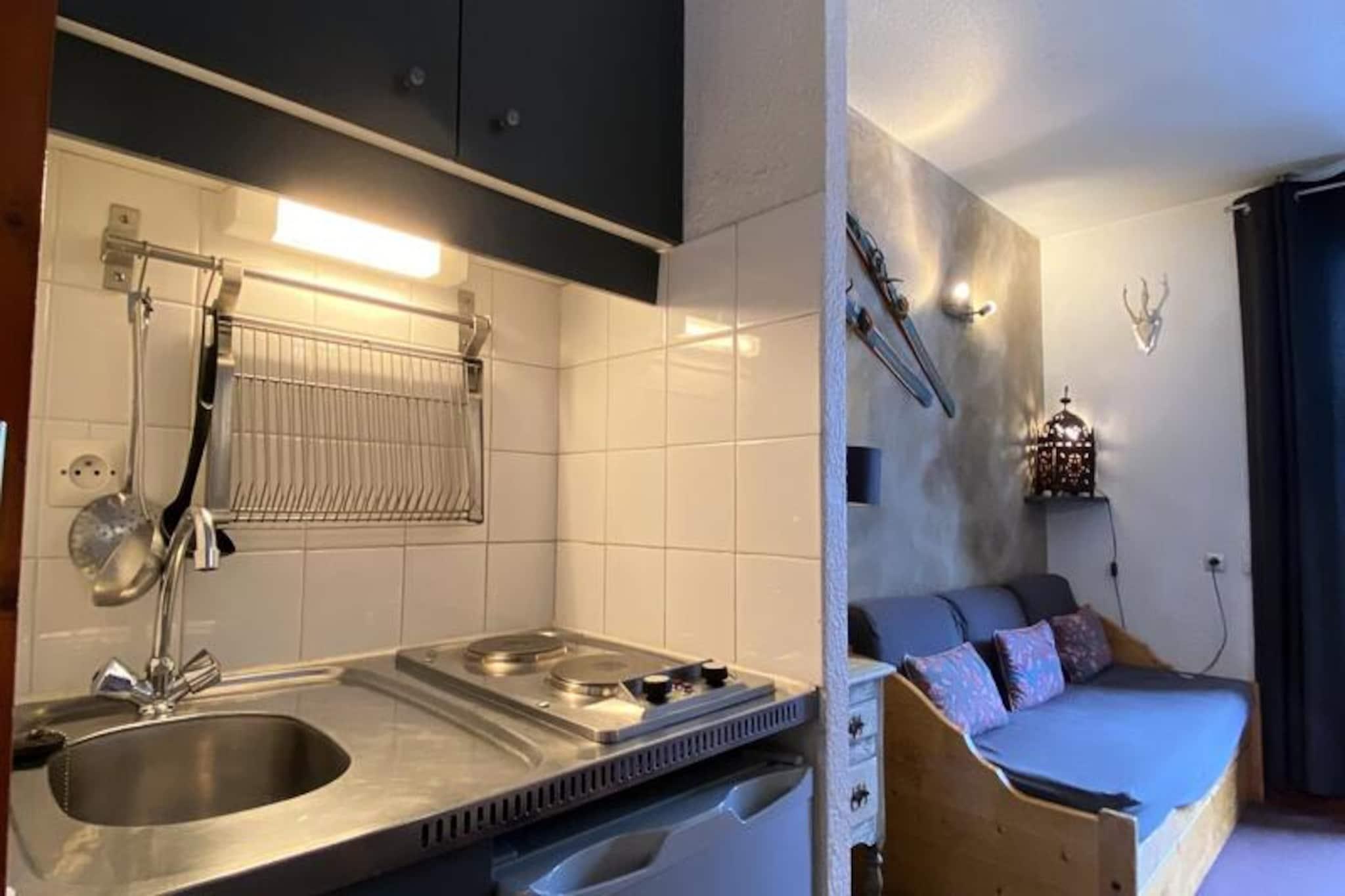 Ved foden af ??den maleriske Charmasson-piste tilbyder dette hyggelige studie et intimt alpint tilflugtssted for par eller små grupper. Kun 200 meter fra landsbyens centrum finder du den perfekte balance mellem ro og bekvemmelighed, med landsbyens pulserende hjerte og dens faciliteter kun en kort gåtur væk. Den sydvendte balkon tilbyder en charmerende udsigt over pisten og inviterer dig til at nyde den rolige bjergatmosfære.\n\nDet gennemtænkte 17 m² store studie har komfortabel plads til 2-3 gæster. Opholdsstuen har en dobbelt udtræksseng og et tv, hvilket skaber et hyggeligt rum at slappe af efter en dag med eventyr. Tekøkkenet er udstyret med to kogeplader, køleskab og mikrobølgeovn, hvilket gør det nemt at tilberede enkle måltider. En gang med to køjesenge tilbyder yderligere sovemuligheder, mens badeværelset har bruser og toilet for din bekvemmelighed. Et skiskab i boligen sikrer, at dit udstyr altid er klar til pisterne.\n\nBeliggende nær Charmasson-pisten er denne bolig et paradis for skientusiaster med nem adgang til pisterne og en betagende alpin udsigt. Om sommeren forvandles området til et paradis for vandrere og naturelskere med stier, der fører til fantastiske udsigter og fredelige bjerglandskaber. Landsbyens centrum, kun en kort gåtur væk, byder på charmerende restauranter, butikker og lokale attraktioner at udforske. \n\nUanset om du søger en vinterferie eller et sommereventyr, er dette studie den perfekte base for at skabe uforglemmelige minder i de franske alper.