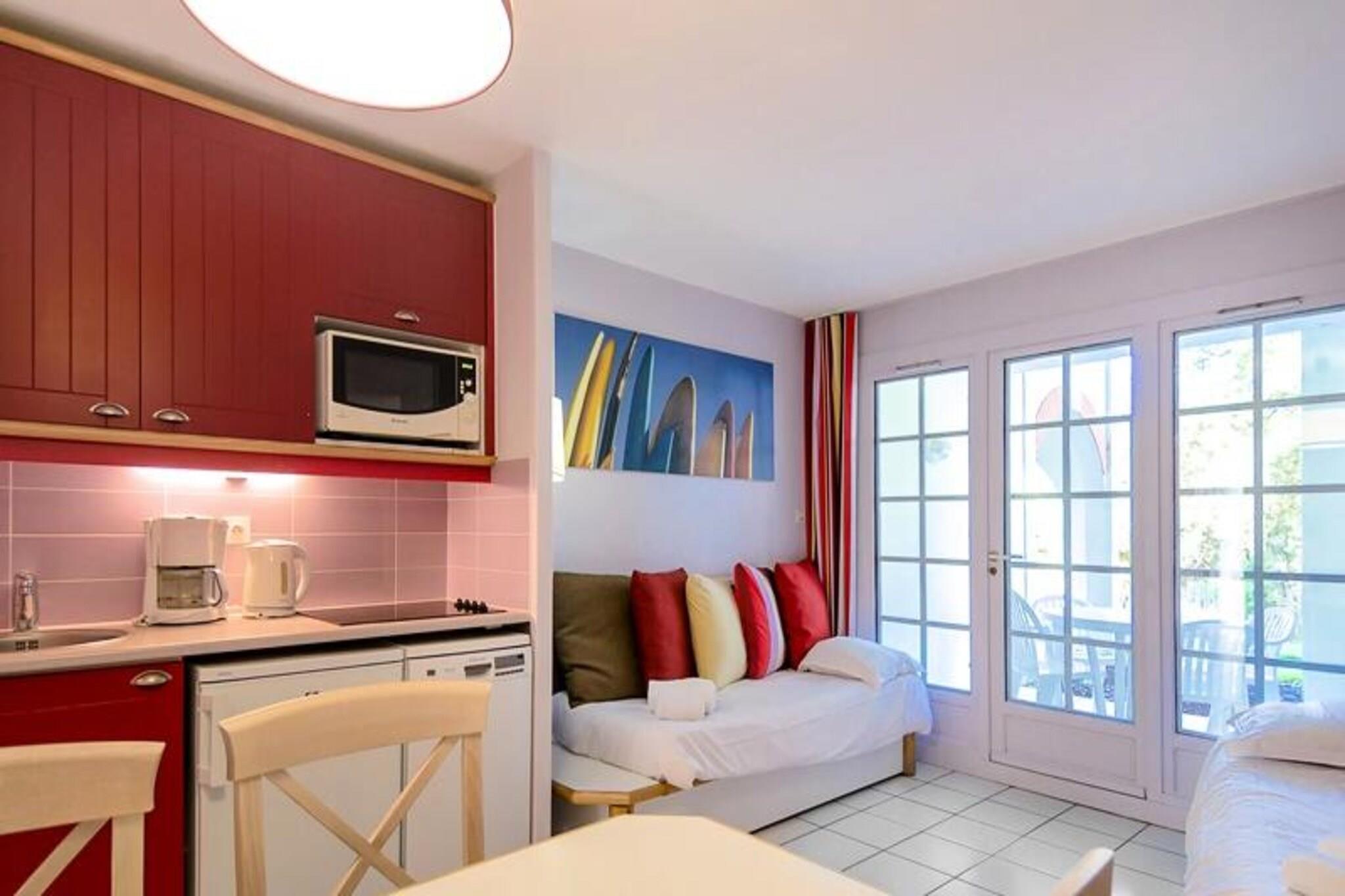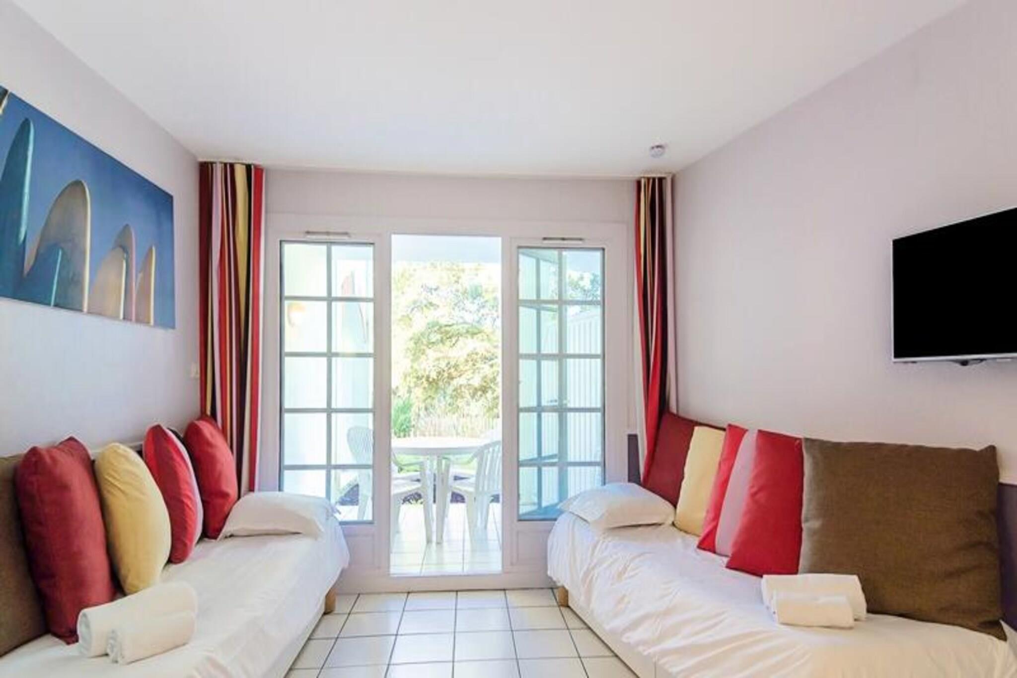 Dette hyggelige feriehus ligger i en fyrreskov og byder p? en stue med to sovesofaer og en udtr?ksseng med plads til op til tre g?ster. Den har et sovev?relse med en dobbeltseng, et badev?relse med en kombination af badekar og bruser og et separat toilet. Boligen er k?ledyrsvenlig mod et ekstra gebyr, og en m?bleret terrasse med bord og stole tilf?jer udend?rs plads til afslapning. Sengelinned og h?ndkl?der er tilg?ngelige mod et ekstra gebyr, og slutreng?ring er obligatorisk. Denne ejendom ligger 1,5 km fra stranden og tilbyder nem adgang til vandsport som surfing og bodyboarding. Vandreentusiaster kan udforske naturreservatet Courant d'Huchet, mens landsbyen tilbyder aktiviteter s?som karting og bueskydning. G?sterne kan ogs? nyde fire swimmingpools, herunder to opvarmede muligheder, i landsbyen. Lejligheden har fuldt udstyret k?kken, spiseplads og opholdsstue. Faciliteterne p? stedet inkluderer gratis parkering, tr?dl?s internetadgang i receptionen og adgang til den f?lles swimmingpool, der er ?ben fra maj til september. En obligatorisk slutreng?ring er p?kr?vet, og yderligere tjenester s?som leje af linned og h?ndkl?der er tilg?ngelige.