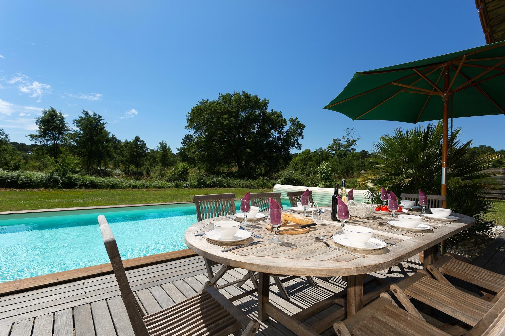 Rummelig familievilla med privat pool og skyggefuld have Velkommen til dit idylliske kystferiested i Moliets! Denne charmerende villa på 110 m² er designet til komfort og afslapning, og byder på fire soveværelser, tre moderne badeværelser og en lys stue med pejs og satellit-tv. Det åbne køkken er fuldt udstyret med ovn, mikroovn og opvaskemaskine, perfekt til familiefester eller romantiske middage. Udenfor finder du en smuk privat pool (åben april-oktober), omgivet af en skyggefuld have, en træterrasse og elegante udendørsmøbler - ideel til lange frokoster, siestaer eller stjernekiggeraftener. Natur, strande og kæledyrsvenlig sjov Gemt mellem Atlanterhavet og den fredfyldte Landes fyrreskov tilbyder denne villa den perfekte balance mellem afsondrethed og tilgængelighed. Kun 1,2 km fra Moliets brede sandstrande kan du cykle eller gå langs naturskønne stier lige fra din dør. Kæledyr er hjerteligt velkomne, og de vil elske de kæledyrsvenlige vandreture langs kysten, skovstier og endda lokale begivenheder som hundestrandmøder og udendørs kæledyrsmarkeder om sommeren. Uanset om det er en omgang apport i haven eller et plask ved den nærliggende sø, er dette ophold virkelig for hele familien. Gourmet smag og afslappede vibes Efter en dag i solen kan du udforske Moliets' pulserende spisescene - friske østers, grillet fisk, baskiske tapas og fine vine venter på strandcaféer og golfbanerestauranter. Lokale landmandsmarkeder byder på de bedste regionale smagsoplevelser, mens barer i nærheden serverer solnedgang og signaturcocktails.
