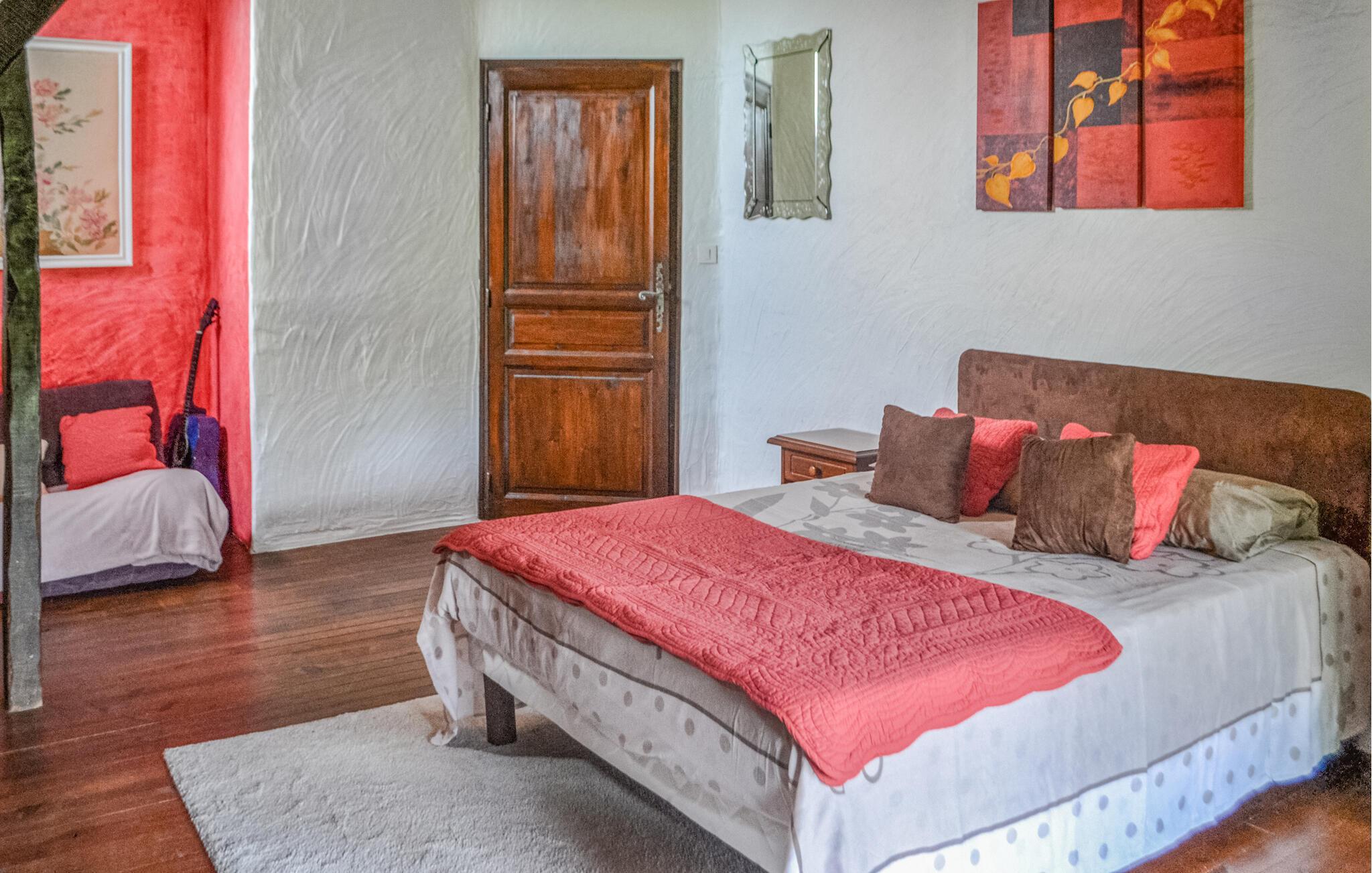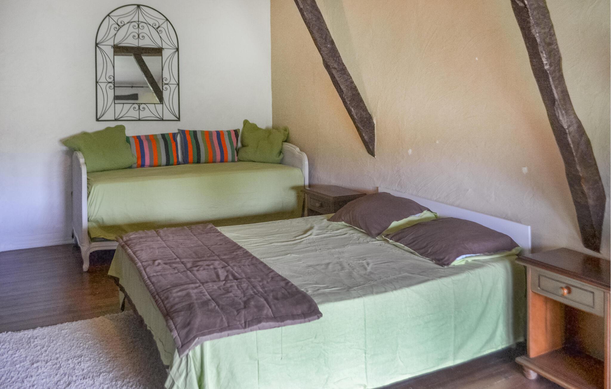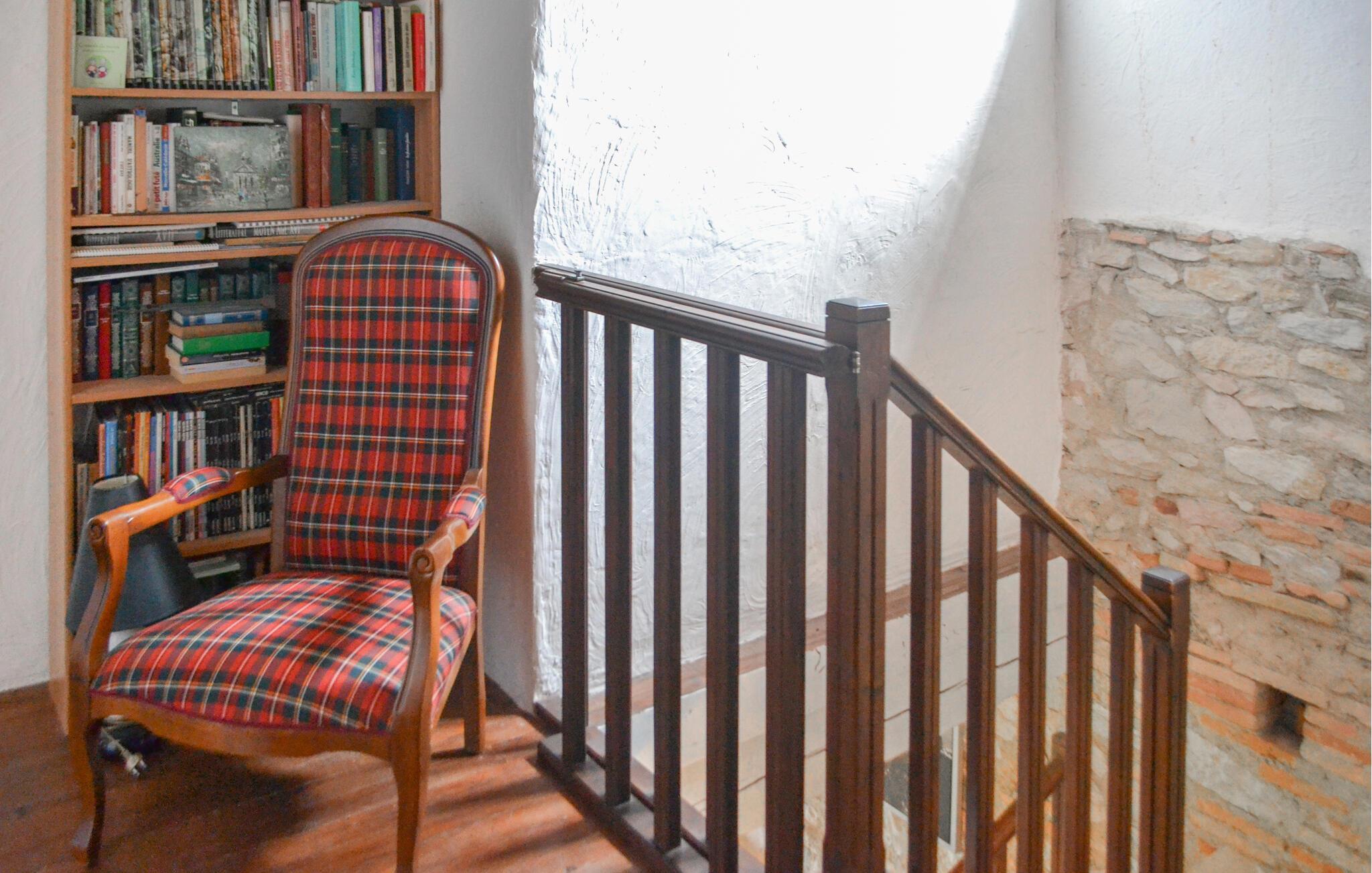 På den åbne terrasse kan I nyde den vidunderlige udsigt over landskabet, og i den skønne, fælles have med grill og swimmingpool kan I glæde jer til mange sjove timer i solen. Køl jer af i poolen, lad børnene gøre badutspring på trampolinen og duellér ved bordtennisbord og bordfodboldbordet. Det andet badeværelse ligger i et anneks og deles med andre gæster.