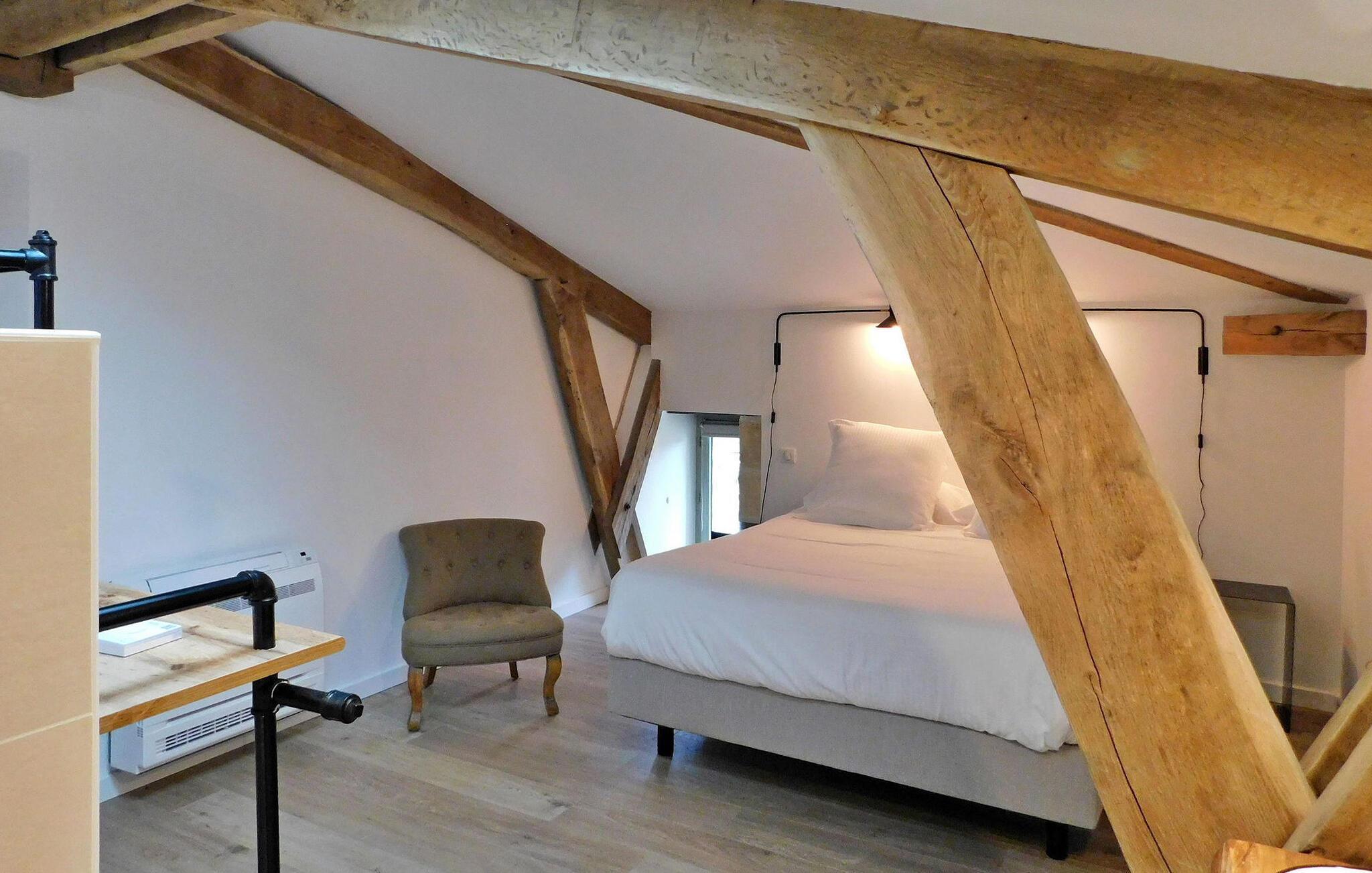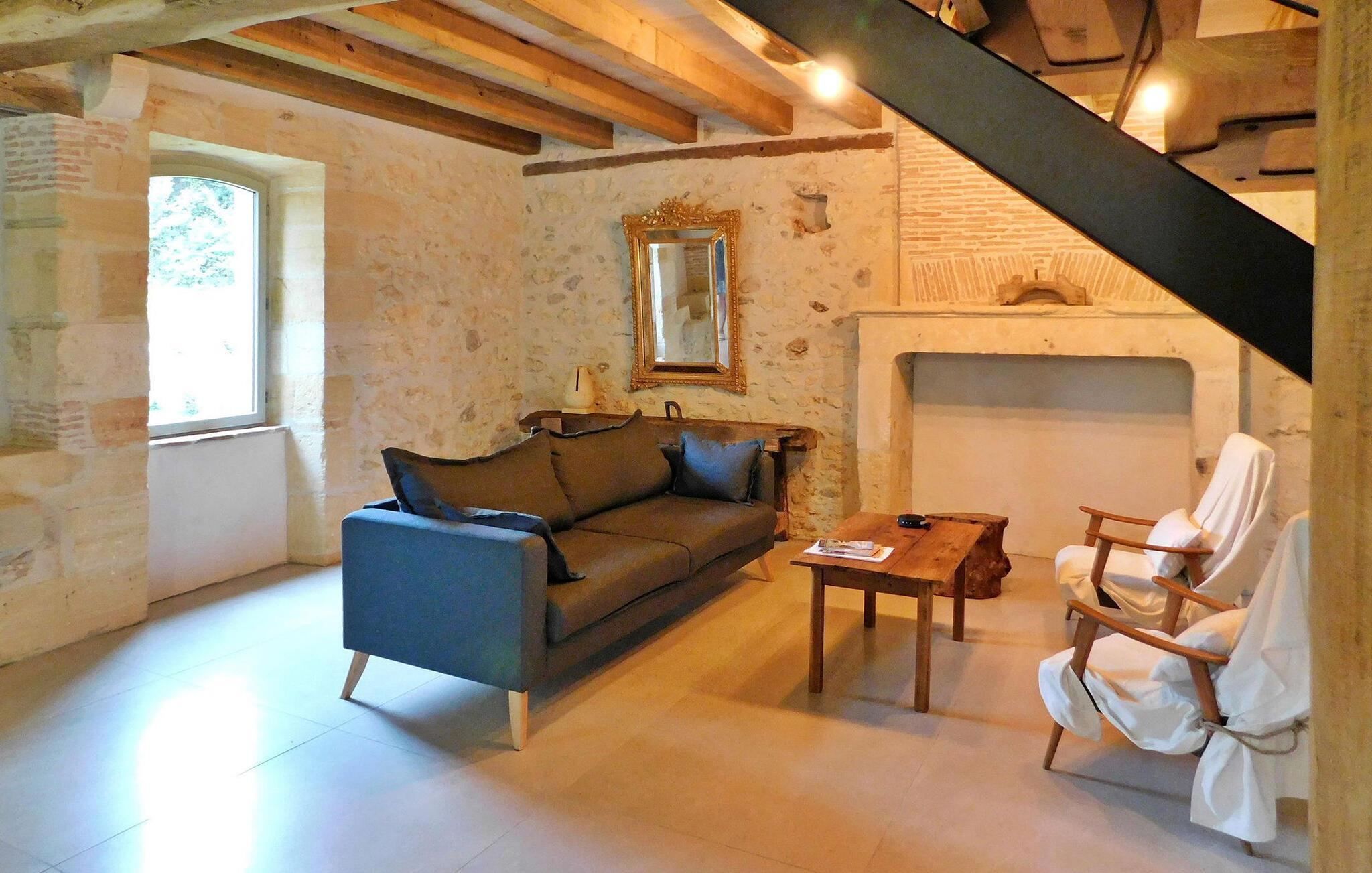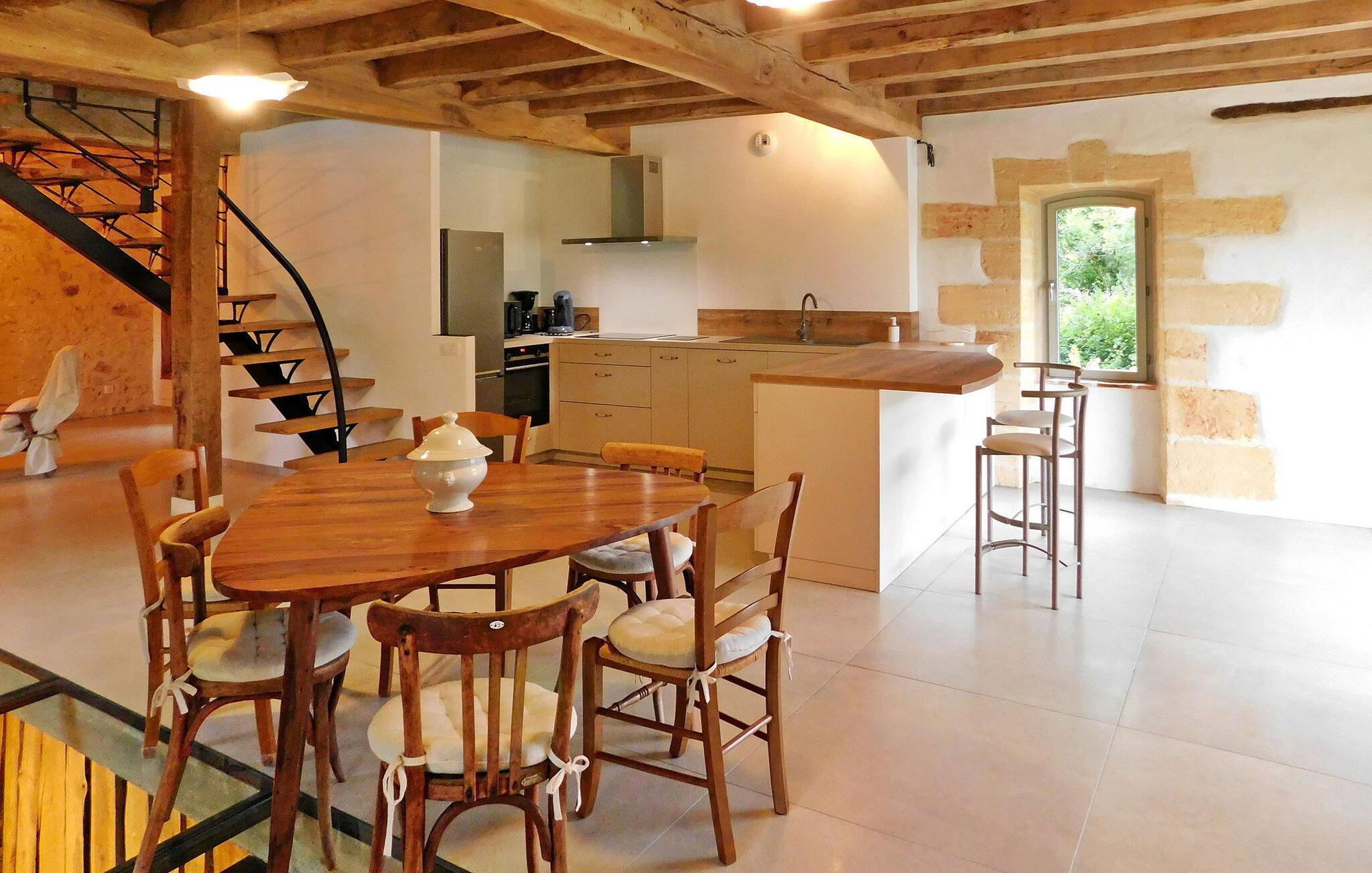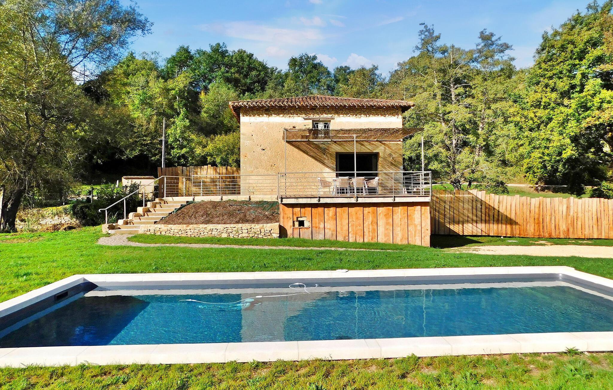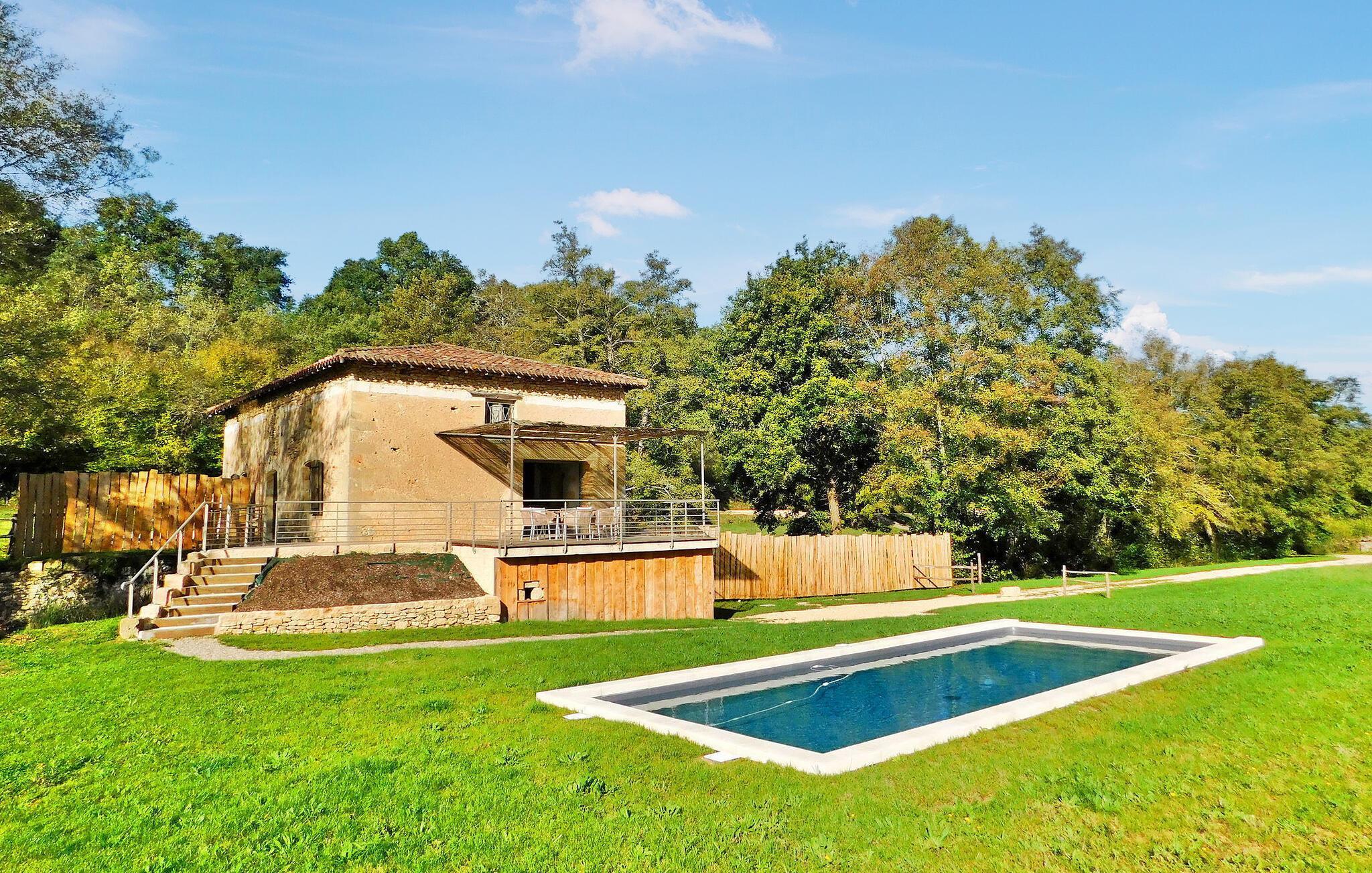 Denne nyligt restaurerede tidligere mølle i hjertet af naturen i Dordogne udstråler charmen fra Périgord med bevarede funktioner som synlige bjælker, en stenpejs og vægge. Stueetagen har en åben opholdsstue med opholdsområde, spiseplads, køkken og et toilet med vaskefaciliteter. Første sal byder på soveværelser med aircondition, hver med ensuite faciliteter. Udenfor er der en swimmingpool, terrasse med siddepladser og en stentrappe for adgang til huset. Bemærk venligst: ejendommen deler jorden med en anden feriebolig, også udstyret med en privat pool, som ligger ca. 10 m væk. Privatlivets fred mellem de to lejemål bevares dog, da de er placeret på en måde, der sikrer diskretion, med separat parkering og adgang for hver. Alle butikker omkring 2,5 km væk i den middelalderlige landsby Monpazier.
