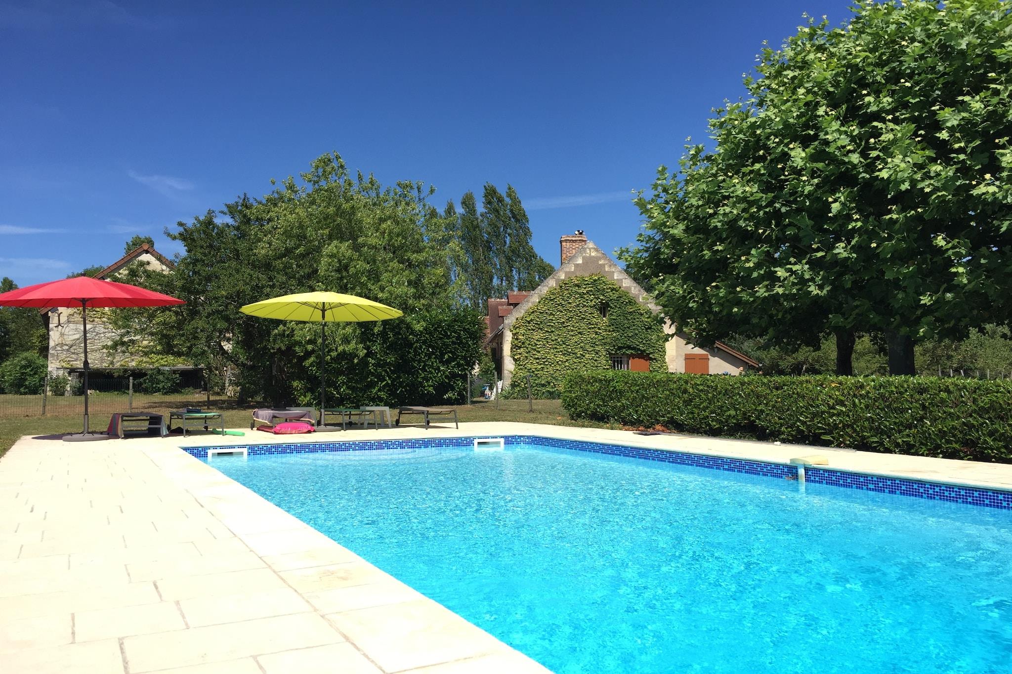 Et komfortabelt fritliggende sommerhus på en privat ejendom. Vidunderlig rolig beliggenhed for enden af ??en blind vej, lige uden for Montrichard. "Domaine Les Drageonnières" (4,5 ha) består af to komfortable feriehuse (La Bergerie og La Ferme) og en smukt beliggende fælles swimmingpool. Et meget velegnet sted for to familier, der holder ferie sammen. Men også fint at leje enkeltvis. Det store udendørs rum byder på masser af privatliv. Du bliver i "La Ferme" (midt på luftfotoet). Interiøret er pænt arrangeret og veludstyret med moderne komfort. Sengene er 2,10m lange og der er flere badeværelser. Fra din møblerede terrasse kan du nyde den smukke udsigt over engene, skovene og Cher-dalen. Skulle du kunne løsrive dig fra denne ejendom, vil du se, at det omkringliggende område bestemt er et besøg værd. Montrichard (2 km) har en hyggelig middelalderby med et af de ældste slotte i Frankrig. Slottene Chenonceau (12 km) og Amboise (20 km) er også imponerende. I Bourré (4 km) kan du besøge gamle vinkældre. I Saint-Aignan-sur-Cher (20 km) er der en zoologisk have. Men også Tours (48 km) og Blois (34 km) er et besøg værd.