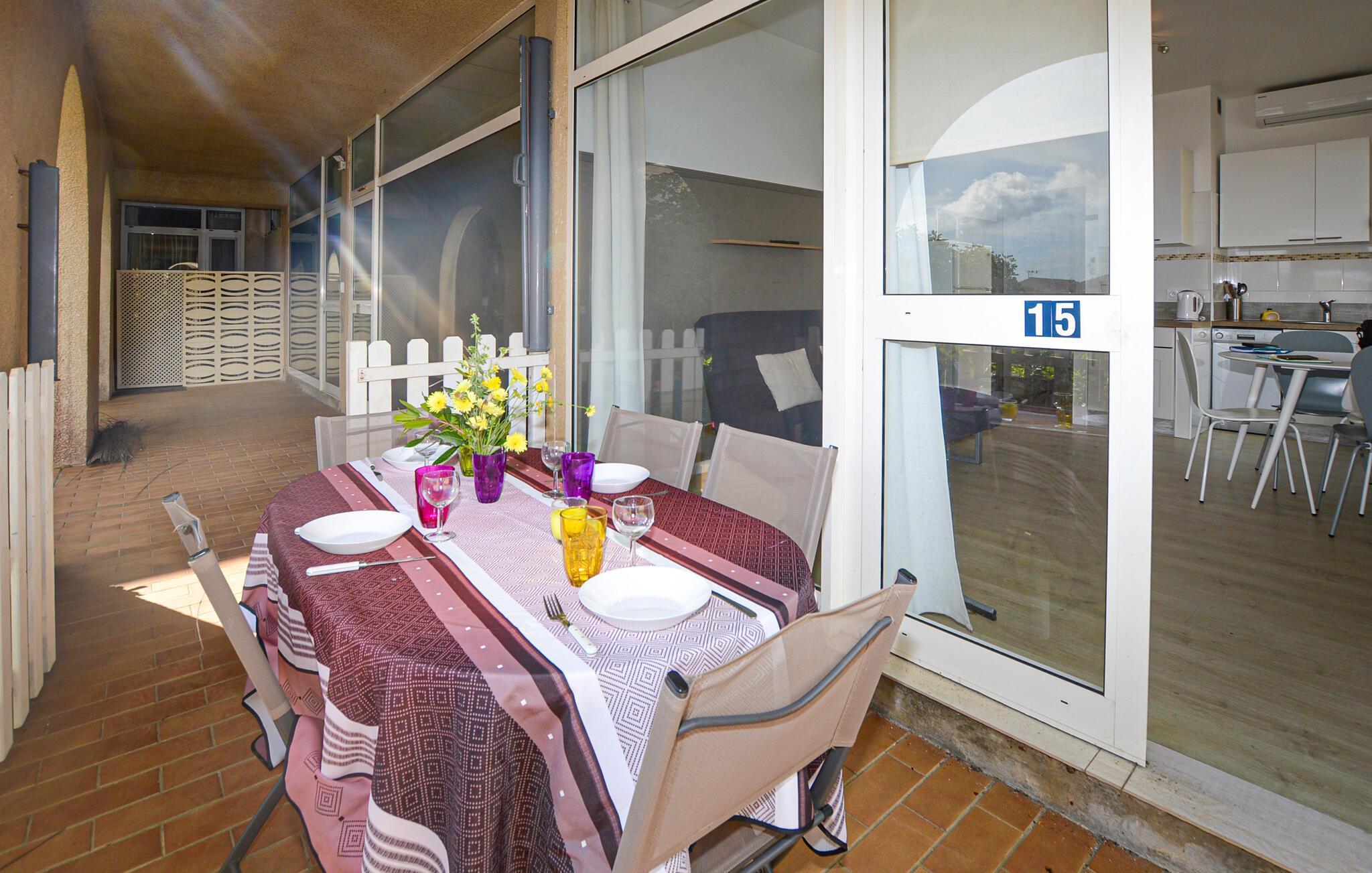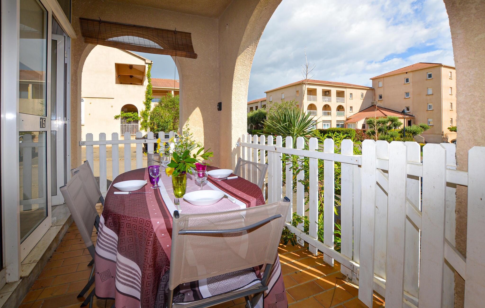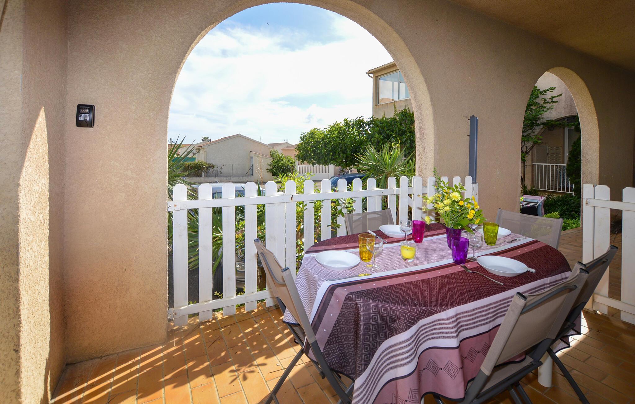 Nyd en solrig strandferie i denne charmerende ferielejlighed med adgang til pool.
