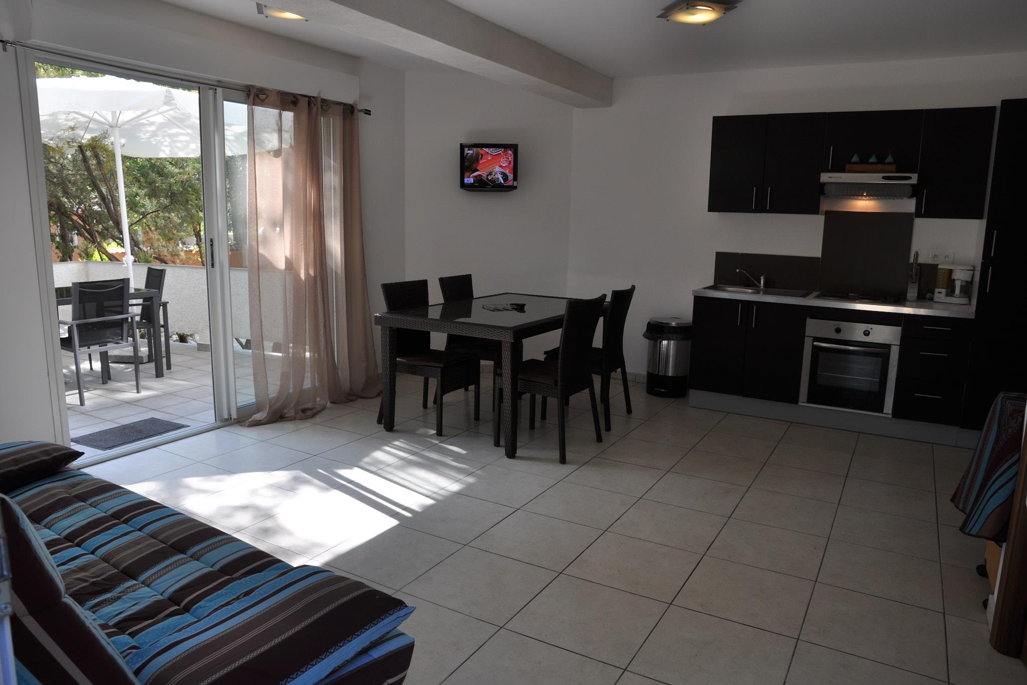 Dette feriehus med 1 soveværelser er et perfekt ophold for strandferier på grund af dens nærhed til stranden. Beliggende i Moriani-Plage, kan det huse en familie på 4. Du kan forfriskes i det varme vejr ved at tage dukkert i den fælles swimmingpool. Du kan gå til byens centrum, 1 km væk, og nyde lækre måltider eller natteliv eller fylde dit spisekammer fra butikkerne der. Sjov ved havet kan nydes 300 m væk ved stranden. Uanset om du ønsker indendørs at være varm eller kølig, har dette hjem aircondition samt opvarmning for at holde dig komfortabel. En møbleret og fælles have med legeredskaber er perfekt for børn at lege. Du kan nyde et spil bordtennis eller piske stormen op i det åbne køkken; valget er dit. Parkering er på stedet. Du kan medbringe 1 kæledyr her for et mindre gebyr. Der er en barneseng til rådighed for et symbolsk gebyr, til din unge. Lufthavnen ligger 25 km væk. Du kan benytte offentlig transport kun 1 km væk. Elprisen betales ved forbrug på stedet.