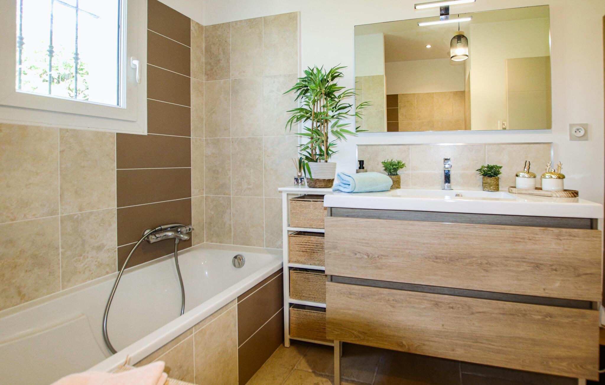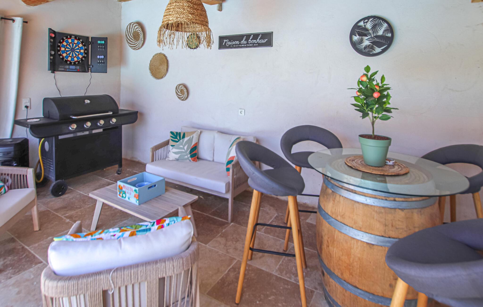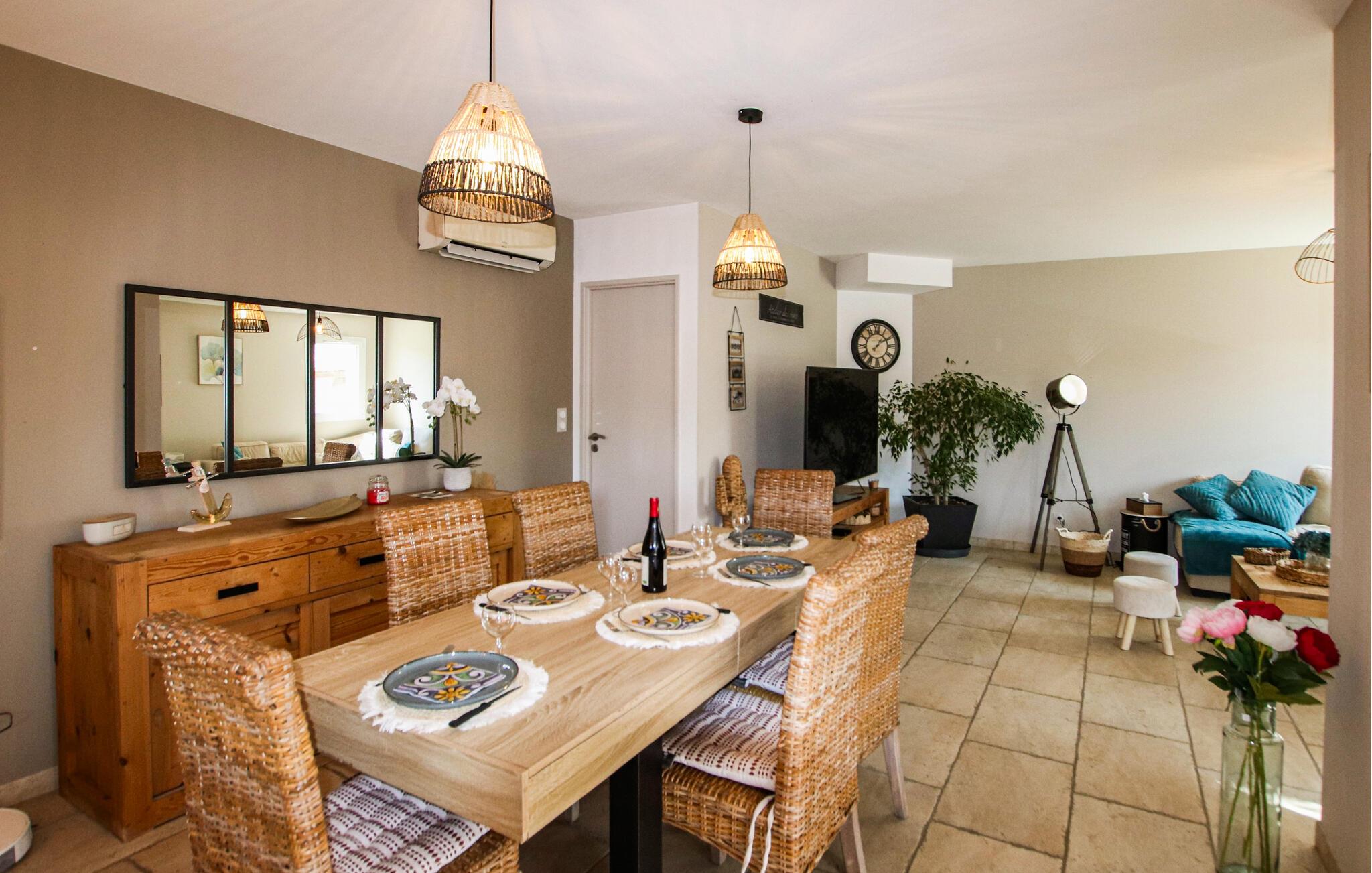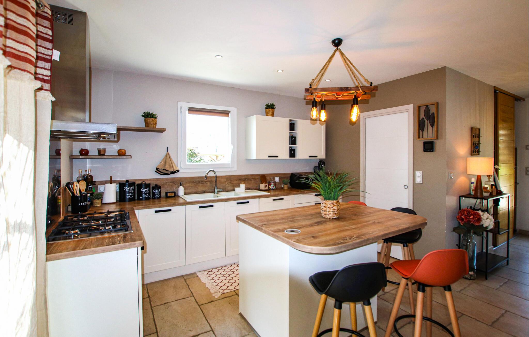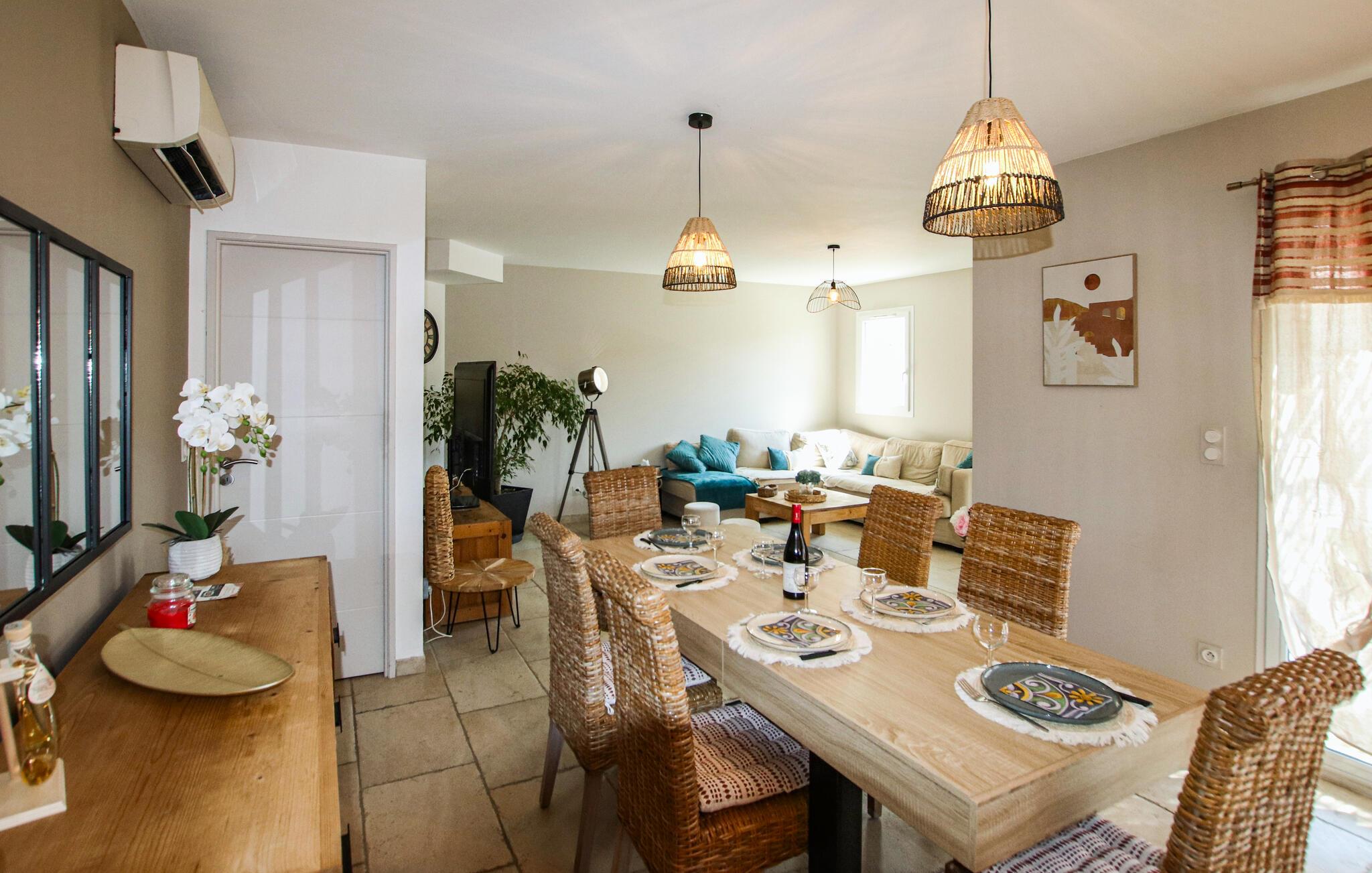 Jeres komfortable feriehus lover afslappende dage i hjertet af Provence. Glæd jer til hyggelige kulinariske oplevelser i det moderne køkken og afslappede måltider med udsigt over haven. Nyd den stilfulde atmosfære i den smagfulde stue og sæt jer til rette i den indbydende sofa til en filmaften.