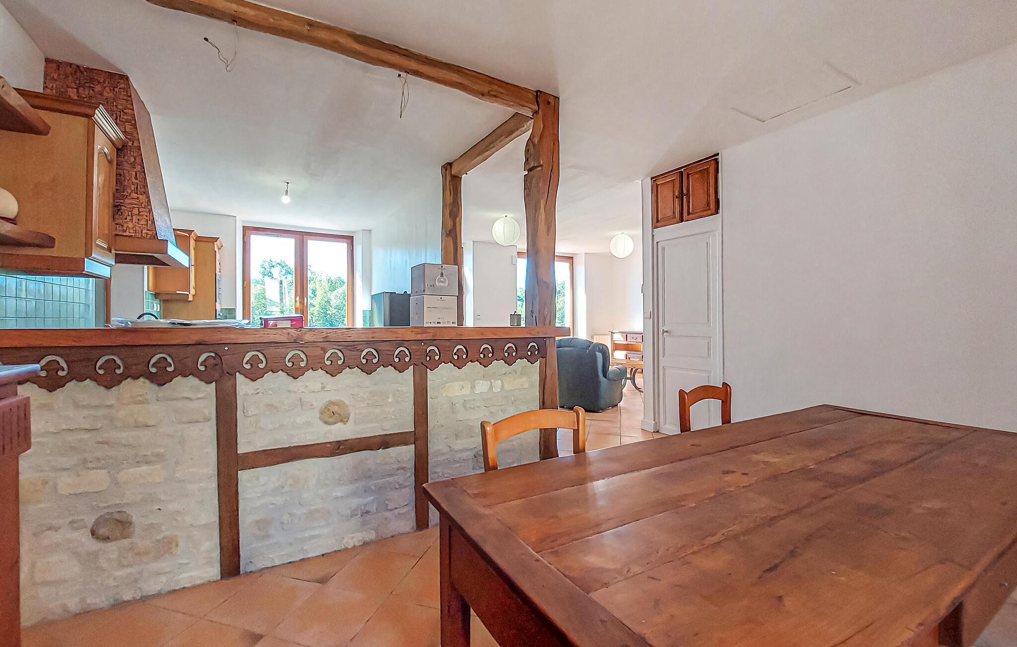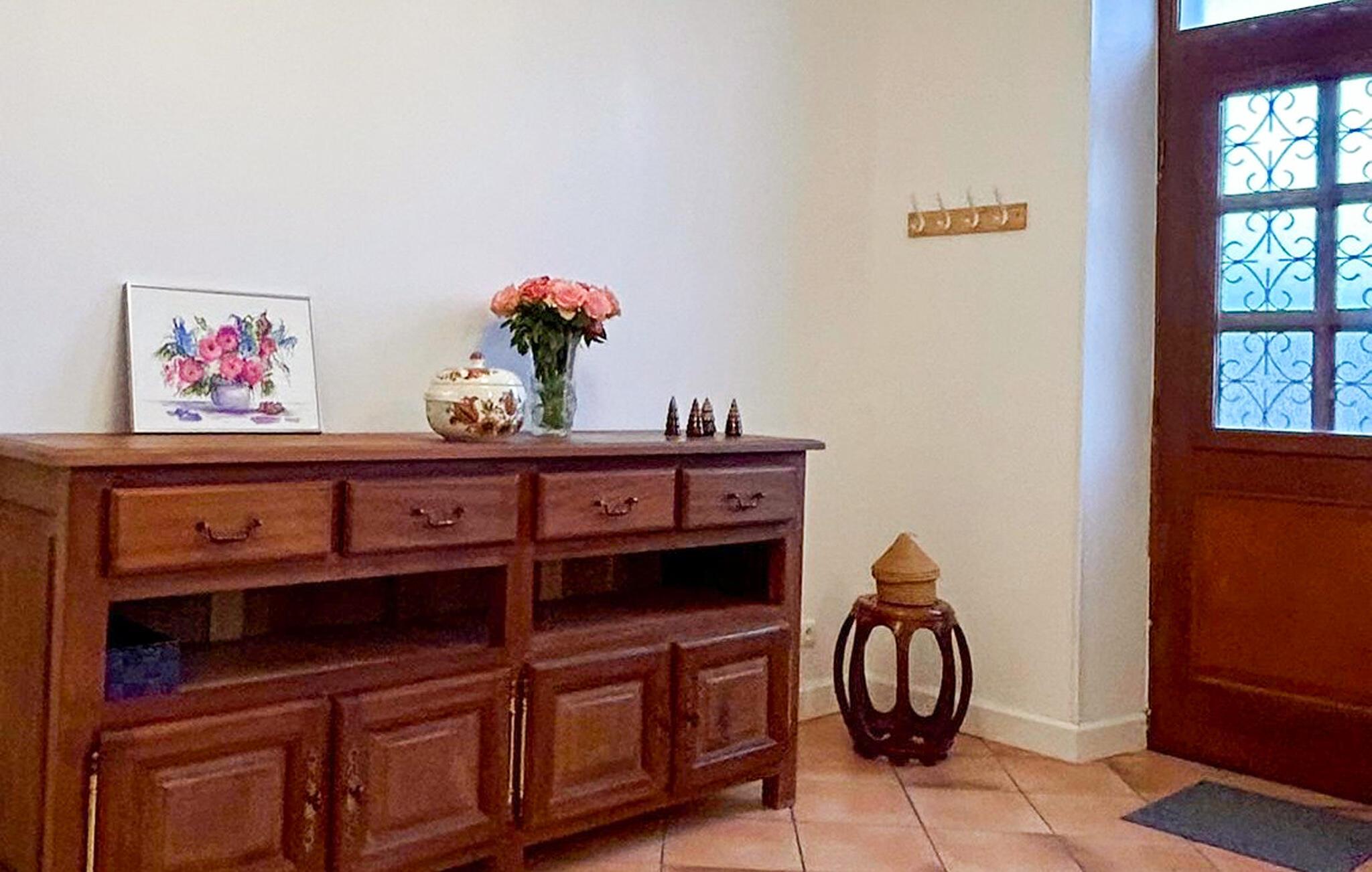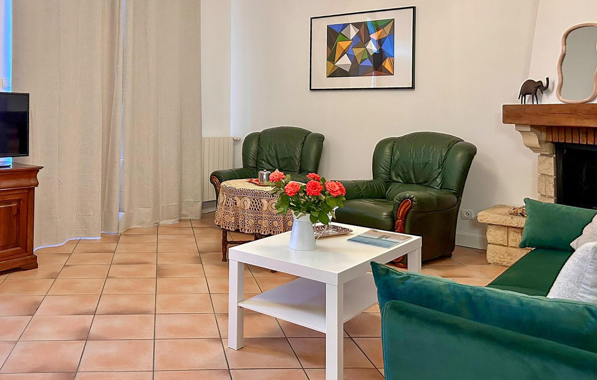 Indenfor finder I en traditionel sydfransk atmosfære med varme terrakottafliser, træbjælker og rustikke møbler. Opholdsstuen med pejs lægger op til hyggelige aftener, mens I i det tilstødende køkken kan lave mad sammen og nyde udsigten over de grønne omgivelser. Lyt til god musik og skænk jer selv et glas vin.