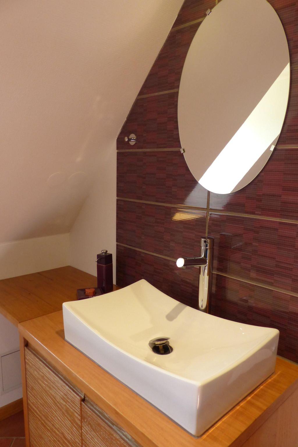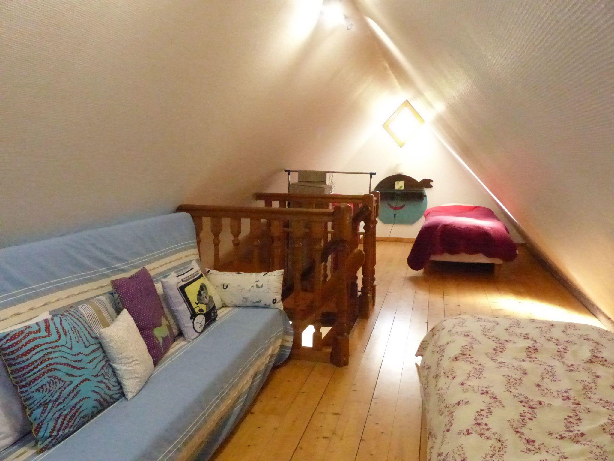 The gite comprises 2 floors: The ground floor, which measures approximately 65 m², comprises the following rooms: a fully-equipped kitchen with cooker, oven, microwave, coffee maker and dining area, opening onto the living room, which includes a lounge with multimedia equipment (flat-screen TV, DVD player, hi-fi system) and a library; an additional relaxation area in an alcove includes a convertible double sofa bed. Next to the kitchen is a bathroom with corner bath, washbasin, WC and washing machine. On the 1st floor, there are two bedrooms: the 1st has a 160 x 200 cm double bed and a wooden cot, and the 2nd has 3 single beds (90 x 200 cm). On the landing, there is a relaxation area and a 2nd shower room with shower, washbasin and WC. In the attic is a 3rd bedroom with a total of 4 single beds (90cm x 200cm), a sofa bed (140cm x 190cm), a changing area and a children's play area. 3 cots are available, as well as all the childcare equipment for the little ones.