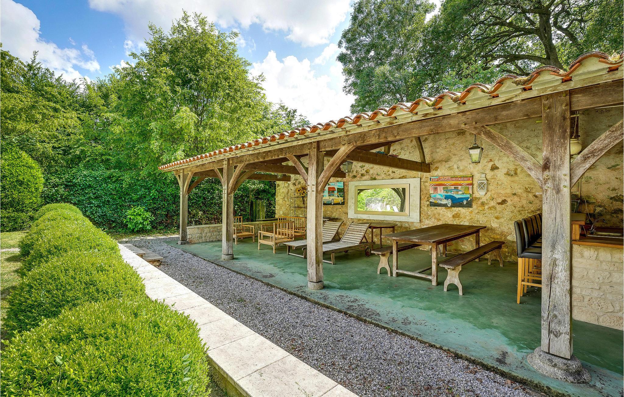 Uden for huset kan I tilbringe hele dage udendørs. Solbad i haven, der er prydet med oleander, oliventræer, palmer, buksbom og lavendel, mens børnene leger glade eller med kolde drikkevarer på terrassen og en smuk udsigt over det omkringliggende grønt, vil afslapningen ikke vente længe på sig.