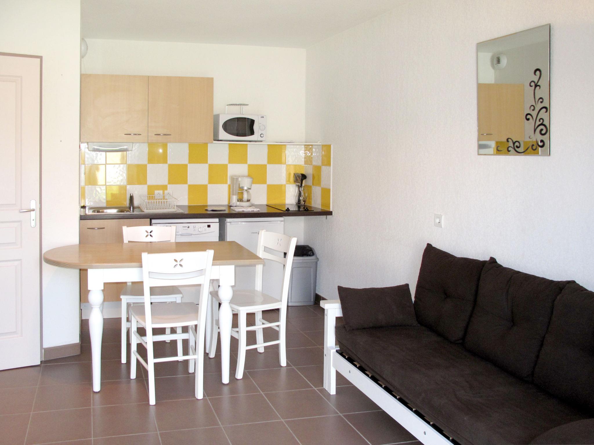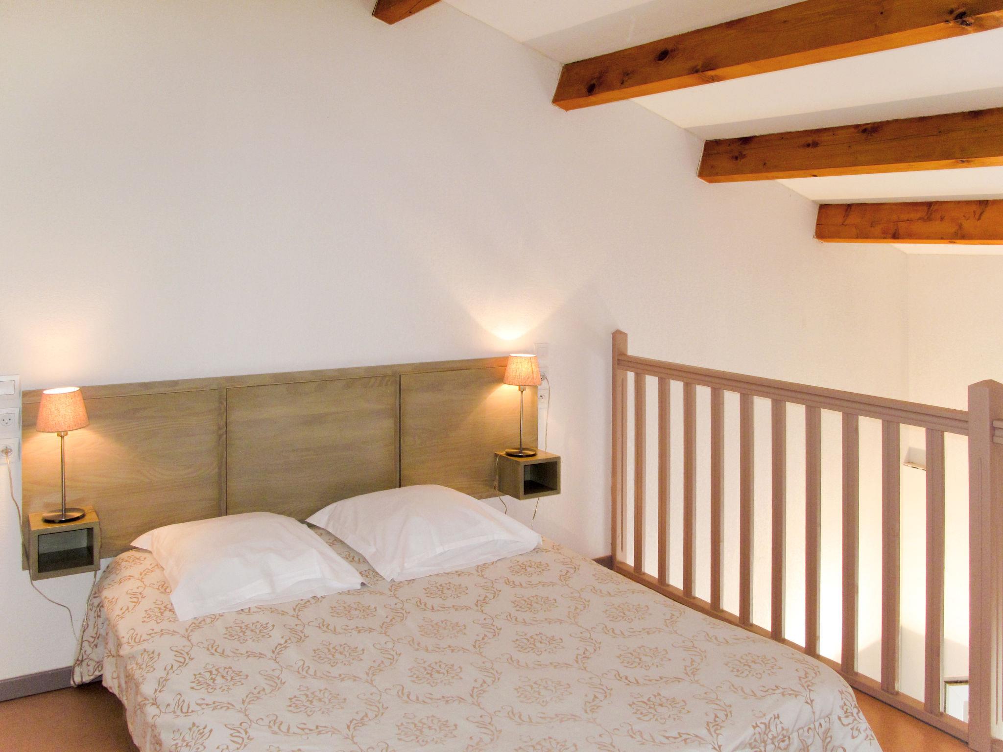 "Domaine d'Ensérune", 1-room terraced house 33 m2 on 2 levels. Object suitable for 2 adults + 2 children. Bright, simple furnishings: living/sleeping room with 1 double sofabed, dining table and TV. Exit to the terrace. Kitchenette (dishwasher, 2 ceramic glass hob hotplates, microwave, electric coffee machine). Bath/WC or shower/WC. Electric heating. Upper floor: open gallery with 1 double bed. Terrace. Terrace furniture. Facilities: Internet (WiFi). Please note: non-smokers only. Maximum 1 pet/ dog allowed. Smoke alarm, fire extinguisher. In some accommodation the WC may be separate. Maximum occupancy: 2 adults and 2 children up to 14 years. Instead of an enclosed bedroom, some sleeping areas are located in an open-plan area (gallery, alcove, etc.).