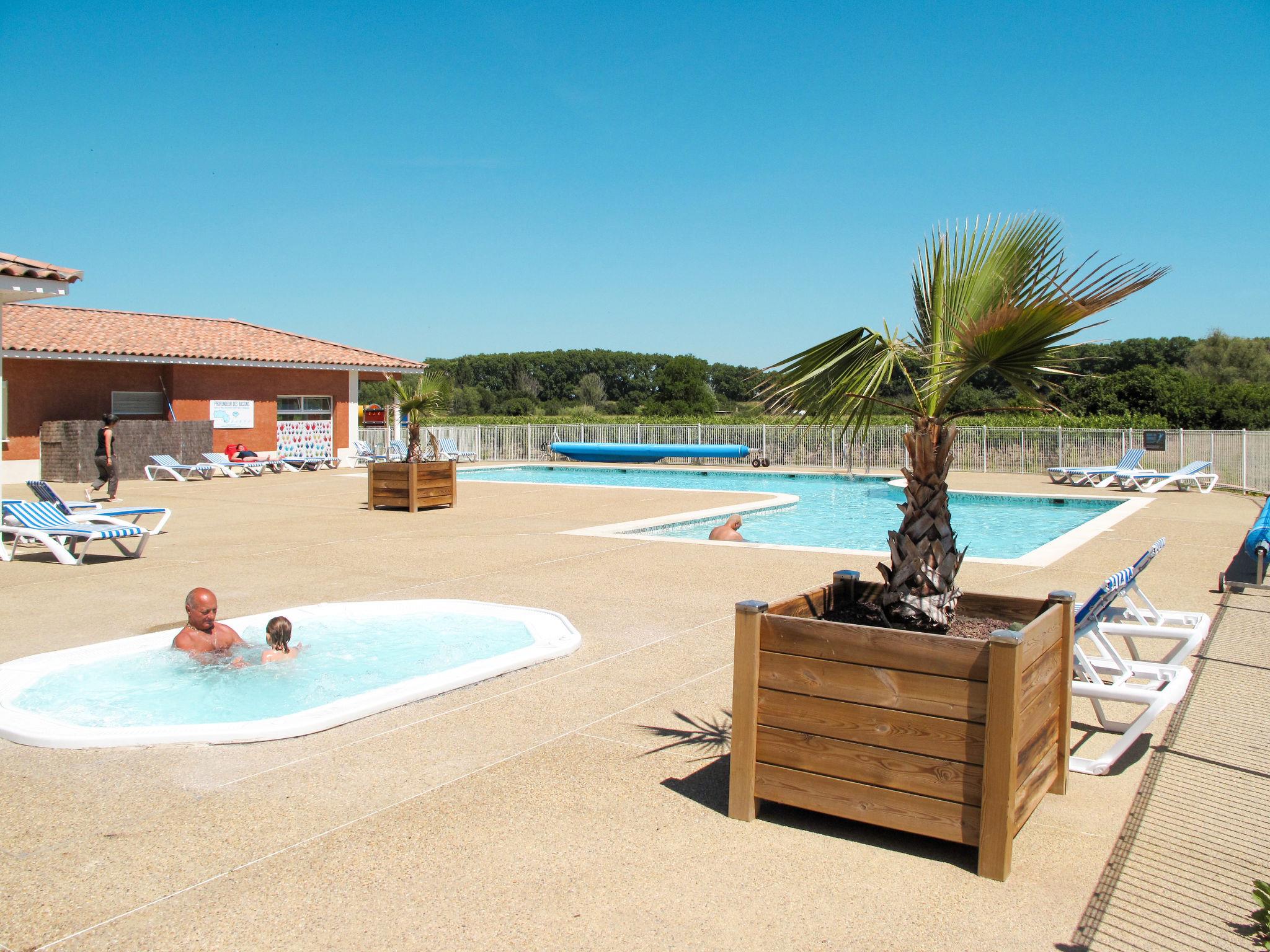 Resort "Domaine d'Ensérune". 98 houses in the residence. 3 km from the centre of Nissan-lèz-Ensérune, 800 m from the centre of Colombiers, 10 km from the centre of Béziers, 300 m from the canal. For shared use: swimming pool fenced (130 m2, depth 40 - 150 cm, seasonal availability: 03.May. - 30.Sep.). Boccia, terrace, children's playground. In the complex: reception, WiFi, sauna (extra). Fitness room, steam room (extra). Washing machine, tumble dryer (for shared use, extra). Breakfast (extra). Parking (limited number of spaces). Shop, grocery 800 m, supermarket 3 km, bakery 800 m, bus stop 4.8 km. Please note: entertainment in the season. The photograph shows a typical example. The holiday properties may differ in living space, floorplan, equipment and furnishing. No access to the steam bath and sauna for persons under 18 years.