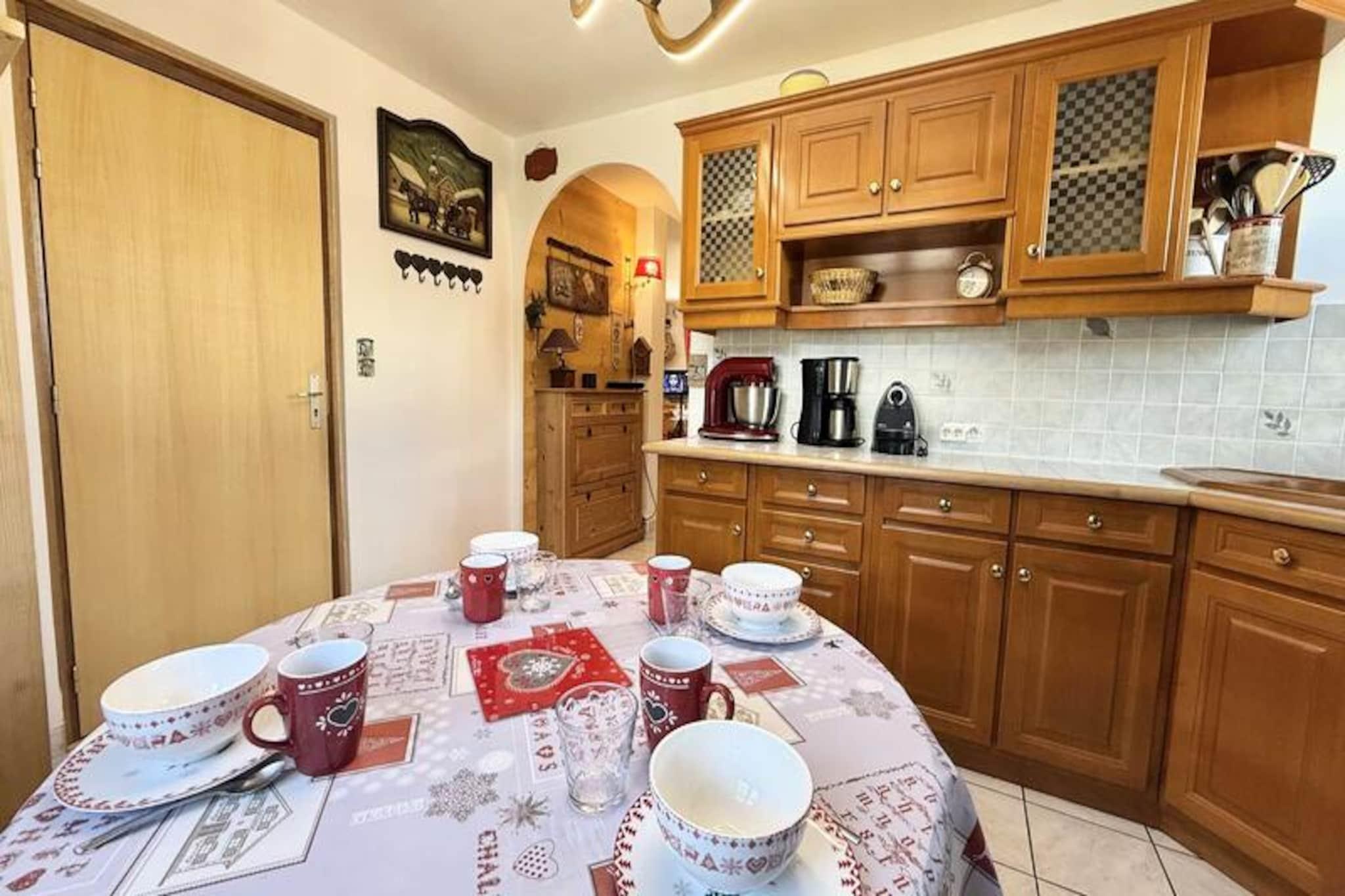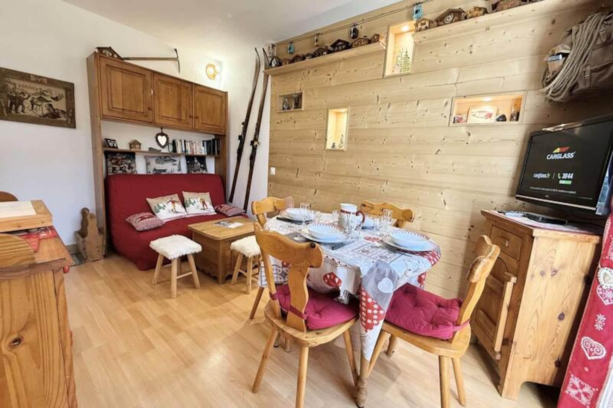 Midt i den fredfyldte charme i Notre-Dame-de-Bellecombe inviterer denne hyggelige lejlighed i stueetagen dig til at opleve den perfekte alpine getaway. Forestil dig at vågne op til frisk bjergluft, med landsbyens centrum kun 20 meter væk og skiløjperne blot 300 meter fra din dørtrin. Uanset om du er her for vintereventyr eller sommerro, tilbyder denne ejendom en harmonisk blanding af bekvemmelighed og komfort i hjertet af de franske alper. \n\nLejligheden er på 43 m² og er omhyggeligt designet til at rumme op til seks gæster. Den har et fuldt udstyret køkken med spisebord, en varm og indbydende stue med en sovesofa og to soveværelser - et med en dobbeltseng og et andet med køjesenge (øverste køjeseng er ikke egnet til børn under seks år). Et moderne brusebad og separat toilet fuldender planløsningen og sikrer praktisk anvendelighed for familier eller små grupper. Yderligere faciliteter inkluderer en reserveret udendørs parkeringsplads og et skiopbevaringsområde, hvilket gør det nemt at skifte fra hyggelige morgener indendørs til spændende dage på pisterne. Notre-Dame-de-Bellecombe tilbyder en perfekt alpin oplevelse med lokale butikker, restauranter og ESF-skiskolen i Le Reguet inden for gåafstand. Om vinteren lover de nærliggende pister spændende skiløjper, mens sommeren byder på frodige stier, der er perfekte til vandreture og cykling. Den omkringliggende region er rig på naturlig skønhed med betagende udsigter og muligheder for udendørs udforskning. Uanset om du søger eventyr eller afslapning, er denne lejlighed din port til uforglemmelige øjeblikke i Alperne. Med sin førsteklasses beliggenhed og indbydende atmosfære er det det ideelle tilflugtssted til at skabe dyrebare minder året rundt.