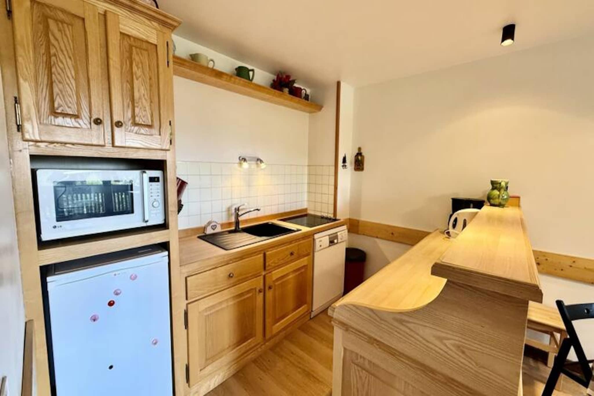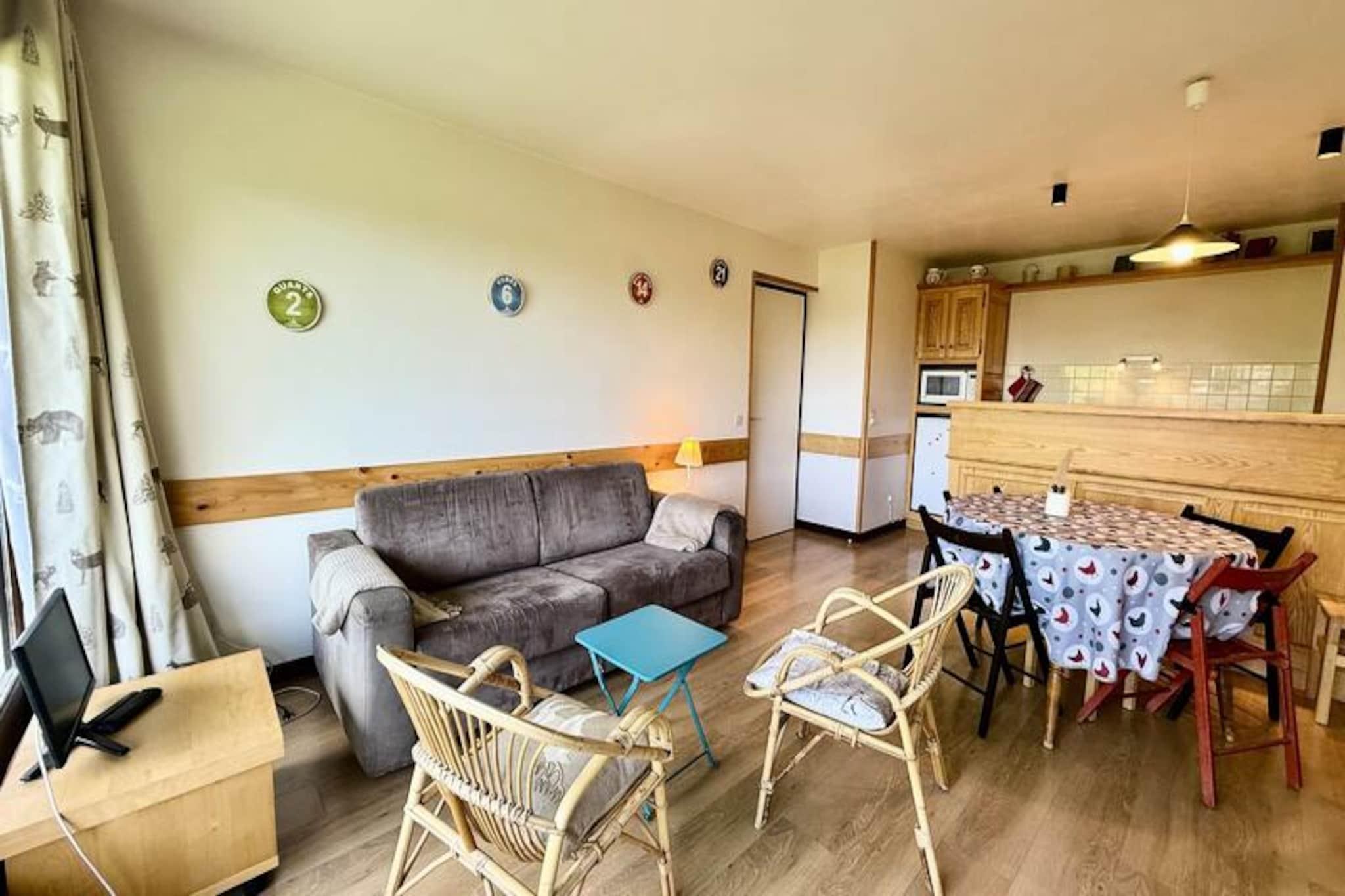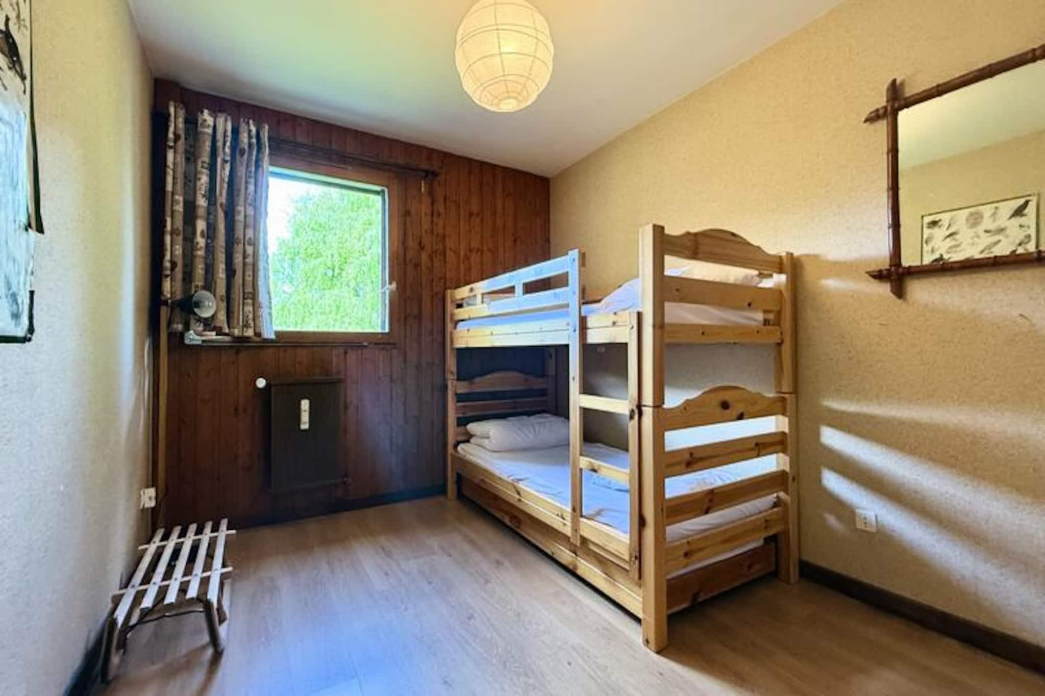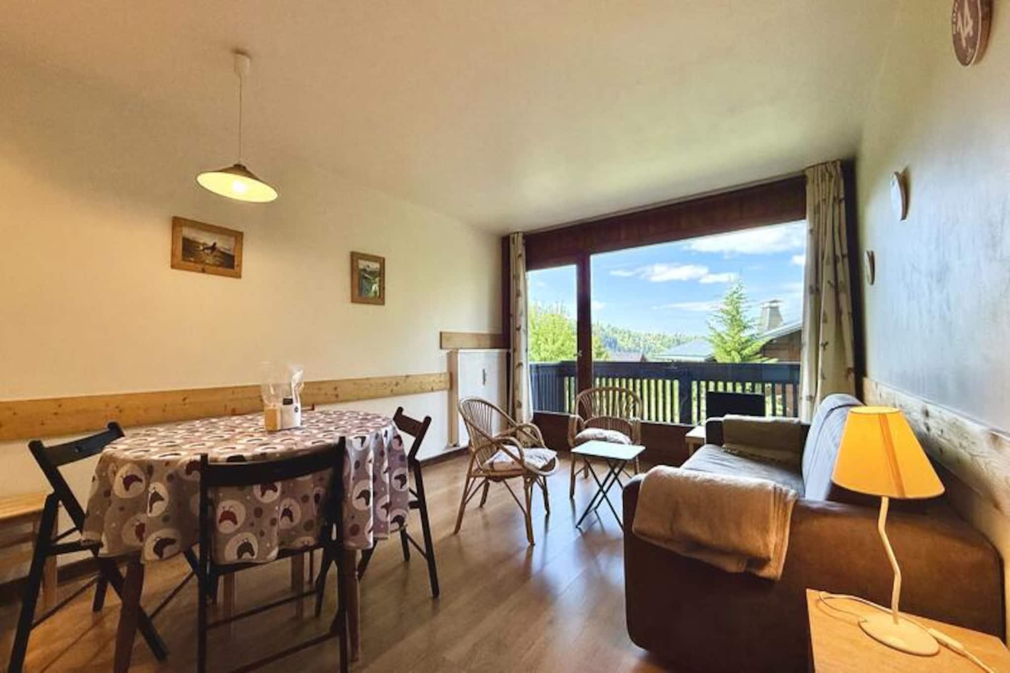 I hjertet af den fortryllende Savoyard-landsby Notre Dame de Bellecombe tilbyder denne indbydende lejlighed en rolig oase omgivet af Alpernes majestætiske skønhed. Med sin sydvendte balkon med udsigt over L'Etale er hvert øjeblik her badet i naturligt lys og indrammet af en betagende udsigt over bjergene. Uanset om du søger spændende vintersport eller rolige sommereventyr, er denne charmerende bolig din port til vidunderne i Espace Diamant skiområdet og videre. \n\nLejligheden ligger på første sal i Les Mousquetaires-boligen og er omhyggeligt designet til komfort og bekvemmelighed. Stuen, komplet med et hyggeligt tv-hjørne, åbner op til et fuldt udstyret køkken med keramisk kogeplade, opvaskemaskine, mikrobølgeovn og køleskab. Ideel til familier, omfatter sovepladserne et soveværelse med enkeltkøjesenge og en udtræksseng samt en dobbeltsovesofa i stuen. Badeværelset har et badekar til afslappende bad efter en dag på pisterne, og rigelig opbevaringsplads sikrer et ryddeligt ophold. \n\nTræd udenfor og oplev landsbyens pulserende centrum, kun en kort gåtur væk. Fra hyggelige butikker og lokale restauranter til skilifter og underholdning er alt hvad du behøver inden for rækkevidde. Om sommeren kan du udforske naturskønne vandrestier, mountainbikeruter og den nærliggende Flumet-sø til svømning og vandsport. Mont Rond-stoleliften, der er åben flere dage om ugen, tilbyder panoramaudsigt over Mont Blanc, hvilket gør den til et must-see for naturelskere. \n\nMed sin blanding af alpin charme, moderne faciliteter og uovertruffen beliggenhed lover denne lejlighed uforglemmelige minder i enhver sæson. Uanset om du står på ski ned ad uberørte pister eller soler dig i sommersolen, inviterer Notre Dame de Bellecombe dig til at opleve bjergenes magi.