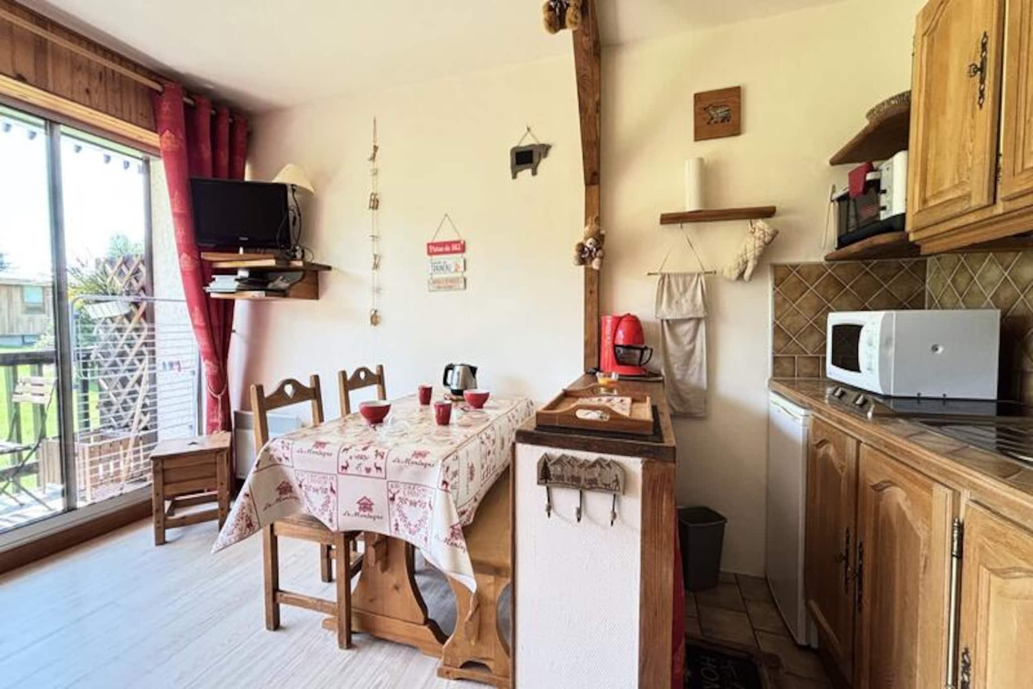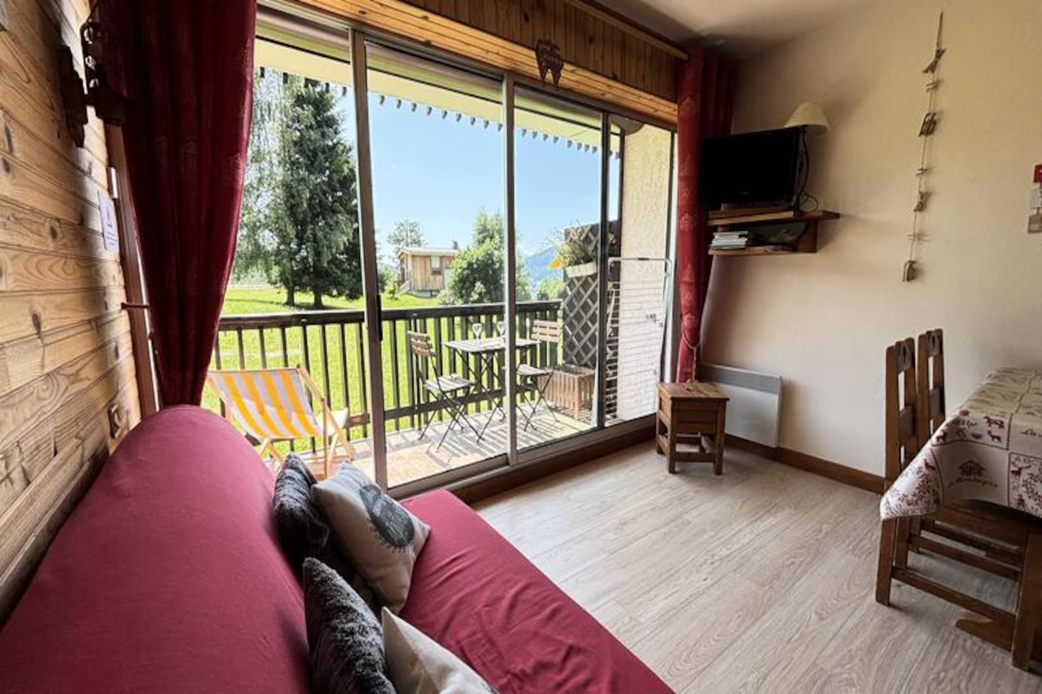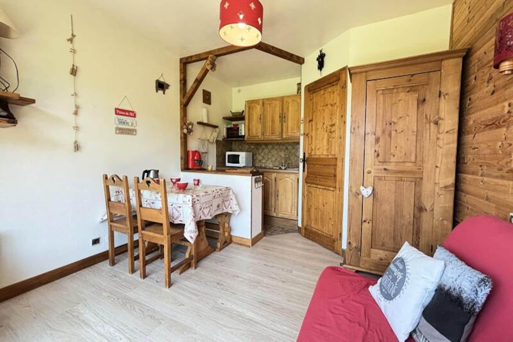 Midt i det betagende alpine landskab i Notre Dame de Bellecombe tilbyder denne charmerende studiolejlighed i Les Alpages-residensen et idyllisk tilflugtssted for både vinter- og sommerferier. Forestil dig at vågne op til uhindret udsigt over Mont Charvin fra din sydvendte balkon, hvor solen pryder dine morgener og eftermiddage. Beliggende ved foden af ??skiområdet Espace Diamant har du problemfri adgang til 192 km sammenhængende pister, der henvender sig til skiløbere på alle niveauer. Landsbyens autentiske savoyard-charme og indbydende atmosfære gør den til en perfekt destination for at skabe uforglemmelige minder. \n\nDenne studiolejlighed i stueetagen er designet med effektivitet og komfort i tankerne og har plads til op til fire gæster. Sovelkoven har en hyggelig køjeseng, mens opholdsstuen har en sovesofa og åbner ud til den solrige balkon. Et kompakt, men fuldt udstyret køkken med køleskab, mikrobølgeovn og induktionskogeplade sikrer, at du nemt kan tilberede måltider. Efter en dag med alpine eventyr kan du slappe af i det lyse og gennemtænkte rum, komplet med et fjernsyn til afslappede aftener. Lejligheden tilbyder også praktiske faciliteter såsom et skirum og fælles parkering, hvilket gør dit ophold problemfrit.\n\nUd over pisterne forvandles Notre Dame de Bellecombe til et sommerparadis med en privat swimmingpool og tennisbane eksklusivt for beboerne. Udforsk de mange vandre- og cykelstier, der snor sig gennem det uberørte landskab, eller tag Mont Rond-stoleliften for at nyde panoramaudsigten over Mont Blanc. Landsbyens centrum, kun få skridt væk, giver nem adgang til butikker, restauranter og aktiviteter, hvilket sikrer, at alt hvad du behøver er inden for rækkevidde.\n\nUanset om du søger spændende skidage, rolige bjergvandringer eller blot et fredeligt tilflugtssted omgivet af fantastisk natur, er denne lejlighed din port til det bedste af Alperne. Med nærliggende attraktioner som Megève, Chamonix og Annecy byder hver dag på nye muligheder for udforskning og eventyr.