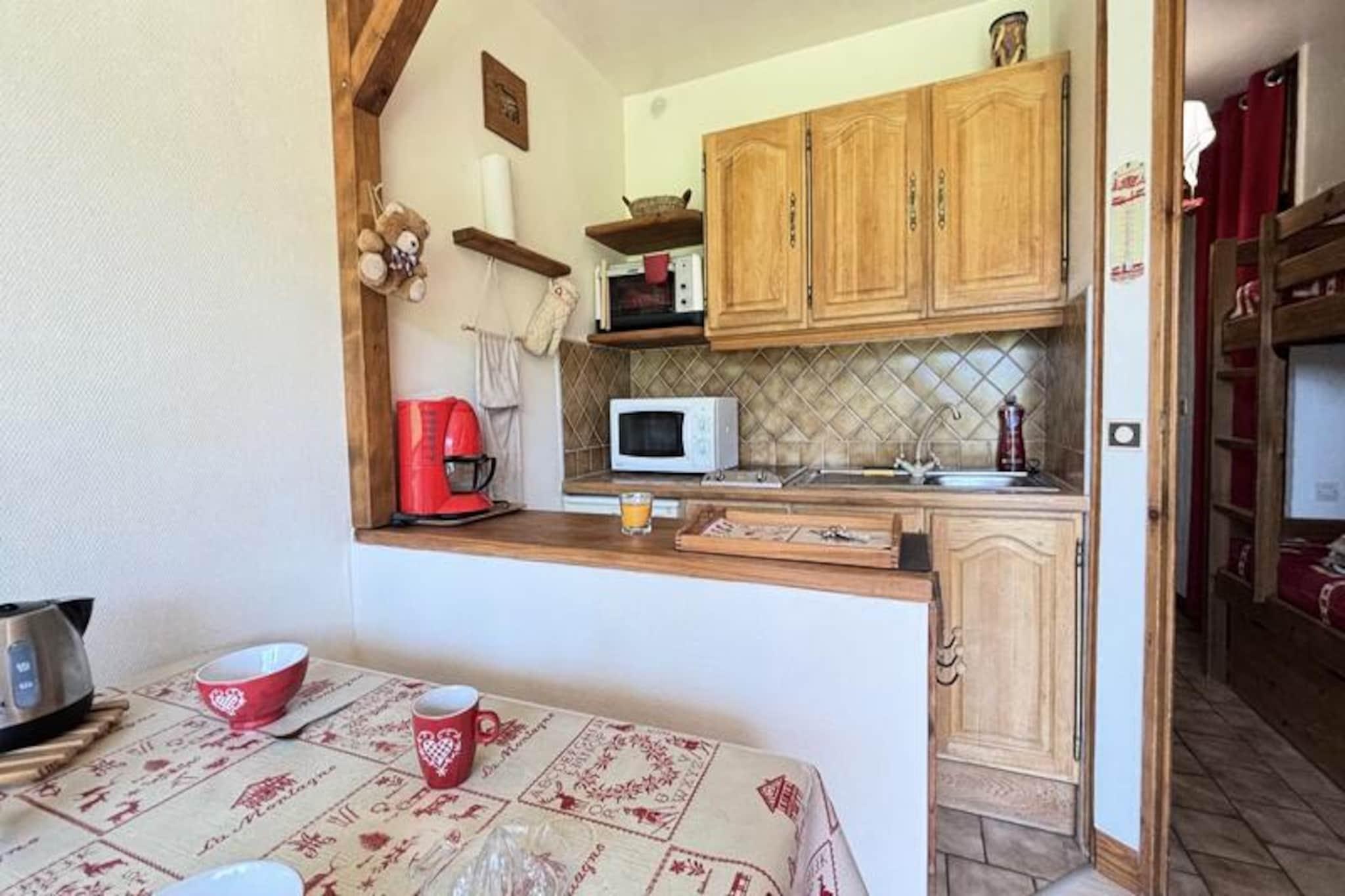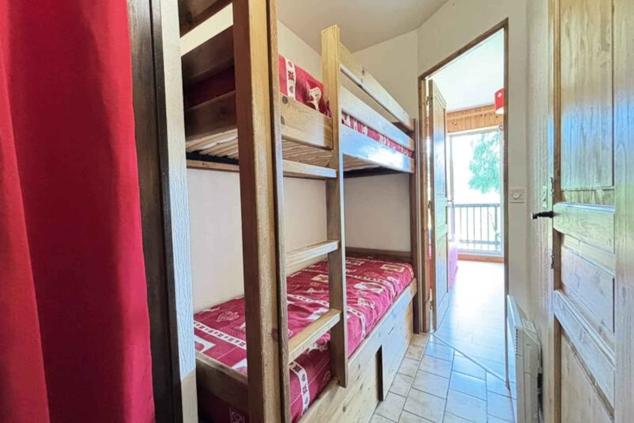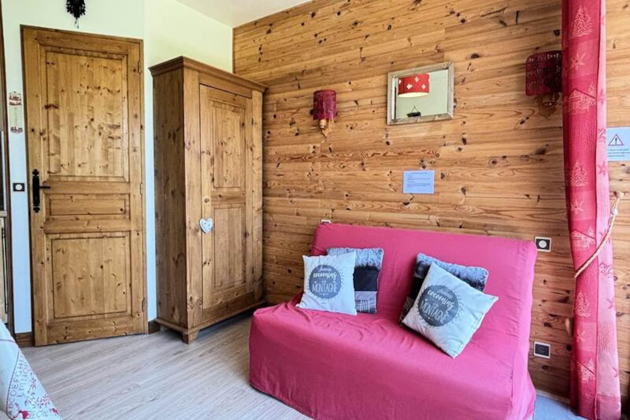 Midt i det betagende alpine landskab i Notre Dame de Bellecombe tilbyder denne charmerende studiolejlighed i Les Alpages-residensen et idyllisk tilflugtssted for både vinter- og sommerferier. Forestil dig at vågne op til uhindret udsigt over Mont Charvin fra din sydvendte balkon, hvor solen pryder dine morgener og eftermiddage. Beliggende ved foden af ??skiområdet Espace Diamant har du problemfri adgang til 192 km sammenhængende pister, der henvender sig til skiløbere på alle niveauer. Landsbyens autentiske savoyard-charme og indbydende atmosfære gør den til en perfekt destination for at skabe uforglemmelige minder. \n\nDenne studiolejlighed i stueetagen er designet med effektivitet og komfort i tankerne og har plads til op til fire gæster. Sovelkoven har en hyggelig køjeseng, mens opholdsstuen har en sovesofa og åbner ud til den solrige balkon. Et kompakt, men fuldt udstyret køkken med køleskab, mikrobølgeovn og induktionskogeplade sikrer, at du nemt kan tilberede måltider. Efter en dag med alpine eventyr kan du slappe af i det lyse og gennemtænkte rum, komplet med et fjernsyn til afslappede aftener. Lejligheden tilbyder også praktiske faciliteter såsom et skirum og fælles parkering, hvilket gør dit ophold problemfrit.\n\nUd over pisterne forvandles Notre Dame de Bellecombe til et sommerparadis med en privat swimmingpool og tennisbane eksklusivt for beboerne. Udforsk de mange vandre- og cykelstier, der snor sig gennem det uberørte landskab, eller tag Mont Rond-stoleliften for at nyde panoramaudsigten over Mont Blanc. Landsbyens centrum, kun få skridt væk, giver nem adgang til butikker, restauranter og aktiviteter, hvilket sikrer, at alt hvad du behøver er inden for rækkevidde.\n\nUanset om du søger spændende skidage, rolige bjergvandringer eller blot et fredeligt tilflugtssted omgivet af fantastisk natur, er denne lejlighed din port til det bedste af Alperne. Med nærliggende attraktioner som Megève, Chamonix og Annecy byder hver dag på nye muligheder for udforskning og eventyr.