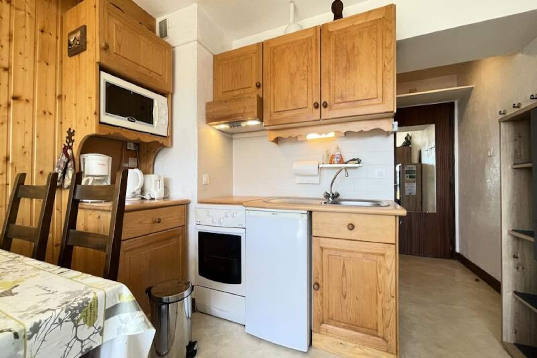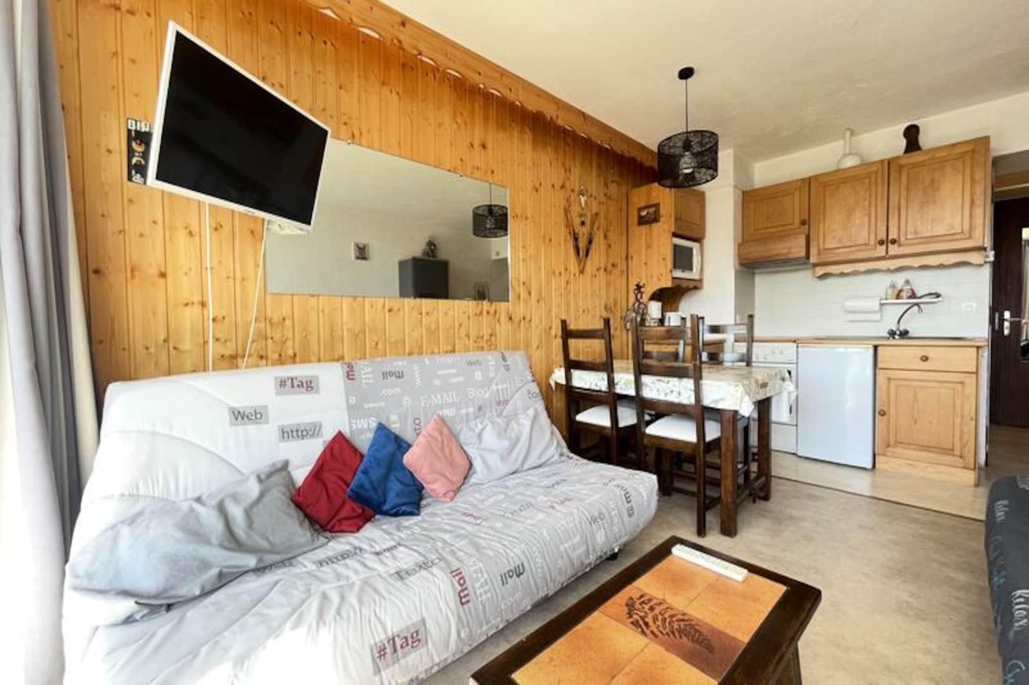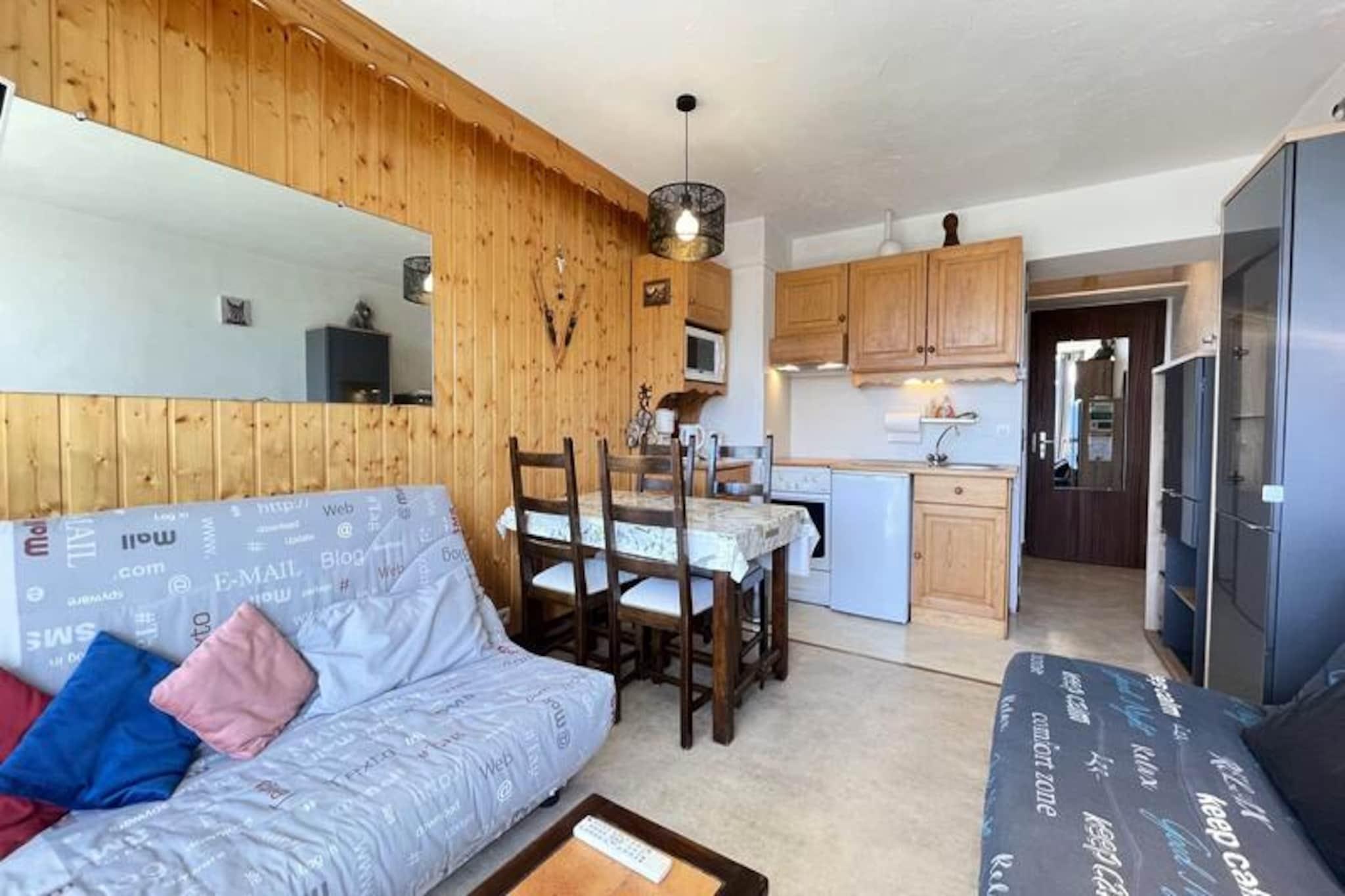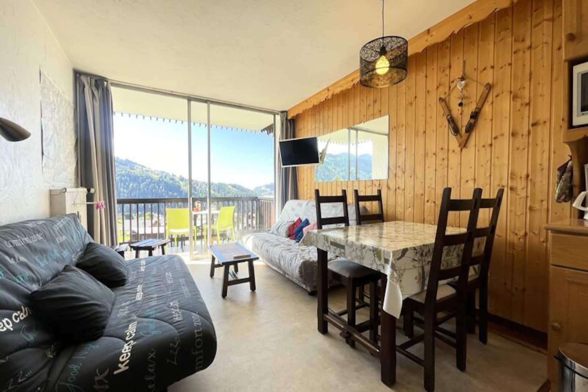 I den maleriske landsby Notre Dame de Bellecombe tilbyder dette charmerende studie i Les Alpages-residensen et hyggeligt alpint tilflugtssted med betagende udsigt over Mont Charvin og den omkringliggende dal. Beliggende ved foden af ??skiområdet Espace Diamant tilbyder det uovertruffen adgang til 192 km sammenhængende pister, hvilket gør det til et paradis for skiløbere på alle niveauer. Skiskolen ligger kun 50 meter væk, hvilket sikrer bekvemmelighed for begyndere og familier. Selve landsbyen, kendt for sin varme Savoyard-charme, er den perfekte base for at udforske Alpernes uberørte skønhed. \n\nStudioet, der ligger på syvende sal, er badet i naturligt lys takket være det store karnapvindue og den sydvendte balkon. Med et areal på 24 m² har det en stue med to komfortable dobbeltsovesofaer, et fladskærms-tv og et åbent køkken udstyret med keramiske kogeplader, ovn, køleskab og mikrobølgeovn. Badeværelset har bruser og toilet, hvilket sikrer alle de nødvendige faciliteter til et behageligt ophold. Yderligere faciliteter såsom et skirum, elevatoradgang og ureserveret udendørs parkering bidrager til bekvemmeligheden. Om sommeren forvandles boligen til et afslappende paradis med en privat udendørs swimmingpool og tennisbane. Talrige vandre- og mountainbike-stier starter i nærheden, og Mont Rond-stoleliften tilbyder en spektakulær udsigt over Mont Blanc. Til dagsture ligger de charmerende byer Megève, Chamonix og Annecy alle inden for en times kørsel og tilbyder en blanding af kultur, gastronomi og en fantastisk natur. Uanset om du søger en romantisk ferie eller et familieeventyr, tilbyder denne studiolejlighed den perfekte blanding af komfort, bekvemmelighed og alpin charme. Med sin idylliske beliggenhed og aktiviteter året rundt lover den en uforglemmelig flugt i hjertet af de franske alper.