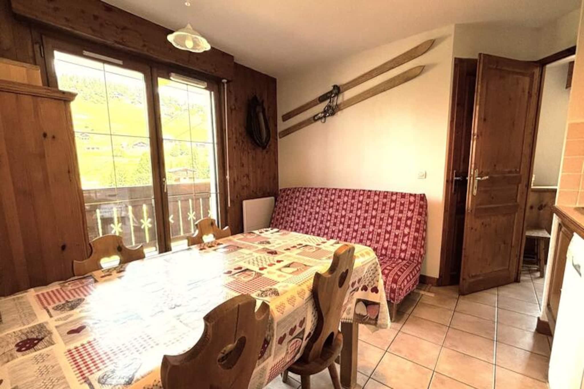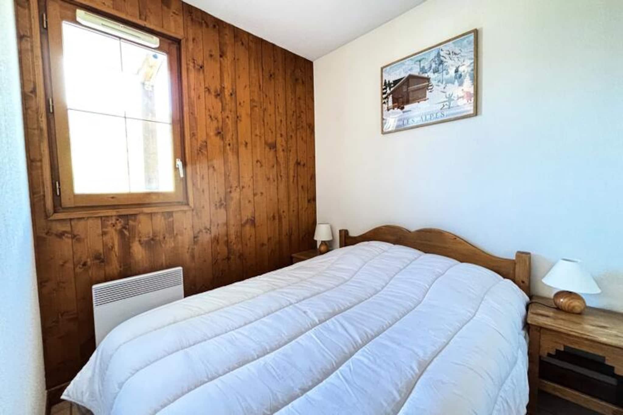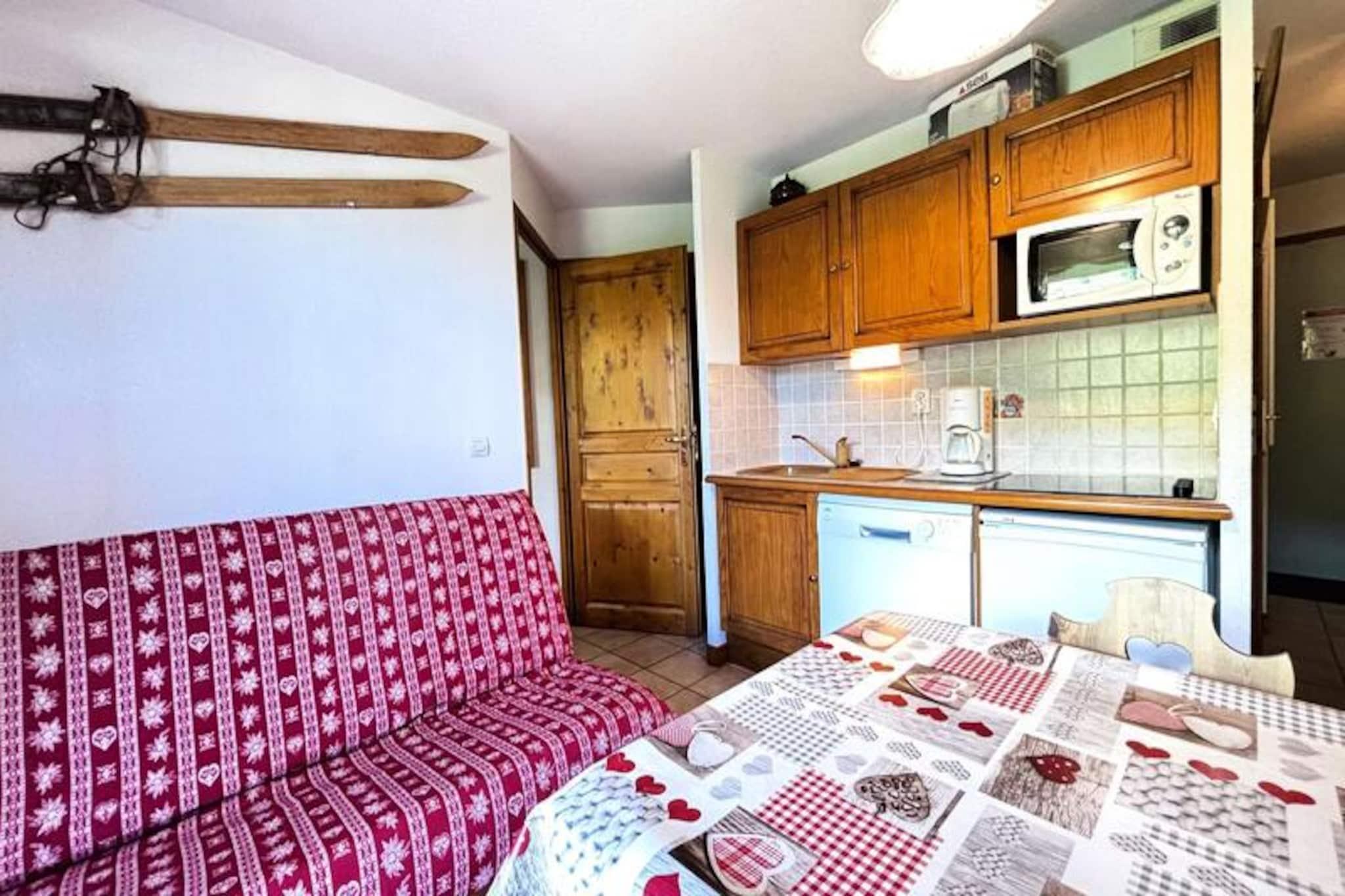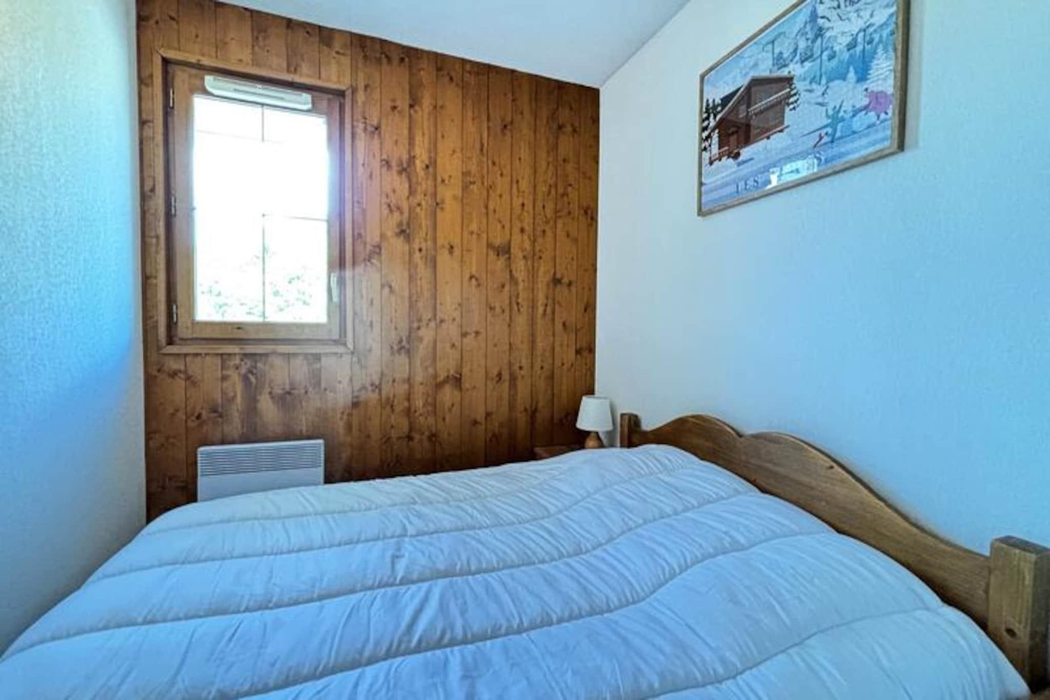 Midt i de franske alpers betagende landskab tilbyder denne charmerende lejlighed i Les Oursons-residensen et hyggeligt tilflugtssted ved foden af ??Espace Diamant-skiløjperne. Med direkte adgang til 192 km sammenhængende pister, der spænder over seks maleriske landsbyresorts, herunder Notre Dame de Bellecombe, Flumet og Les Saisies, er det en drømmedestination for skiløbere på alle niveauer. Uanset om du carver gennem puddersne eller nyder blide pister, skaber den familievenlige atmosfære og den fantastiske alpine udsigt en uforglemmelig vinterferie. Residensen er bekvemt placeret i nærheden af ??skiskolen, hvilket gør den ideel for både familier og begyndere.\n\nIndvendigt er lejligheden omhyggeligt designet til komfort og praktisk anvendelighed. Den har plads til op til seks gæster og har to soveværelser - et med en dobbeltseng og et andet med køjesenge - samt en sovesofa i stuen. Det åbne køkken er fuldt udstyret med keramisk kogeplade, køleskab, mikrobølgeovn og opvaskemaskine, hvilket sikrer, at du har alt, hvad du behøver for at tilberede solide måltider efter en dag på pisterne. Moderne bekvemmeligheder som Wi-Fi, fladskærms-tv og en privat, lukket garage bidrager til bekvemmeligheden, mens skiboksen holder dit udstyr organiseret.\n\nUd over skiløb forvandles regionen til et paradis for friluftsentusiaster i sommermånederne. Udforsk naturskønne vandrestier, mountainbikeruter, eller tag Mont Rond-stoleliften for at nyde panoramaudsigten over Mont Blanc. For en afslappende dag ude ligger Flumet-søen og fritidscentret kun 7 km væk og tilbyder familievenlige aktiviteter i rolige omgivelser. Med ladestationer til elbiler tilgængelige i hele Val d'Arly-landsbyerne, herunder Notre Dame de Bellecombe, er dit ophold både miljøvenligt og problemfrit.\n\nUanset om du søger spændende alpine eventyr eller rolige øjeblikke i naturen, er denne lejlighed den perfekte base for at opdage de franske alpers skønhed og charme året rundt.