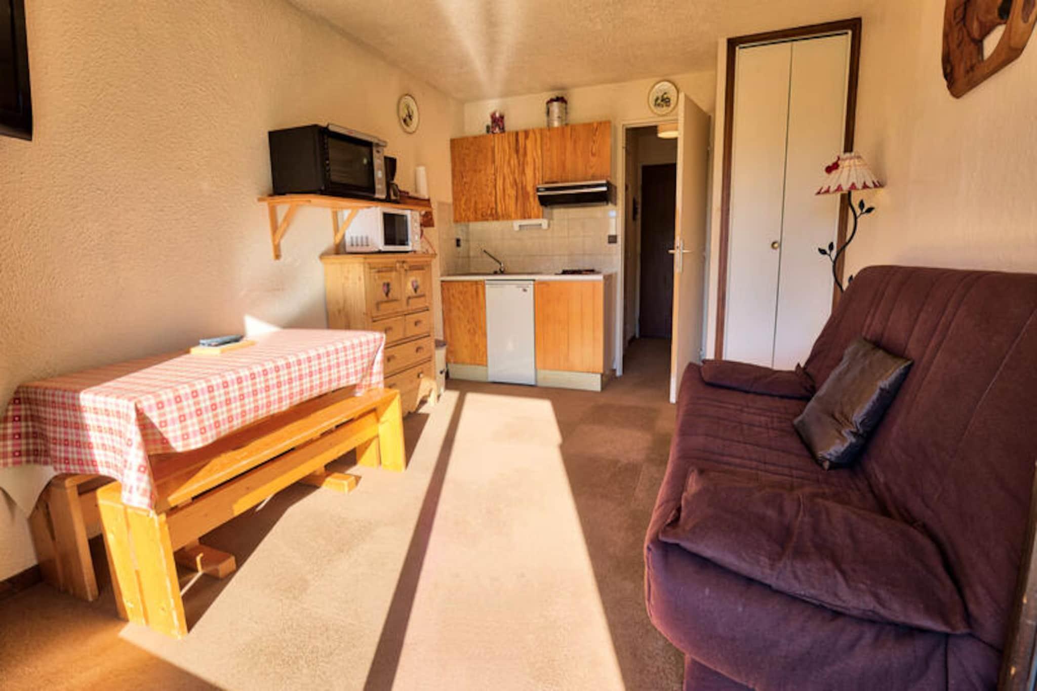 I den maleriske landsby Notre Dame de Bellecombe, hvor charmen ved det traditionelle savoyiske liv møder spændingen ved alpine eventyr, tilbyder denne hyggelige studiolejlighed i Le Chambet-residensen en idyllisk tilflugtssted. Forestil dig at vågne op til den majestætiske udsigt over Mont Charvin fra din sydvestvendte haveterrasse, hvor den friske bjergluft indbyder dig til at udforske Alpernes vidundere. Uanset om du er her for de snedækkede skråninger eller de frodige sommerstier, er dette fristed din indgang til uforglemmelige minder. Studiet på 20 m² er omhyggeligt designet til at rumme op til fire gæster, hvilket gør det perfekt til familier eller nære venner. Det åbne køkken og opholdsstue er udstyret med alt det nødvendige, herunder en miniovn, mikroovn og fladskærms-tv, hvilket sikrer et behageligt ophold. Sovepladserne omfatter en hyggelig alkove med køjesenge og en dobbelt sovesofa i stuen, alt sammen suppleret med dyner og tæpper for en god nats søvn. Badeværelset har badekar, der er ideelt til afslapning efter en dag fuld af eventyr. Med et skiskab og uforbeholdt udendørs parkering er bekvemmeligheden lige ved hånden. Beliggende kun 300 meter fra Espace Diamant-skiområdet og 400 meter fra landsbyens centrum har du nem adgang til 192 km sammenhængende pister, der strækker sig over seks charmerende resorts. Om sommeren kan du udforske de nærliggende vandre- og cykelstier eller tage Mont Rond-stoleliften for at nyde den betagende udsigt over Mont Blanc. For en forfriskende pause ligger Flumet-søen kun 4 km væk. Oplev nærliggende perler som Megève, Chamonix og Annecy, som alle ligger inden for en times kørsel. Med sin indbydende atmosfære, førsteklasses beliggenhed og fantastiske omgivelser er denne studiolejlighed det perfekte udgangspunkt for din alpine ferie. Uanset om du står på ski, vandrer eller blot nyder Alpernes skønhed, lover Le Chambet et ophold fyldt med glæde og afslapning.