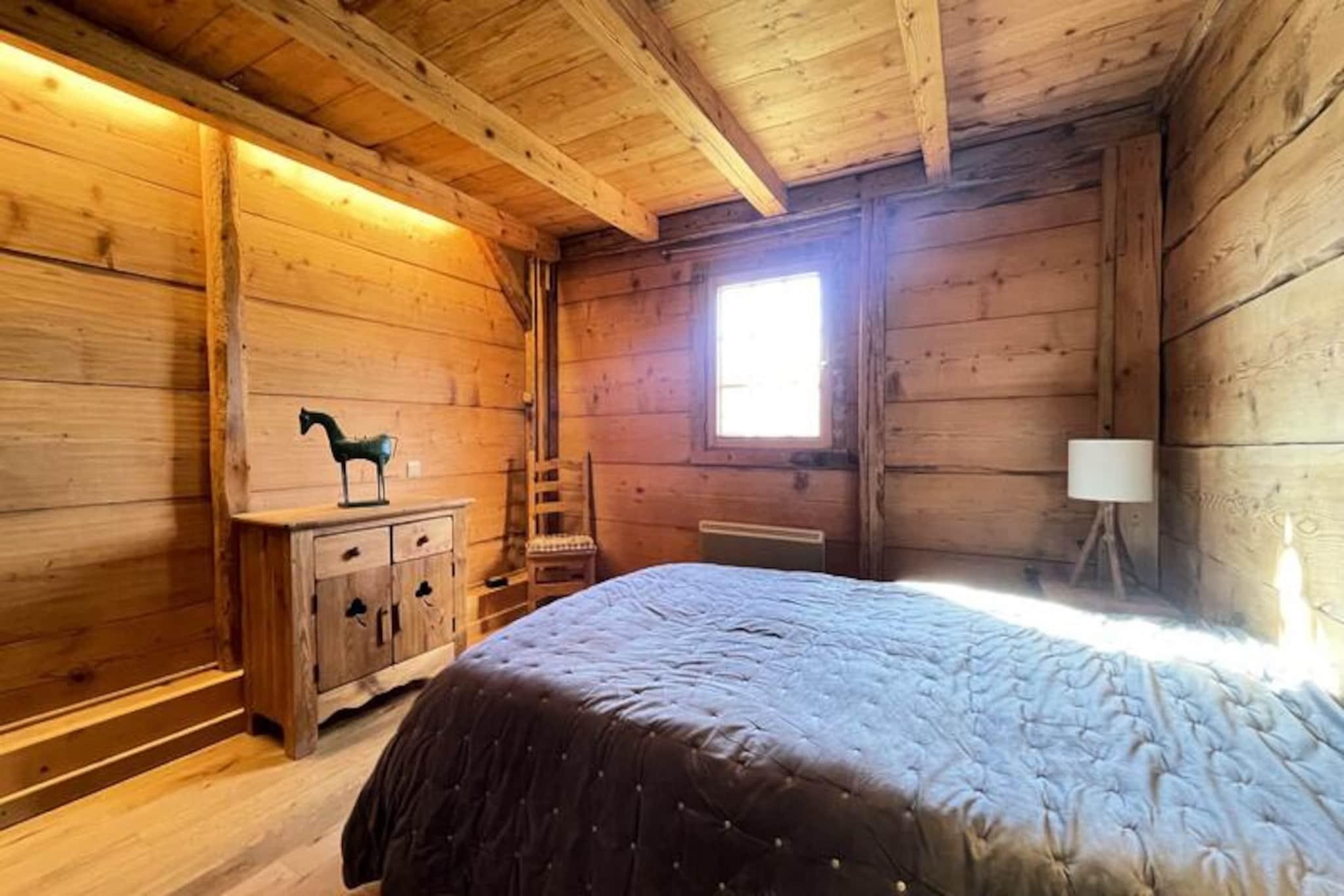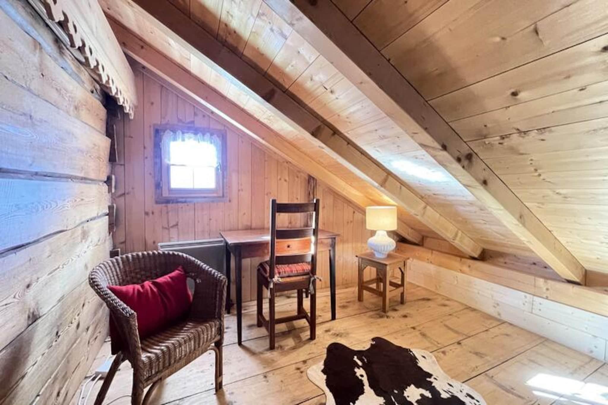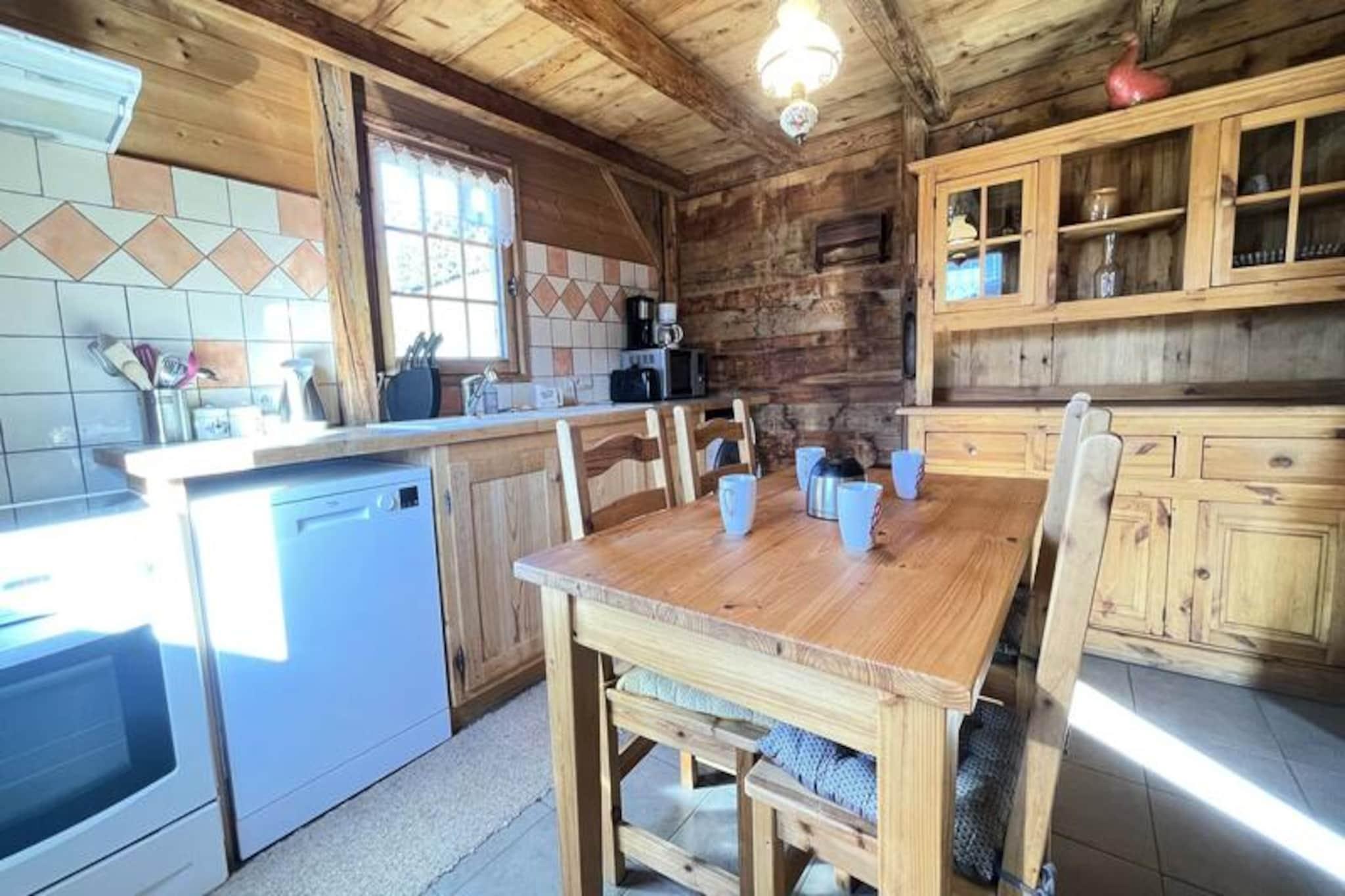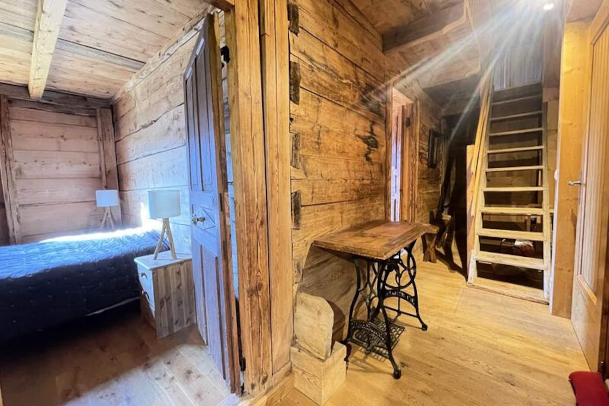 Midt i det betagende alpine landskab i Notre Dame de Bellecombe tilbyder denne charmerende Savoyard-hytte et unikt tilflugtssted for dem, der søger ro og eventyr. Omgivet af majestætiske tinder og kun 500 meter fra Boulangère-skiliften, giver den problemfri adgang til det berømte skiområde Espace Diamant, der kan prale af 192 km sammenhængende pister. Uanset om du er her for at grave dig gennem uberørt sne eller udforske frodige sommerstier, er denne hytte den perfekte base for din bjergflugt. Den sydvestvendte balkon inviterer dig til at nyde panoramaudsigten over de omkringliggende tinder, inklusive den ikoniske Mont Blanc, mens du nyder den friske alpine luft. \n\nIndenfor blander hytten traditionel charme med moderne komfort. Hovedplanen har et fuldt udstyret køkken, der åbner ud til en hyggelig opholds- og spisestue, perfekt til at dele måltider og historier efter en dag med eventyr. Et soveværelse med dobbeltseng, et separat toilet og et brusebad fuldender planløsningen. Ovenpå, der er tilgængelig via en stejl trappe, finder du et andet soveværelse, to mezzanin-rum med enkeltsenge og et arbejdsområde til dem, der har brug for at holde kontakten. Gennemtænkte faciliteter såsom WiFi, vaskemaskine/tørretumbler og privat parkering sikrer et problemfrit ophold.\n\nChaletens beliggenhed placerer dig tæt på den pulserende landsby Notre Dame de Bellecombe, kun 5 km væk, hvor du kan udforske lokale butikker og restauranter. Om sommeren tilbyder Mont Rond-stoleliften adgang til fantastiske udsigter, mens nærliggende stier og Flumet-søen lover uendelige udendørsaktiviteter. For vintersportsentusiaster gør liftkort med rabat og opbevaring af udstyr din ferie endnu mere bekvem.\n\nUanset om du rejser som familie, en gruppe venner eller søger en romantisk ferie, tilbyder dette autentiske chalet en uforglemmelig alpin oplevelse. Lad skønheden i Val d'Arly og den varme Savoyard-gæstfrihed skabe minder, du vil værdsætte for livet.