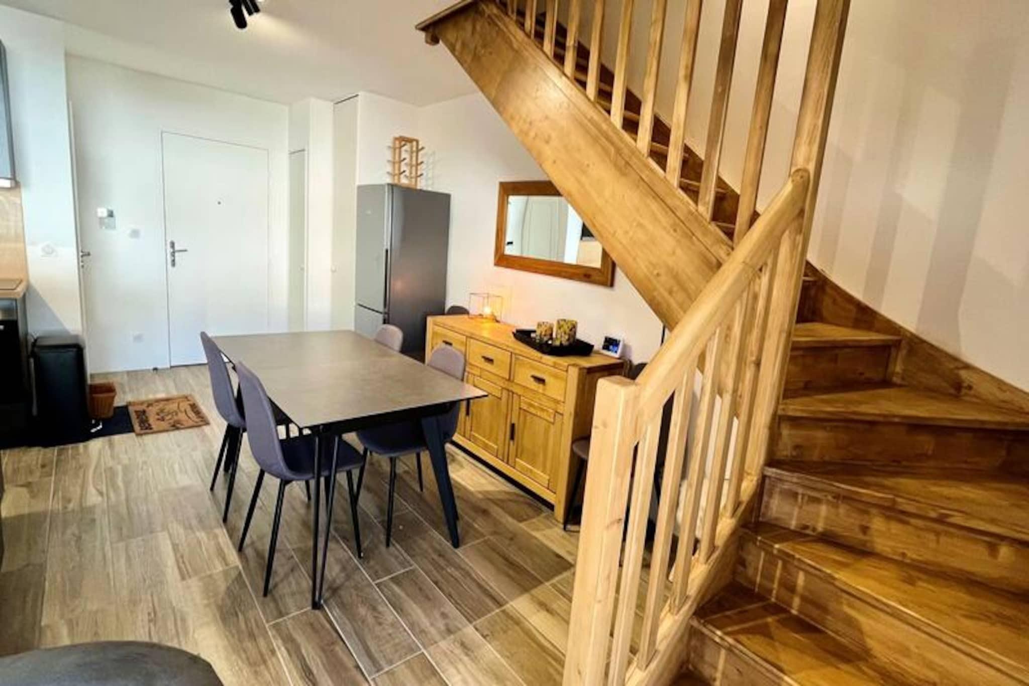 Midt i de franske alpers fredfyldte skønhed tilbyder denne moderne duplexlejlighed i Le Cristal-residensen en perfekt blanding af komfort og bekvemmelighed til din alpine ferie. Beliggende i en højde af 1350 m, ligger residensen direkte ved foden af ??Espace Diamant-pisterne, hvilket gør den til et ideelt valg for skientusiaster. Med Mont Rond-stoleliften og skiskolen kun få skridt væk, kan dine dage begynde ubesværet med spændende nedkørsler eller naturskønne udforskninger. De nordvestvendte terrasser tilbyder en betagende udsigt over Mont Charvin og de omkringliggende tinder, hvilket fordyber dig i den majestætiske alpine atmosfære. \n\nLejligheden strækker sig over to etager og har plads til op til seks gæster. På første sal finder du et fuldt udstyret køkken med moderne apparater, en hyggelig opholdsstue med tv og en spiseplads, der åbner ud til den første terrasse. Ovenpå tilbyder to gennemtænkte soveværelser komfort og fleksibilitet, hvor det ene har en dobbeltseng og køjesenge, og det andet en queensize-seng med adgang til den anden terrasse. Et rummeligt badeværelse med dobbelt håndvask og vaskemaskine sikrer bekvemmelighed, mens rigelig opbevaringsplads i hele lejligheden øger dens funktionalitet. \n\nOm sommeren forvandles regionen til et paradis for friluftsentusiaster. Mont Rond-stoleliften er åben tre dage om ugen og fører besøgende til panoramaudsigt over Mont Blanc. Vandrestier og mountainbike-stier krydser området, mens Flumet-søen, kun 7 km væk, tilbyder fritidsfaciliteter til familievenlig underholdning. Nærliggende destinationer som Megève, Chamonix og Annecy giver muligheder for kulturel udforskning, udsøgte restauranter og betagende landskaber. \n\nUanset om du søger eventyr eller ro, gør denne lejligheds førsteklasses beliggenhed og gennemtænkte faciliteter den til et enestående valg for alpine ferier året rundt. Med WiFi, privat parkering og et skiskab inkluderet lover dit ophold både komfort og uforglemmelige minder.