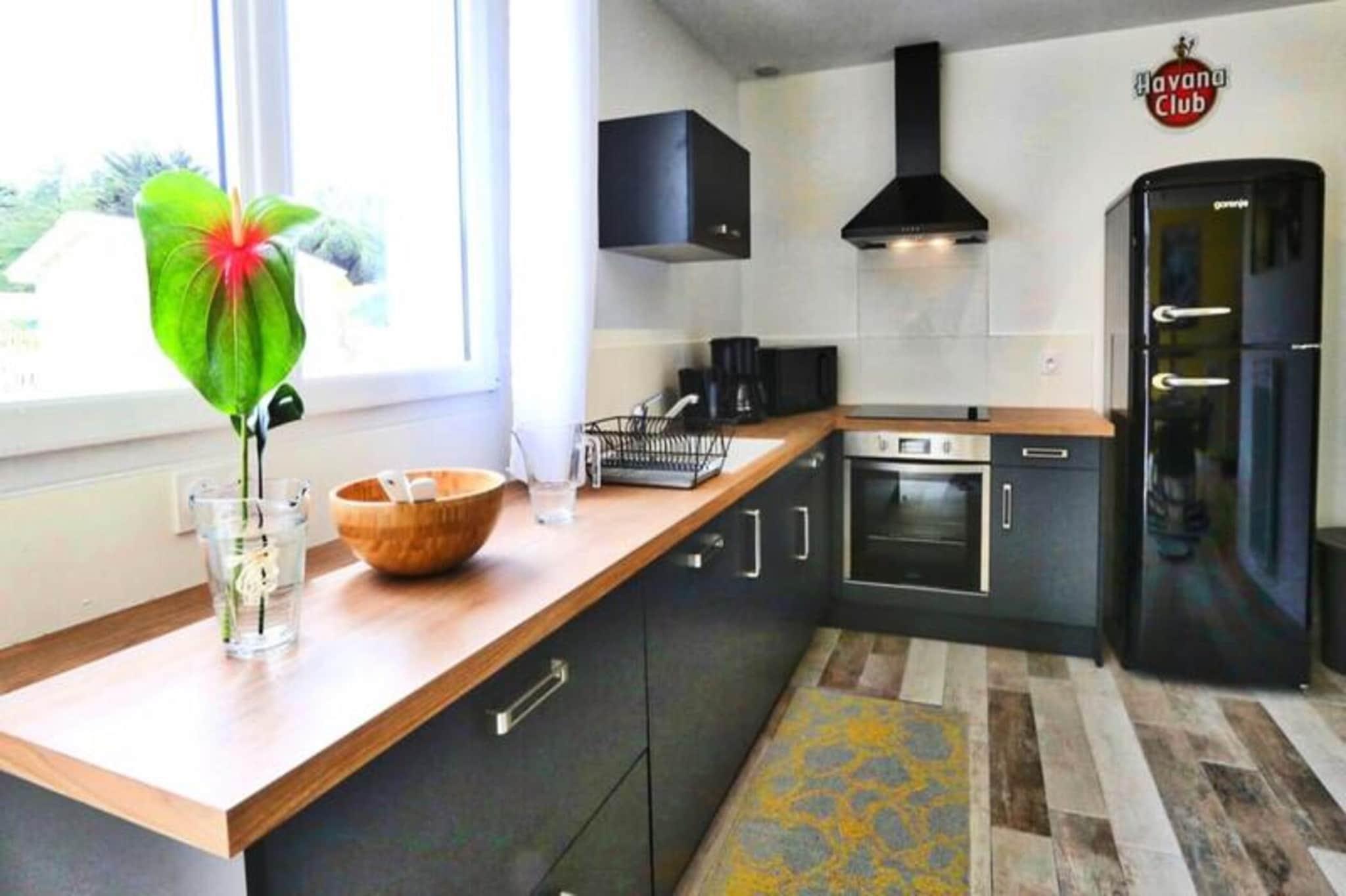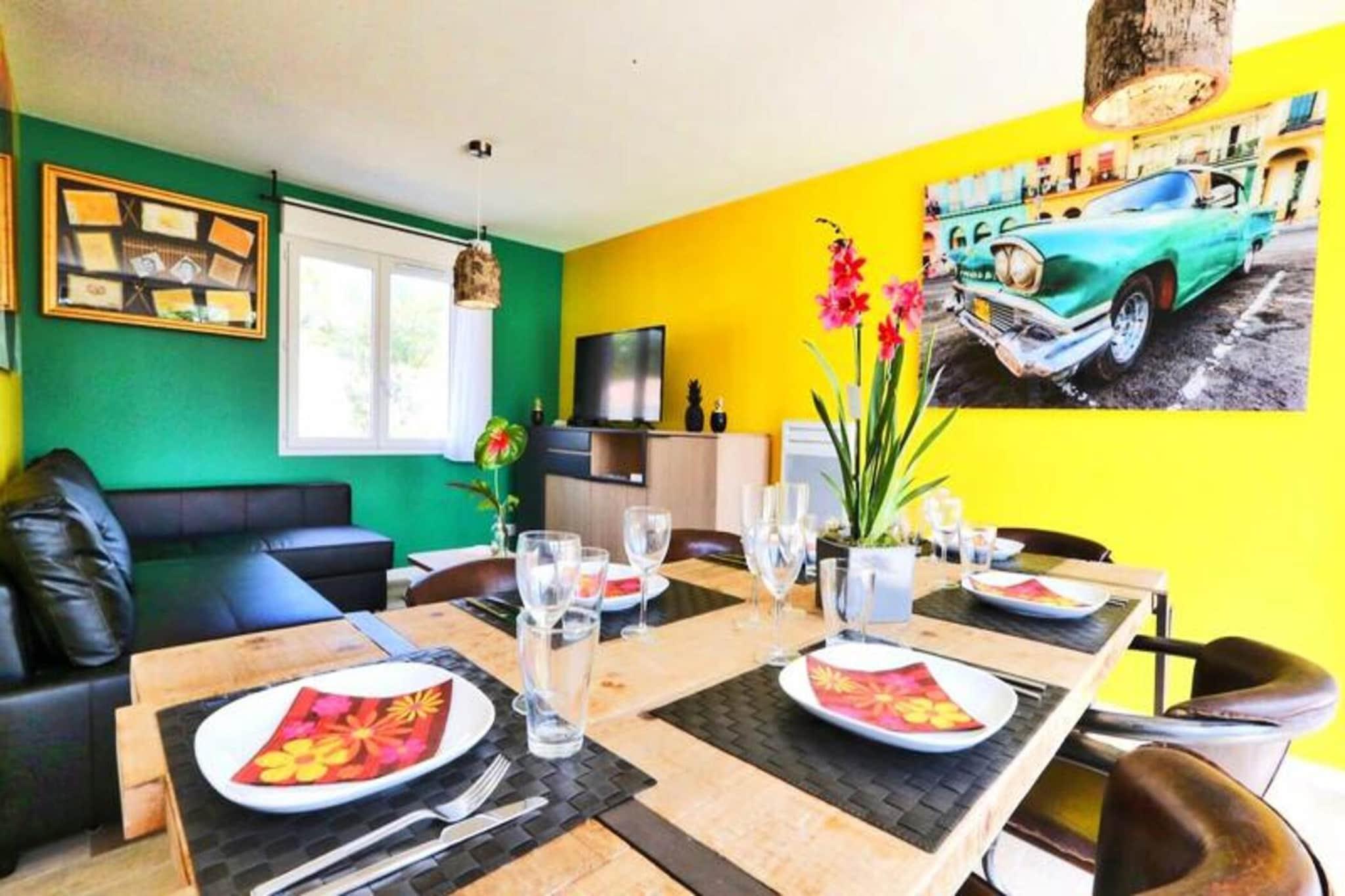Beliggende i hjertet af skoven tilbyder denne lejlighed p? 50 m², designet med et levende cubansk tema, en fredelig tilflugtssted for op til 6 personer. Den har to sovev?relser med dobbeltsenge og en sovesofa i stuen for ekstra soveplads. Lejligheden er k?ledyrsvenlig (for k?ledyr under 25 kg og ikke-st?jende, med et gebyr p? EURO15). En privat terrasse giver et roligt udend?rs rum, komplet med havem?bler, et udend?rs bord og stole, en parasol og en grill eller elektrisk plancha. En privat 6-personers spa er tilg?ngelig for et ekstra gebyr p? EURO40 for hele dit ophold. Beliggende kun f? minutter fra stranden og omgivet af Pays-de-Monts nationalskov, tilbyder ejendommen nem adgang til en r?kke udend?rs aktiviteter. G?sterne kan udforske de mange cykelstier omkring Domaine, som er perfekte til vandreture i naturen og cykelture. Omr?dets caf?er, markeder og lokale attraktioner sikrer, at der er masser at opdage i de pulserende omgivelser. Lejligheden har et fuldt udstyret k?kken med k?leskab, fryser, ovn, mikroovn, opvaskemaskine, kaffemaskine og alle n?dvendige redskaber til tilberedning af m?ltider. I stuen er der et fjernsyn med TNT-kanaler. Yderligere faciliteter omfatter en vaskemaskine, h?rt?rrer og strygebr?t. Senget?j er forudsat, men h?ndkl?de leje er tilg?ngelig for EURO 5 per person. Valgfrie tjenester som slutreng?ring (85 EURO) eller reng?ring midt p? opholdet (39 EURO) er tilg?ngelige. Et babys?t kan rekvireres for EURO15.