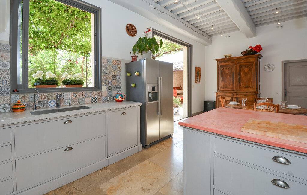 Velkommen til dette indbydende og hyggelige feriehus i Noves, hvor ædle materialer som sten, træ og jern skaber en unik atmosfære. Huset byder på store, lyse rum og giver med sin rummelighed den perfekte ramme for at nyde ferielivet i de smukt indrettede omgivelser. Læn jer tilbage på sofaerne eller tilbered lækre måltider i det store køkken.
