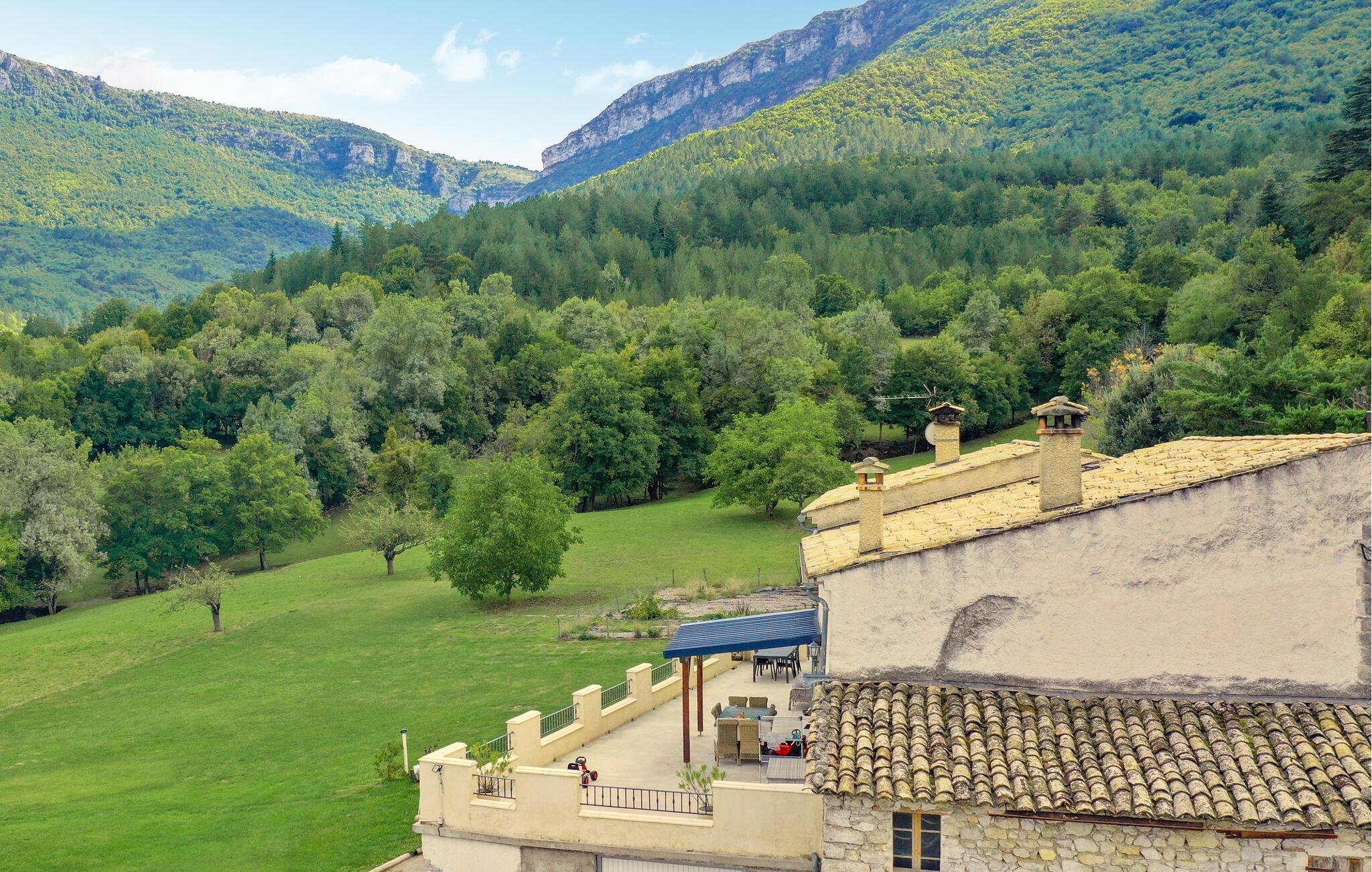 Træd ud på den store terrasse og nyd udsigten over den grønne dal og bjergene. Nyd jeres måltider udendørs, og slap af under den overdækkede pergola. Udforsk den store grund med have og blomstrende planter og nyd roen i de landlige omgivelser.