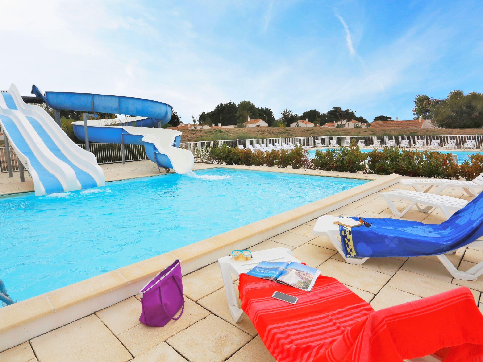Child friendly resort "Les Grands Rochers". 120 apartments in the residence. 3 km from the centre of Olonne-sur-Mer, 3 km from the sea. For shared use: property with trees, swimming pool, indoor pool heated (16 x 12 m, seasonal availability: 01.Jan. - 31.Dec.). Children's pool, slide, terrace. In the complex: reception, internet access, WiFi, sauna, fitness room, washing machine, tumble dryer (for shared use, extra). Parking on the premises. Supermarket 3 km, sandy beach 3 km. Please note: car-free holiday complex. Loading and unloading of baggage is possible at the holiday house. The photograph shows a typical example. The holiday properties may differ in living space, floorplan, equipment and furnishing.