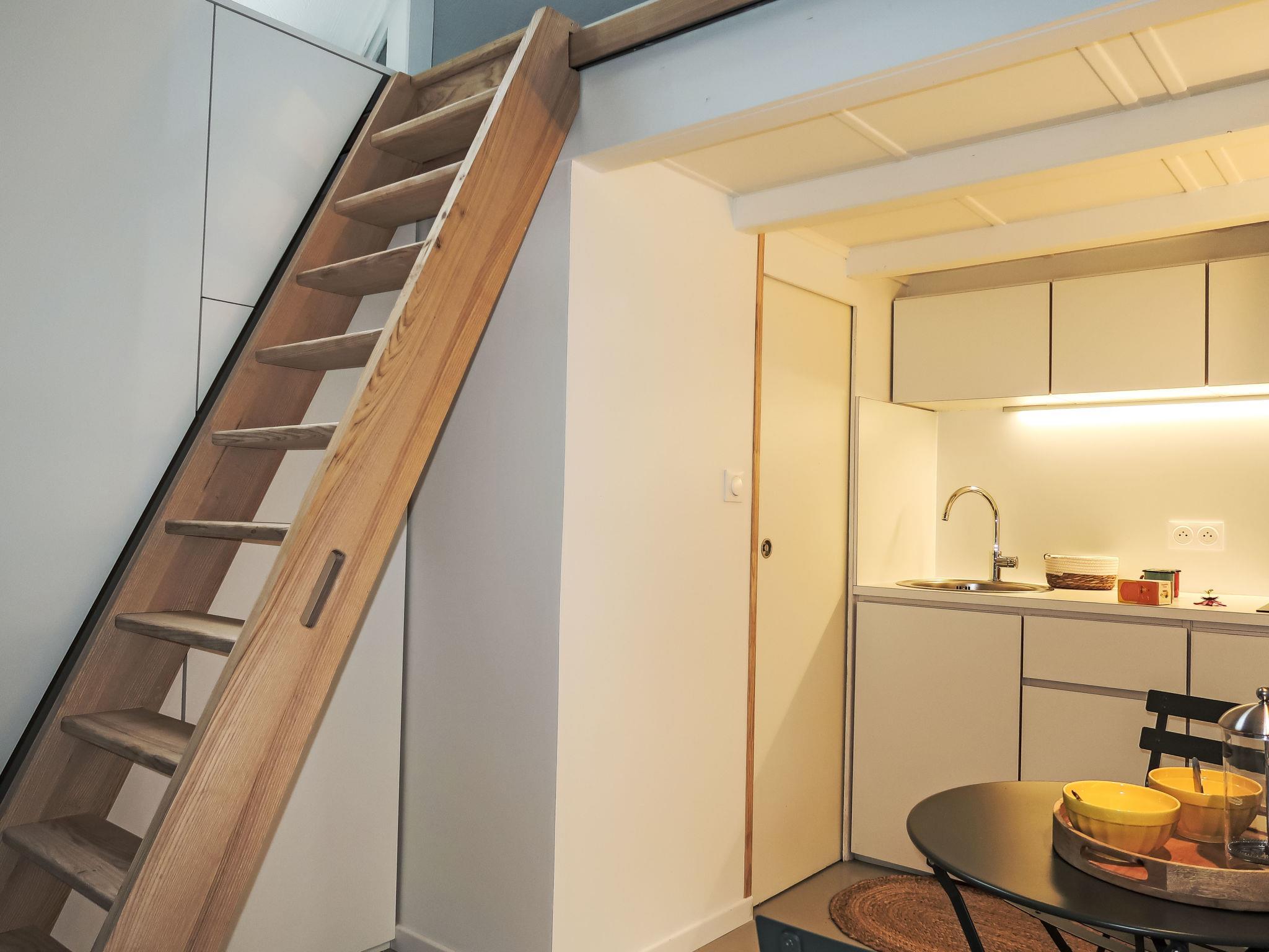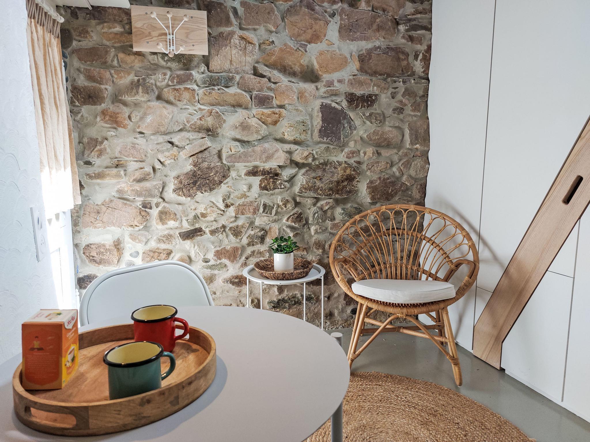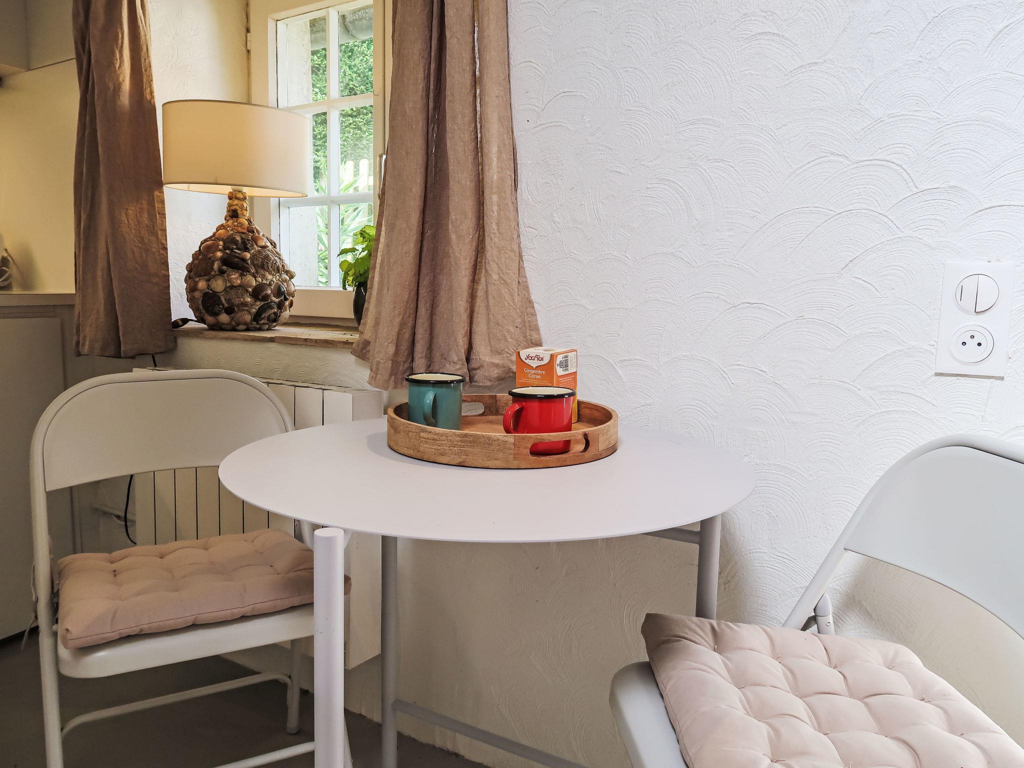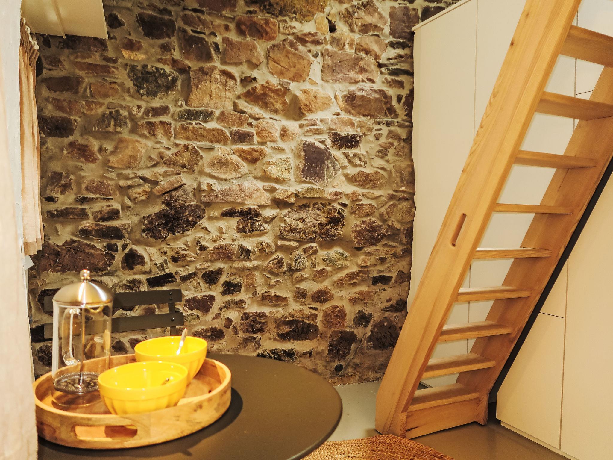 "Gwenn Tiny House", 1-room studio 10 m2 on 2 levels. With sloping ceilings, renovated in 2024, cosy furnishings: small living room with dining table. Kitchenette (2 ceramic glass hob hotplates, toaster, kettle, electric coffee machine). Shower/WC. Electric heating. Upper floor: (ladder) open alcove with sloping ceilings with 1 french bed (140 cm, length 190 cm). Terrace furniture, deck chairs (2). Please note: not suitable for small children. Non-smoking house. Smoke alarm. Offer by a private individual according to Art. 155, IV of CGI.