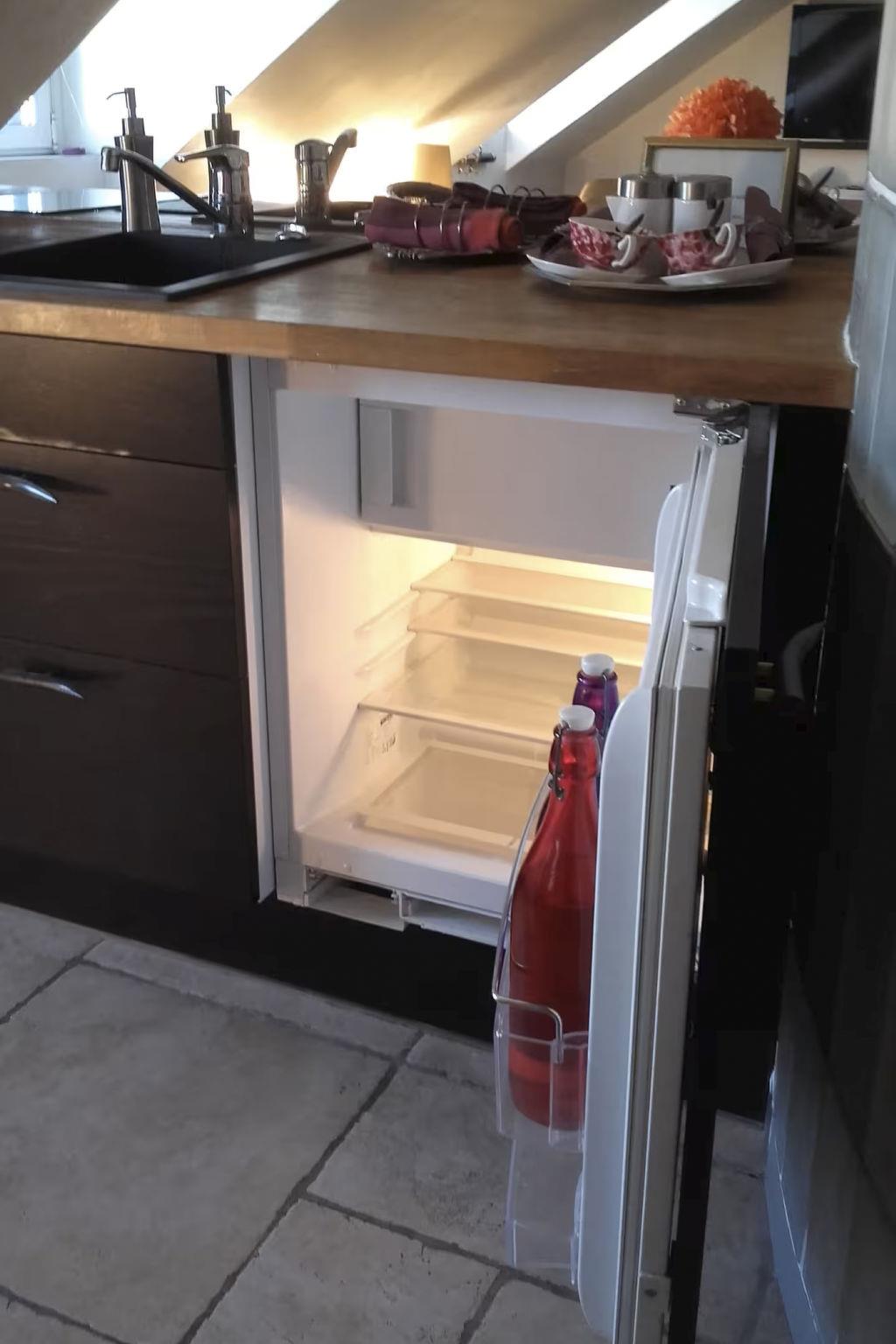 The interior of this 45 m² flat, accessible by lift, is a celebration of elegance and romance. The living room, with its cosy sofa, small round table and flat-screen TV, is delicately furnished for your moments of relaxation. The open-plan kitchen, which blends harmoniously with the living area, is fully equipped with a microwave, induction hob, oven, fridge with freezer, coffee maker, kettle and toaster to cater for all your culinary needs. A bathroom separated by an attractive arched wall offers a shower, washbasin and WC, while a few steps lead up to a cosy mezzanine with a comfortable double bed, small desk and armchair.