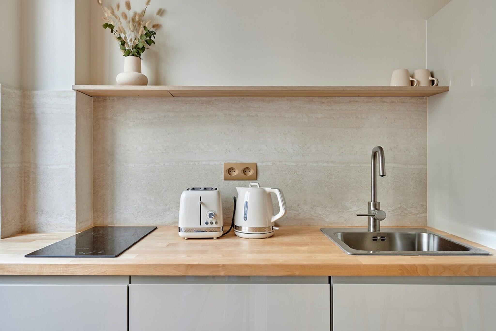 På 1. etage: (Stue(dobbeltseng, Fjernsyn, spisebord), Køkken(kakkelovn, elkedel, brødrister, kaffemaskine, mikrobølgeovn, køleskab, Wine glasses), badeværelse(bruser, toilet)) , , , , Førstehjælp, tørretumbler, vaskemaskine, varme, klimaanlæg, strygejern, føntørrer, , , , , , Baking sheet, Carbon monoxide detector, Coffee, Downtown, Long term stays allowed, Shower gel, Wine glasses