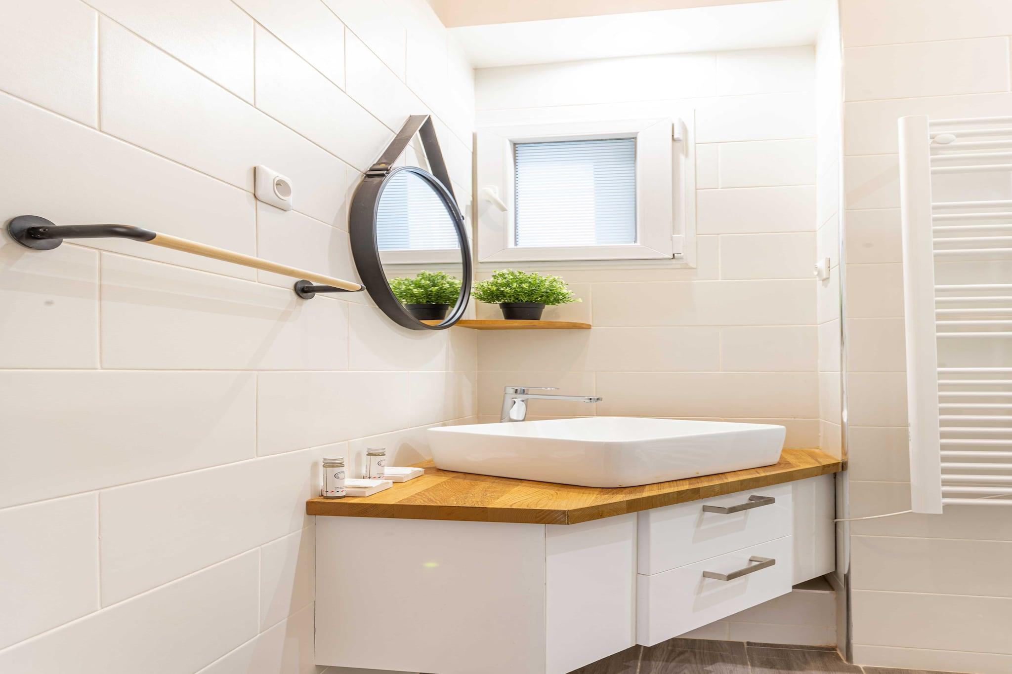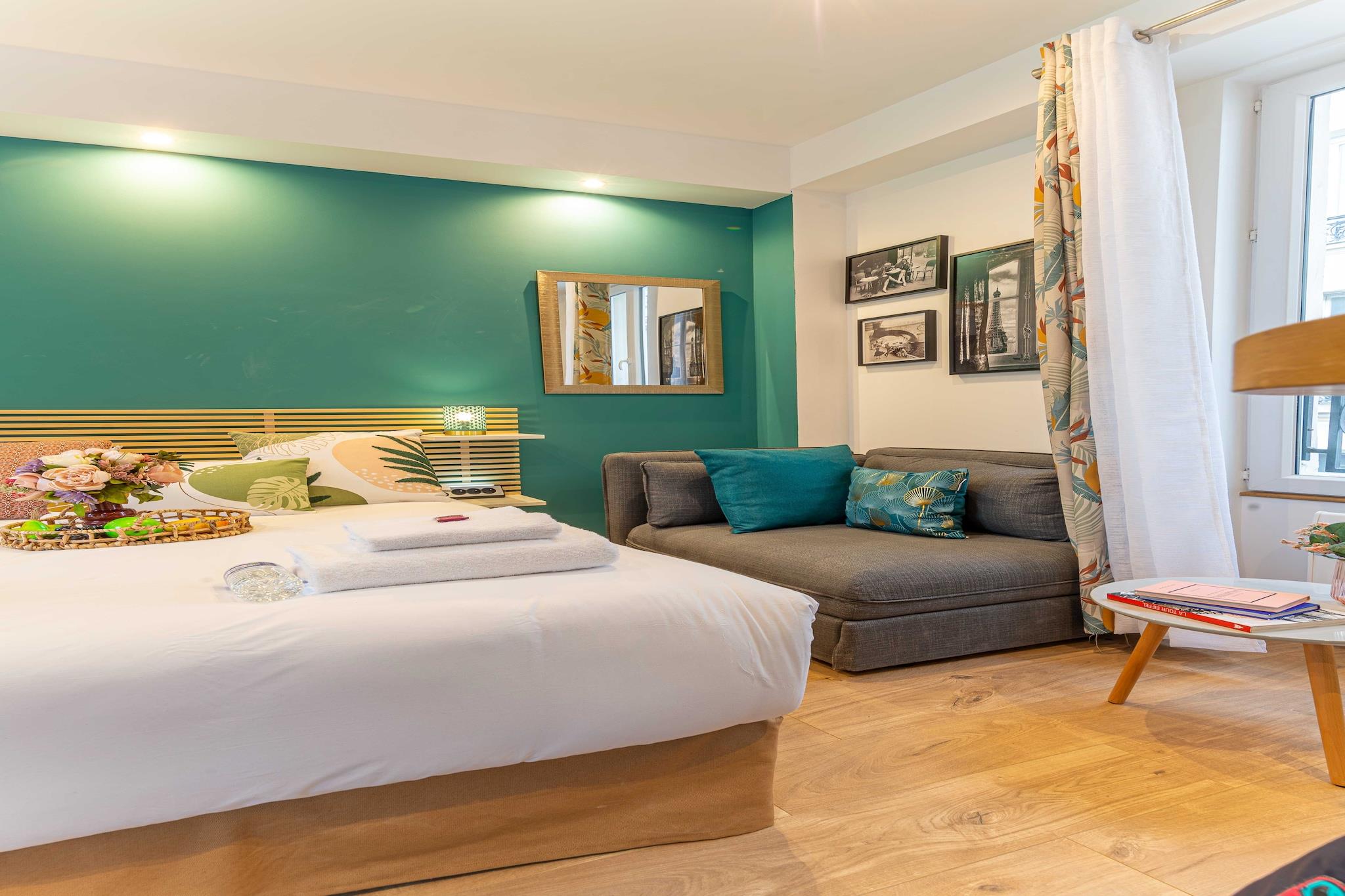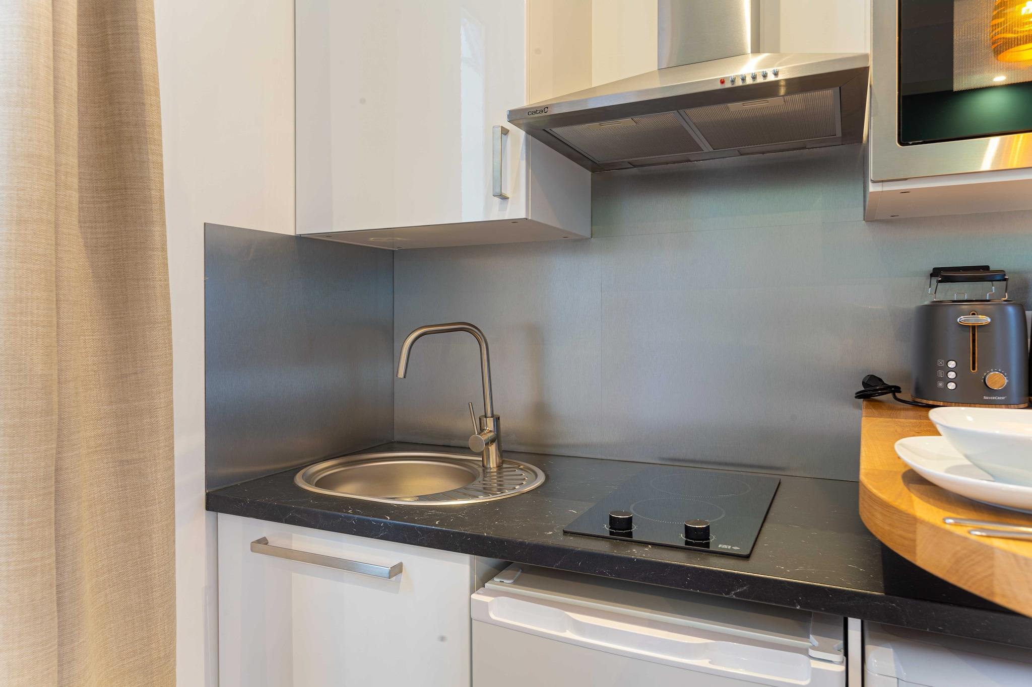 På 4. etage: (Køkken(kakkelovn, elkedel, brødrister, kaffemaskine, mikrobølgeovn, køleskab, , ), soveværelse(, , , dobbeltseng, Fjernsyn), badeværelse(føntørrer, Håndklæder/sengelinned (inkl.), )) , , vaskemaskine, varme, strygejern,