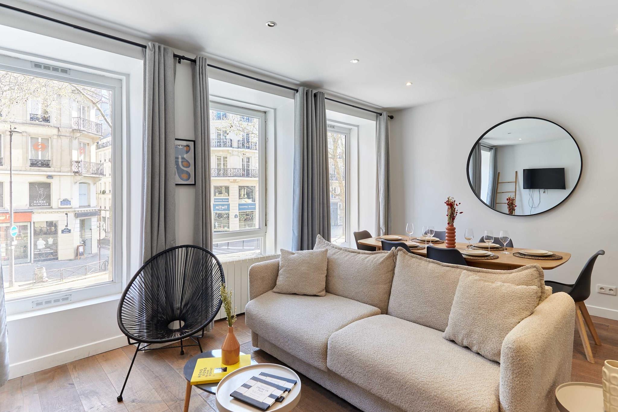 Oplev denne ideelt beliggende lejlighed i hjertet af Paris, halvvejs mellem Marais, Rue Montorgueil og Place des Victoires. Du finder alle de lokale butikker, de berømte teatre på Grands Boulevards og et udvalg af restauranter, der passer til din smag. Min lejlighed er elegant, rummelig, lys, smagfuldt indrettet og fuldt udstyret og er ideel til et vellykket ophold i hovedstaden, uanset om det er med familie eller venner.