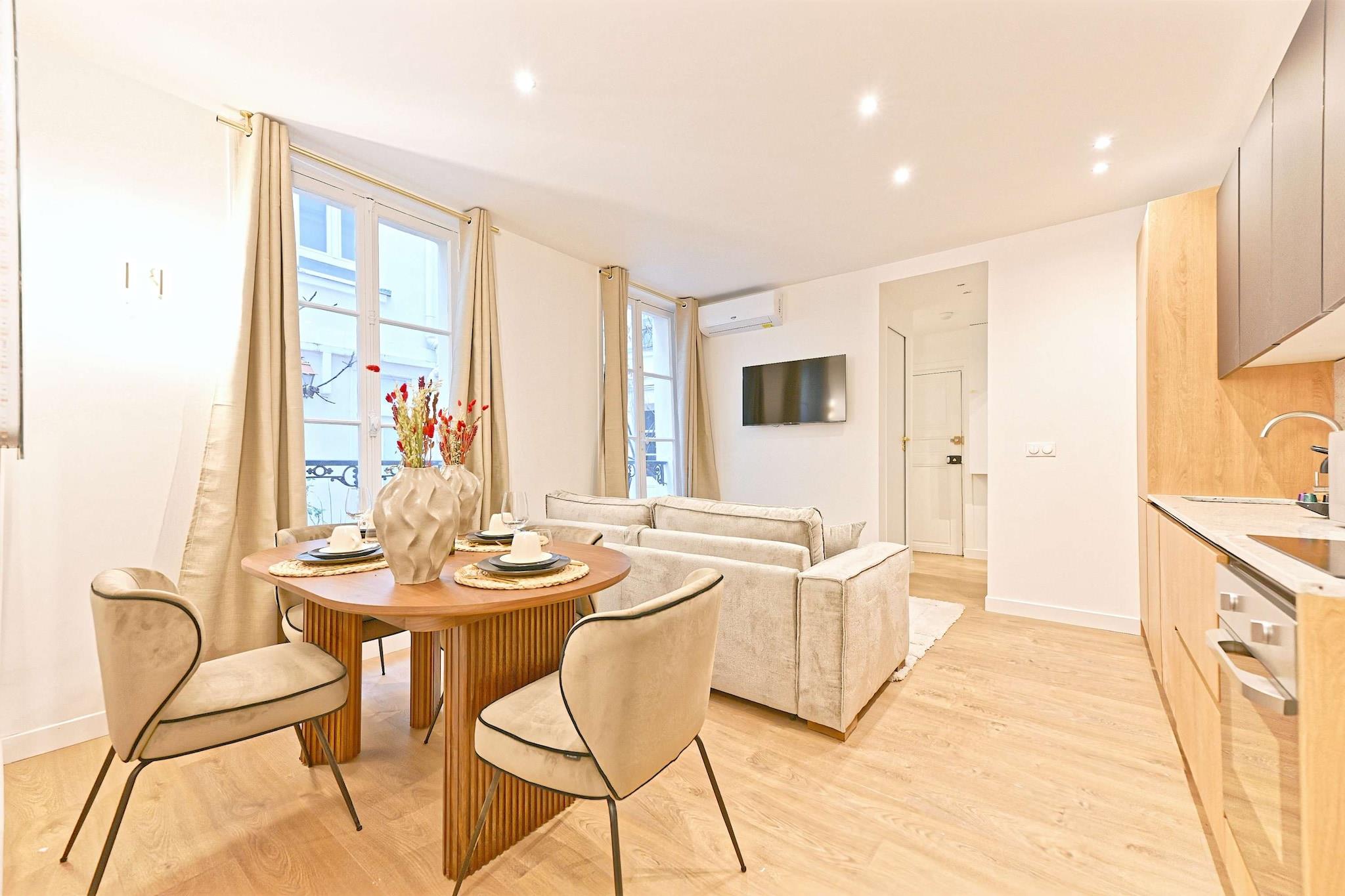Storslået lejlighed med aircondition, renoveret i februar 2024 - Elegance og komfort i hjertet af Paris En førsteklasses beliggenhed i en charmerende gågade Nyd roen på en fredelig gågade, mens du bor i Paris' pulserende hjerte. Denne smukke lejlighed i stueetagen tilbyder rolige og raffinerede omgivelser, ideel til at udforske byen, mens du nyder komforten i et perfekt designet rum.