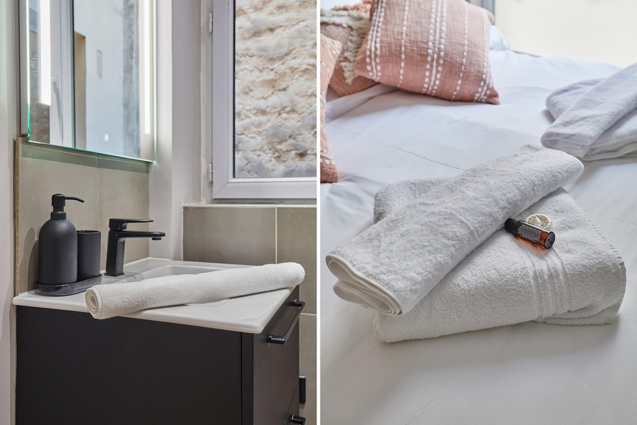 På 2. etage: (Stue(Internetadgang, dobbeltsovesofa, Fjernsyn), soveværelse(Queen Bed), soveværelse(Queen Bed), Soveværelse med badeværelse(king size-seng, bruser, håndvask, toilet, føntørrer, Håndklæder inkl., ), badeværelse(tørretumbler, badekar, håndvask, vaskemaskine, Håndklæder inkl.), toilet) , , , , , Førstehjælp, Fjernsyn, spisebord, kakkelovn, elkedel, brødrister, kaffemaskine, ovn, mikrobølgeovn, opvaskemaskine , køleskab, fryser, tørretumbler, varme, strygejern, føntørrer, crib(free), , , , , , , Baking sheet, Carbon monoxide detector, Cleaning products, Coffee, Downtown, Extra pillows and blankets, Room-darkening shades, Shower gel, Wine glasses