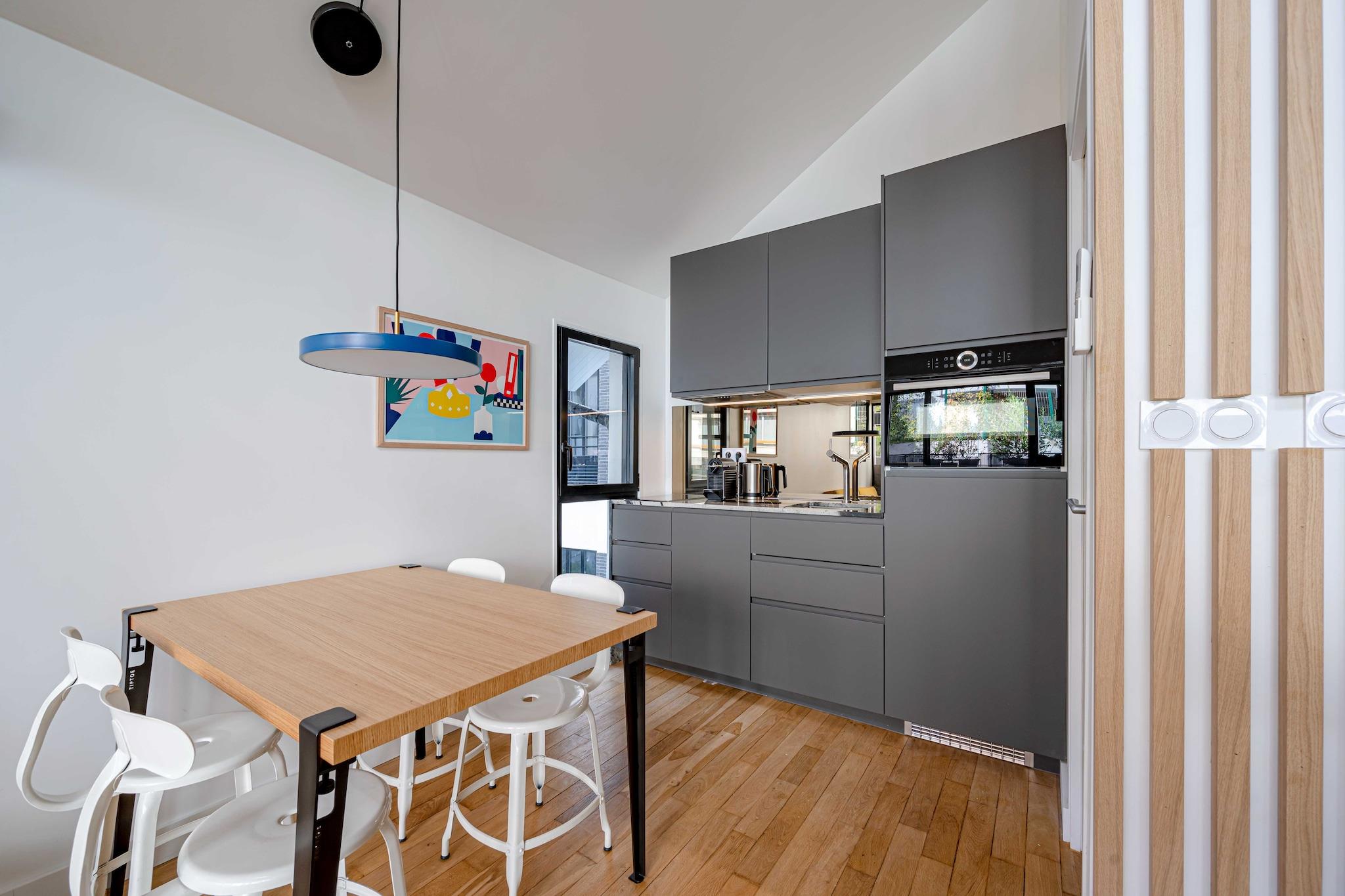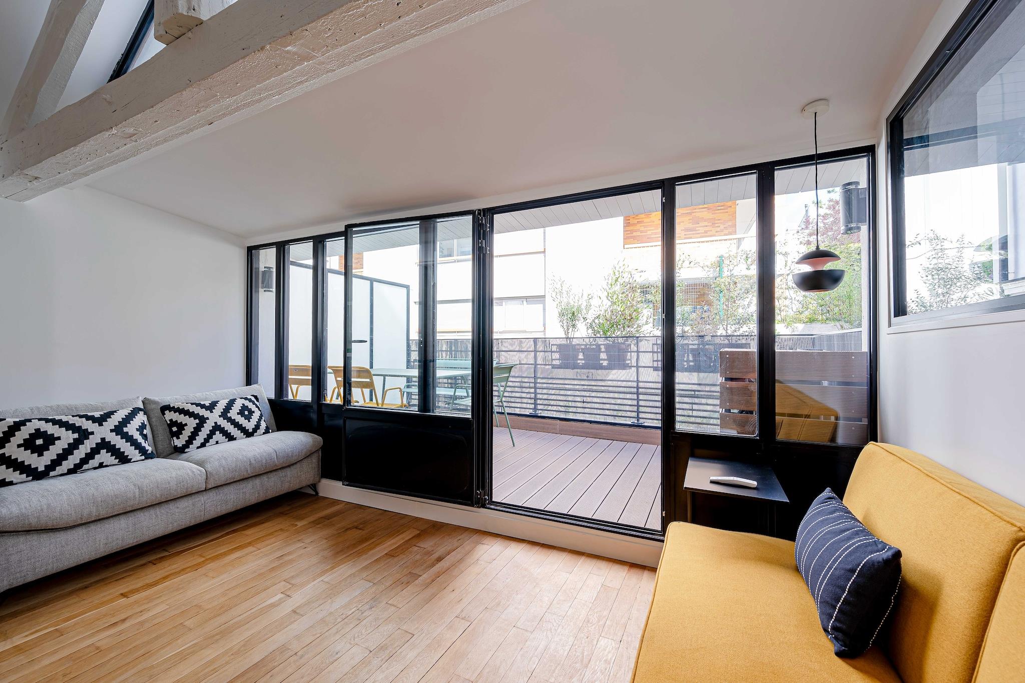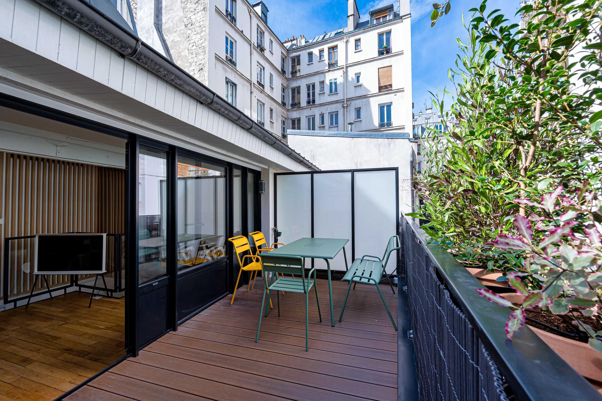 Denne moderne lejlighed ligger i hjertet af Paris på adressen 60 Rue Amelot, kun en kort gåtur fra livlige caféer, butikker og større attraktioner. Indkvarteringen er fordelt på to etager: entréen og et soveværelse ligger i stueetagen, mens opholdsstuen, det åbne køkken, det andet soveværelse og badeværelset ligger ovenpå og er tilgængelige via en intern trappe. Lejligheden har et åbent køkken med komfur, elkedel, brødrister, kaffemaskine, mikrobølgeovn, opvaskemaskine, køleskab og alt nødvendigt køkkenudstyr. Den lyse opholdsstue tilbyder tv, skrivebord, aircondition, internetadgang og en komfortabel dobbeltsovesofa. De to soveværelser har et med en dobbeltseng og et med to enkeltsenge. Badeværelset er udstyret med bruser, toilet, hårtørrer, håndklæder og toiletartikler. Der er også vaskemaskine, varme og strygejern til rådighed for gæsterne. Gæsterne kan nyde en privat balkon eller terrasse og drage fordel af faciliteter såsom forbedret rengøring, varme og Wi-Fi. Bemærk venligst, at ejendommen på grund af den interne trappe muligvis ikke er egnet til gæster med nedsat mobilitet. Langtidsophold er velkomne, og lejlighedens centrale beliggenhed gør den ideel til både fritids- og forretningsophold i Paris.