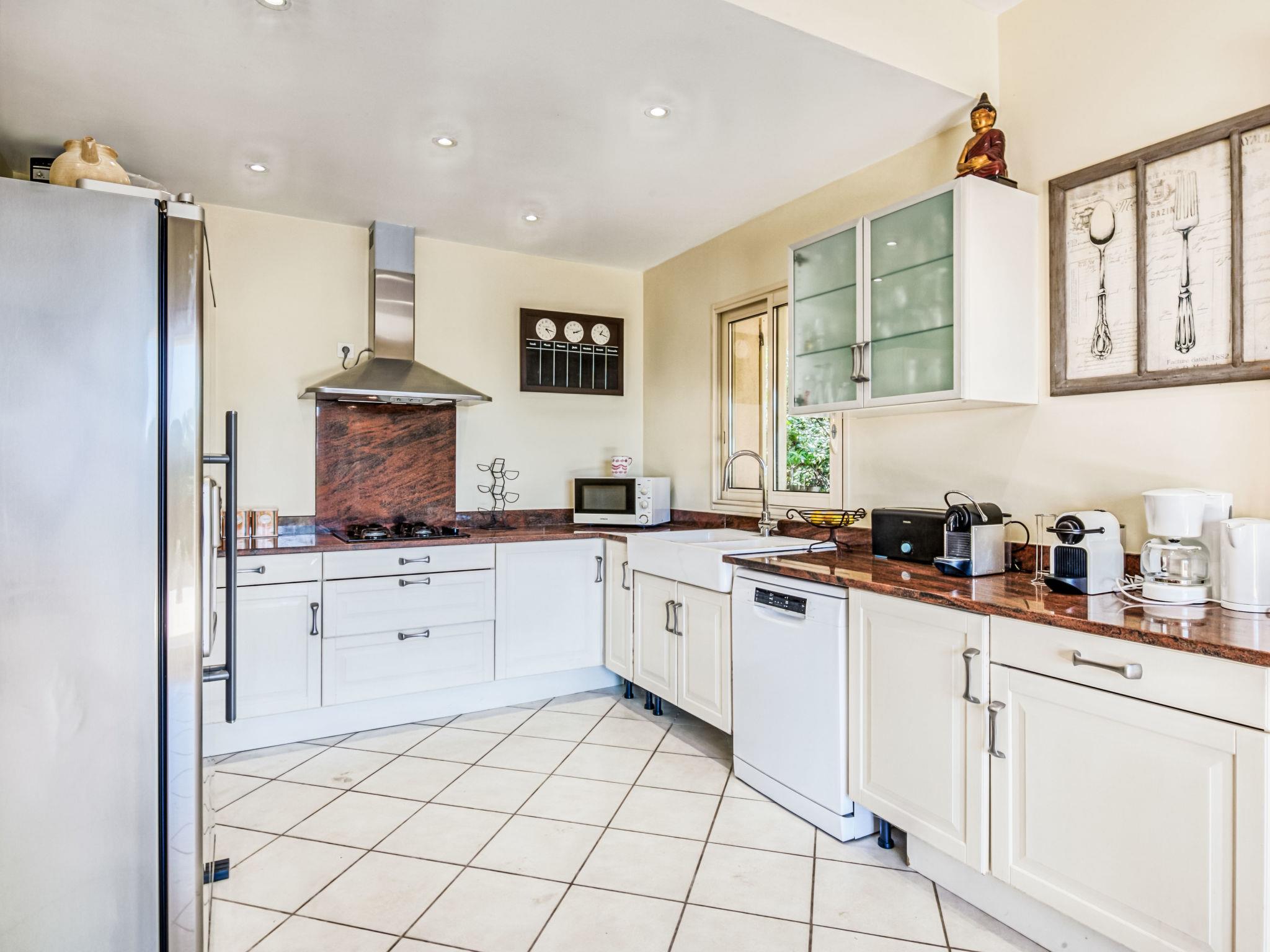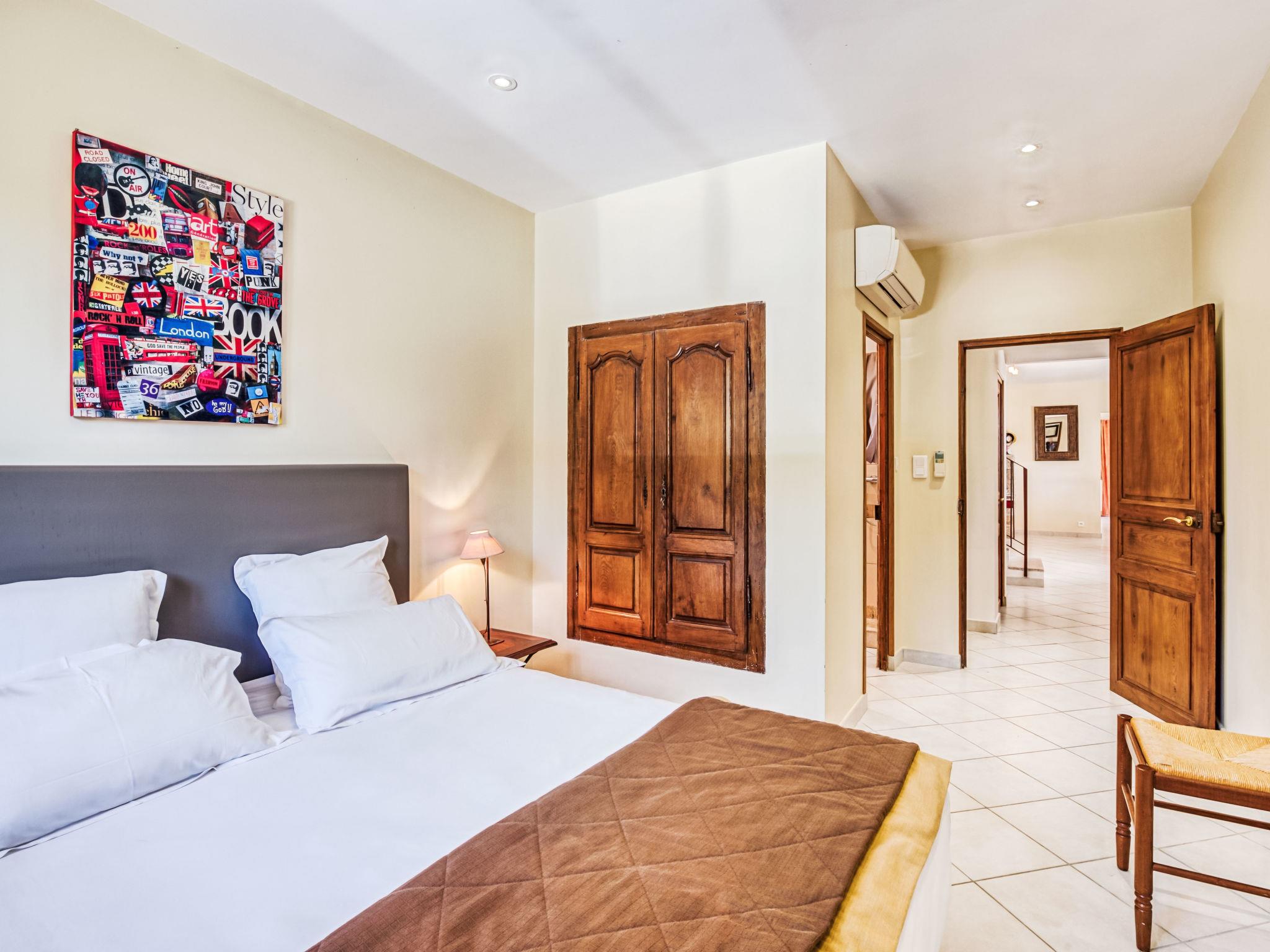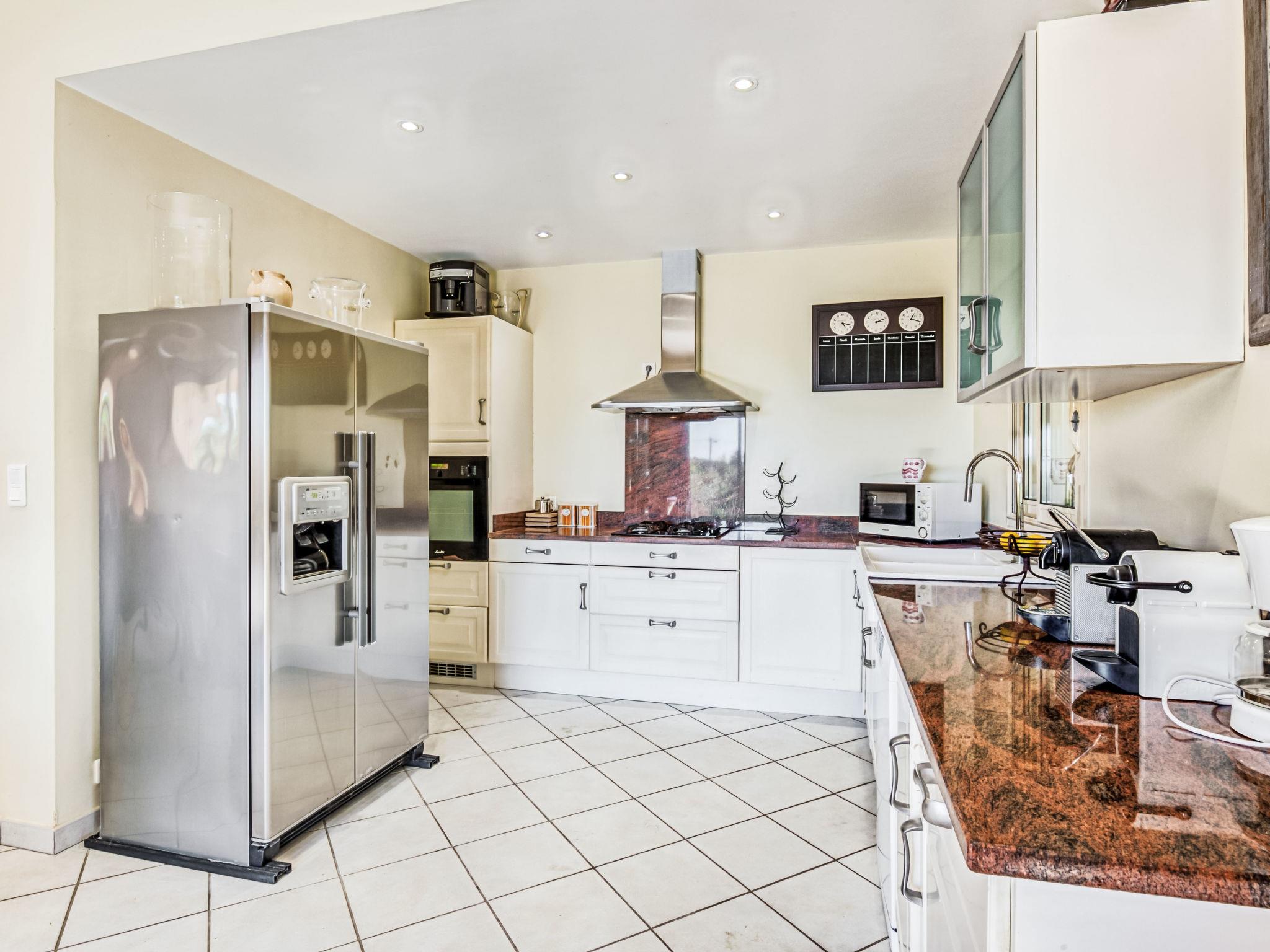 6-room villa 250 m2 on 2 levels. Beautiful and cosy furnishings: large living/dining room with TV (flat screen). Exit to the terrace. 2 rooms, each room with 1 french bed (180 cm, length 200 cm), shower/WC. Exit to the terrace. 1 room with 2 beds (90 cm, length 190 cm), shower/WC. Exit to the terrace. 1 room with 2 beds (90 cm, length 190 cm), shower/WC. Large, open kitchen (4 hot plates, oven, dishwasher, microwave, freezer, electric coffee machine). Upper floor: 1 room with 1 french bed (160 cm, length 200 cm). Exit to the balcony. Bathroom, sep. WC. Air-conditioning, forced-air heating. Large terrace 50 m2. Terrace furniture, deck chairs (10). View of the garden. Facilities: washing machine, iron, children's high chair, baby cot for up to 3 year olds, hair dryer. Internet (WiFi, free). Please note: two of the bedrooms on the ground-floor, are located in the adjoining house, with separate entrance.