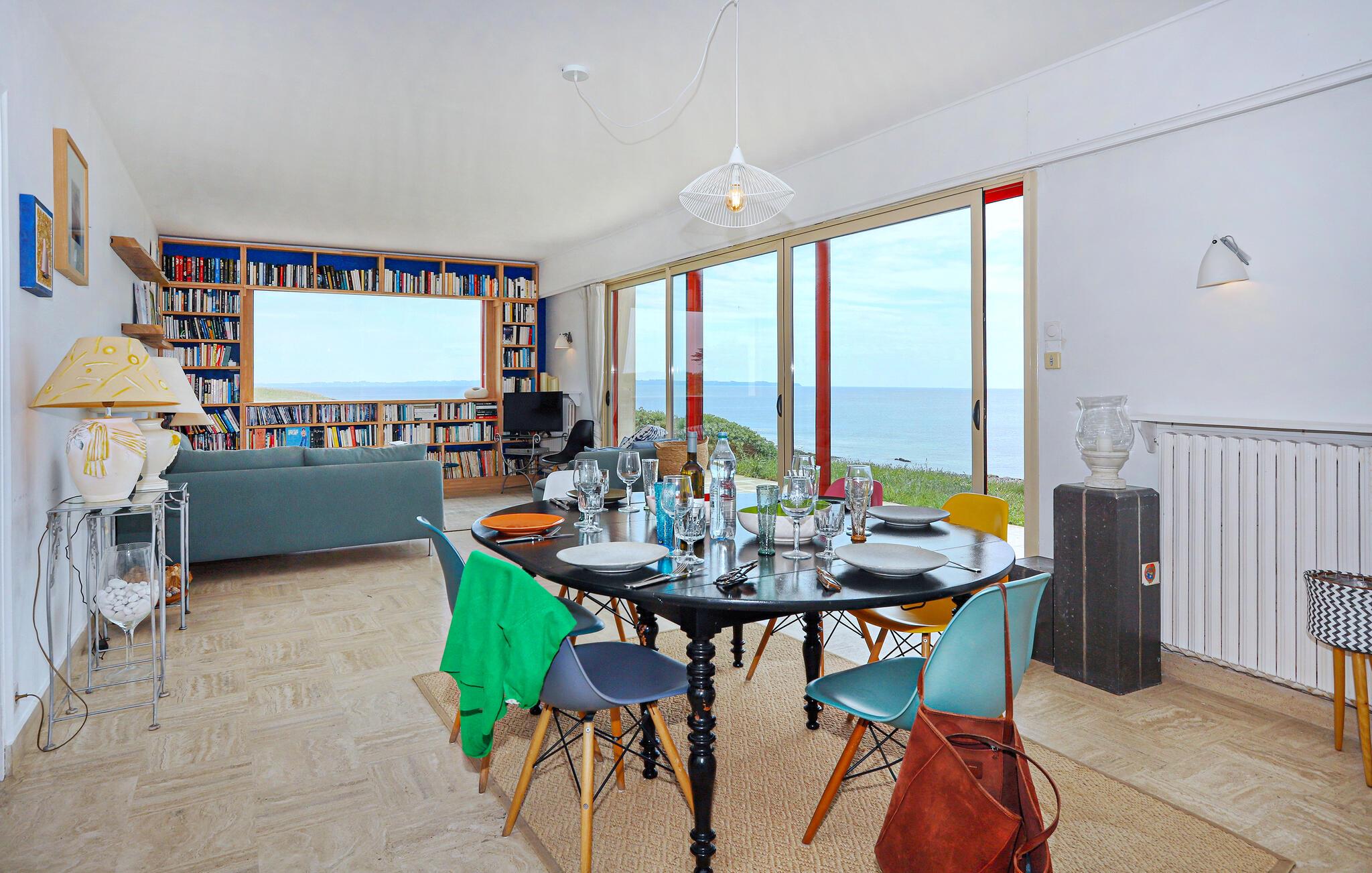 Velkommen til dette rummelige feriehus, hvor I kan se havet fra alle rum. Pisk lækre måltider op i det moderne, åbne køkken og tag plads i den lyse og smagfuldt indrettede opholdsstue. Gennemse det interne bibliotek og glæd jer til hyggelige aftener og gode snakke med et glas vin i sofaen.