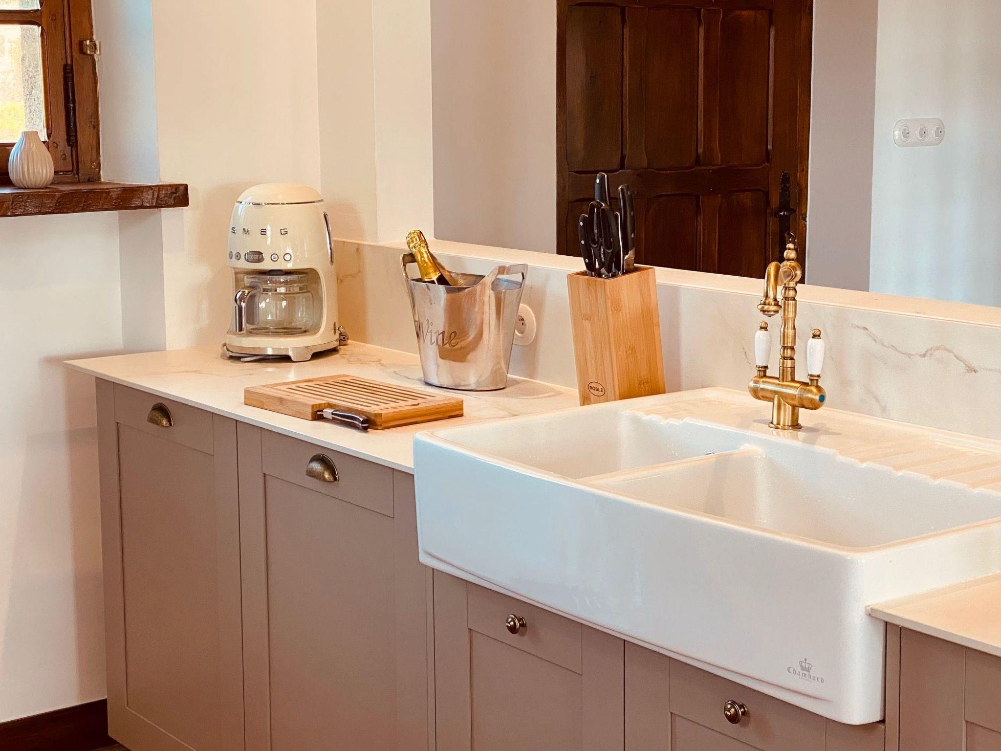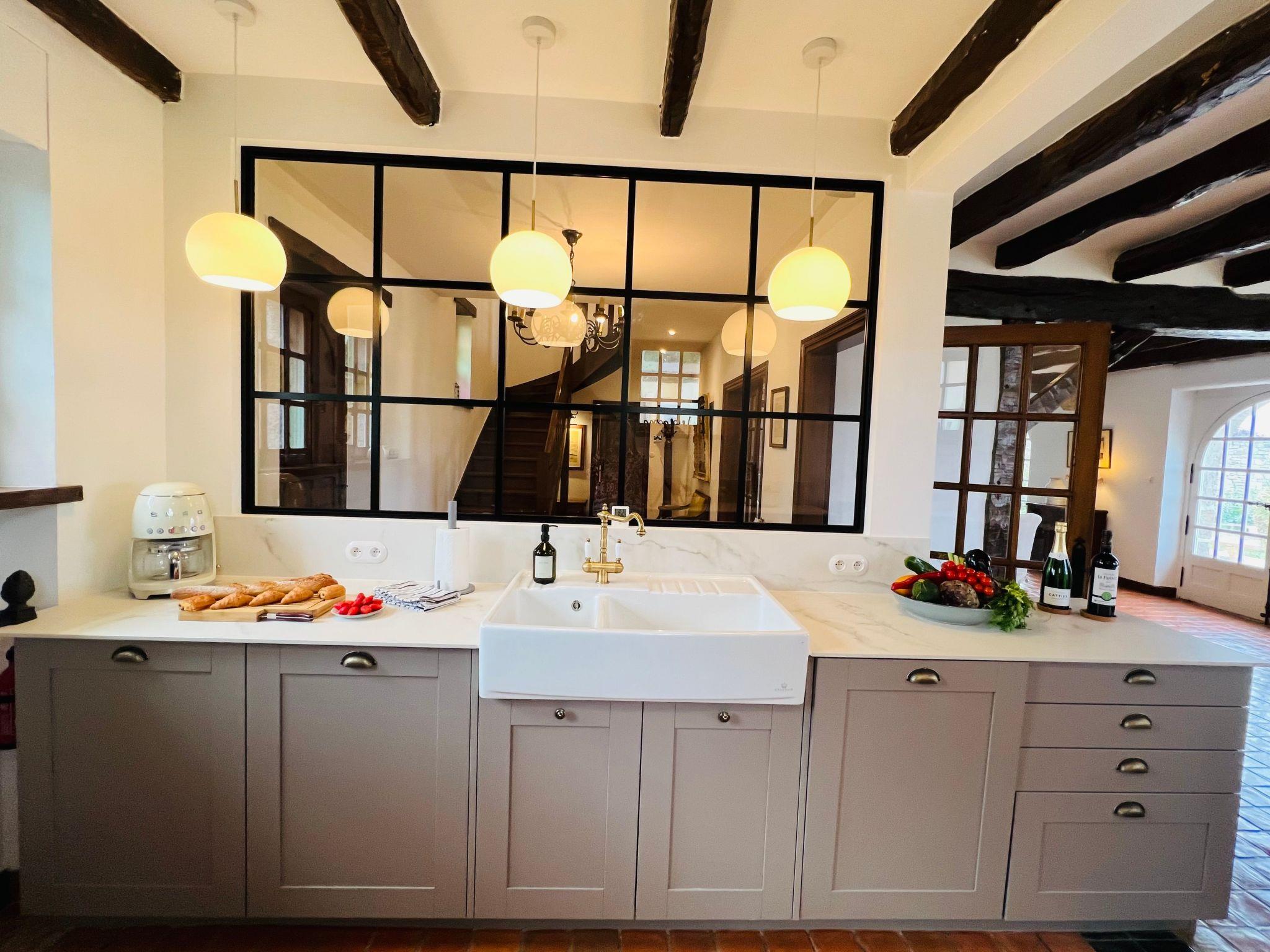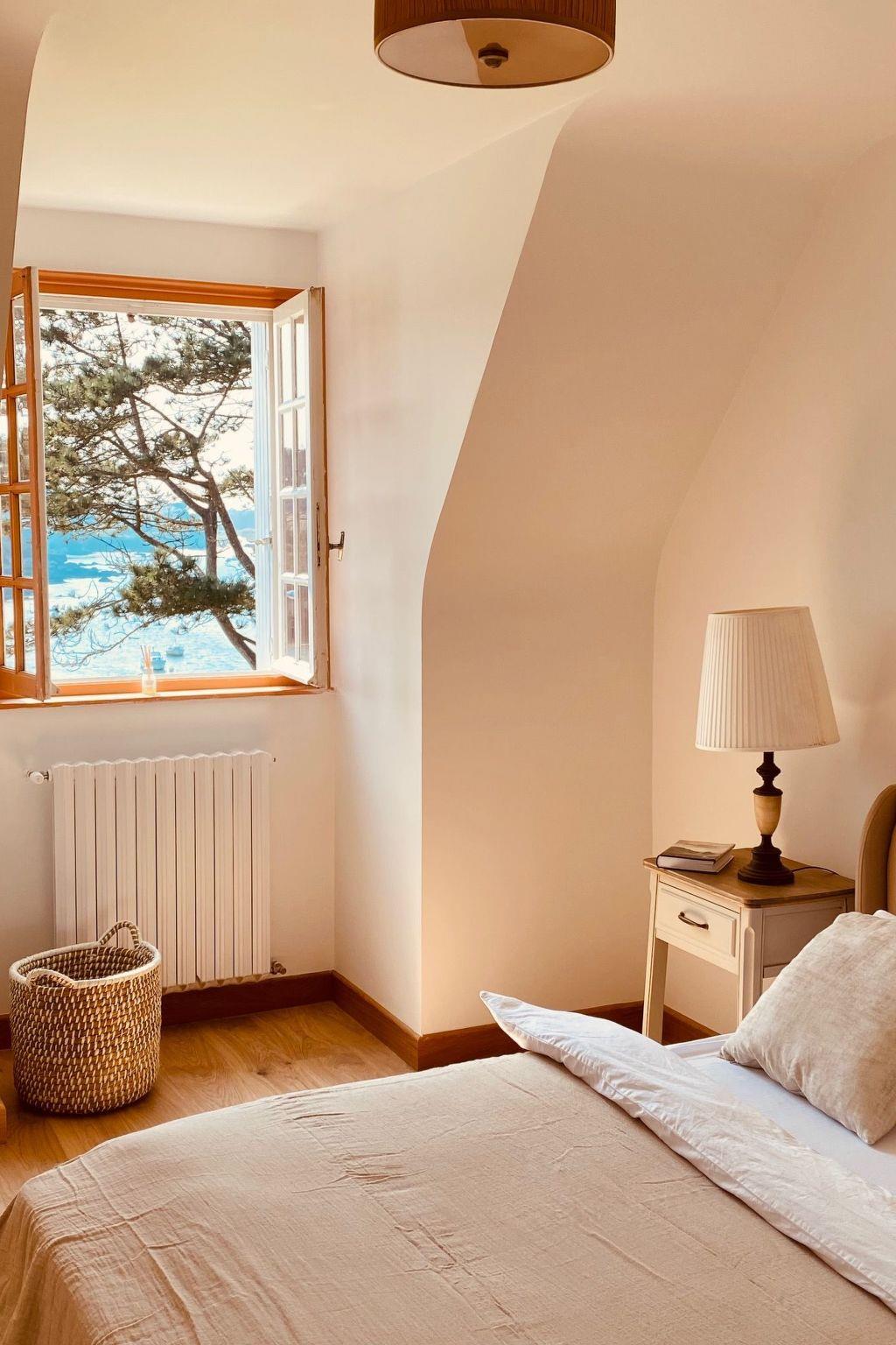 The villa has several aspects that make it stand out from other holiday homes, namely an imposing rustic granite Breton style exterior; and a top modern holiday home inside - tip top renovated, modern and luxurious - all in country house style. Many aspects of the dignified property have been preserved - or originally renovated, such as the large arched windows in the living area, the man-sized fireplace from an old manoir, or the natural terracotta floor and the oak beams in the living room. The new kitchen has been opened up to the living area, and all toilets and bathrooms have been renovated. Tasteful tiles and modern fittings characterise both bathrooms - the highlight is of course the large sauna in the spa area. But actually the biggest advantage of all is of course - the fantastic location - the view is unique and more than romantic - a sea view; which you couldn't wish for better on your holiday - the bay and the picturesque harbour are practically at your feet - and the nice thing again; due to the slight elevation of the property, nobody can look in - you are "right in the middle" and yet unobserved and alone in your holiday home, be it on your terrace or in the garden.