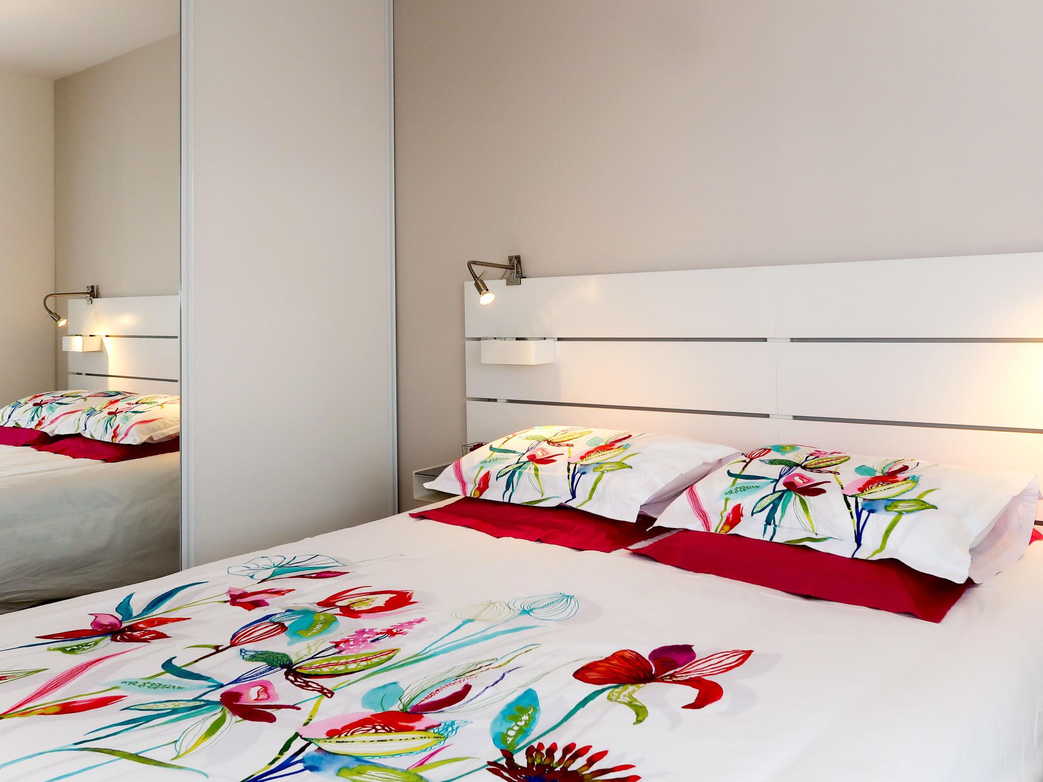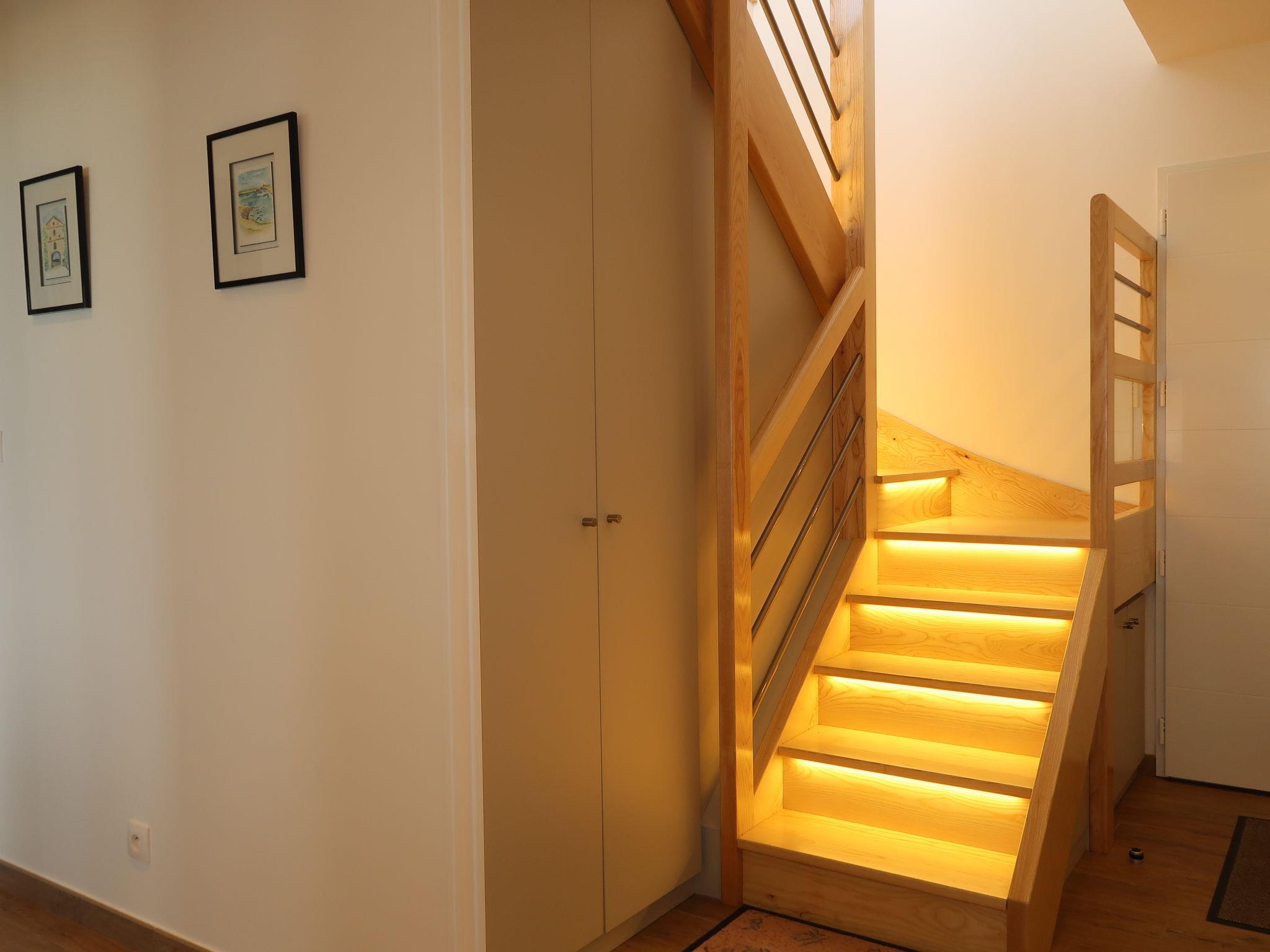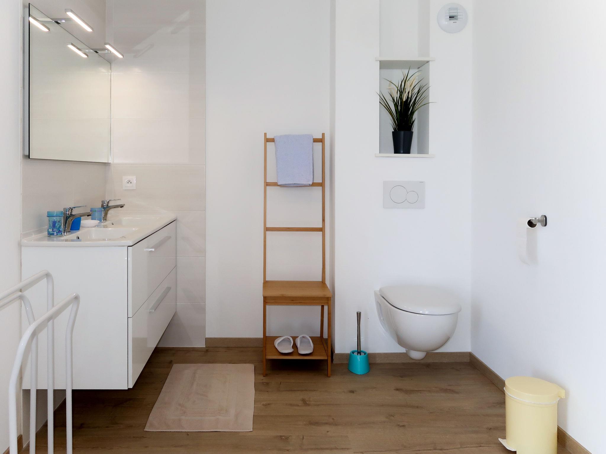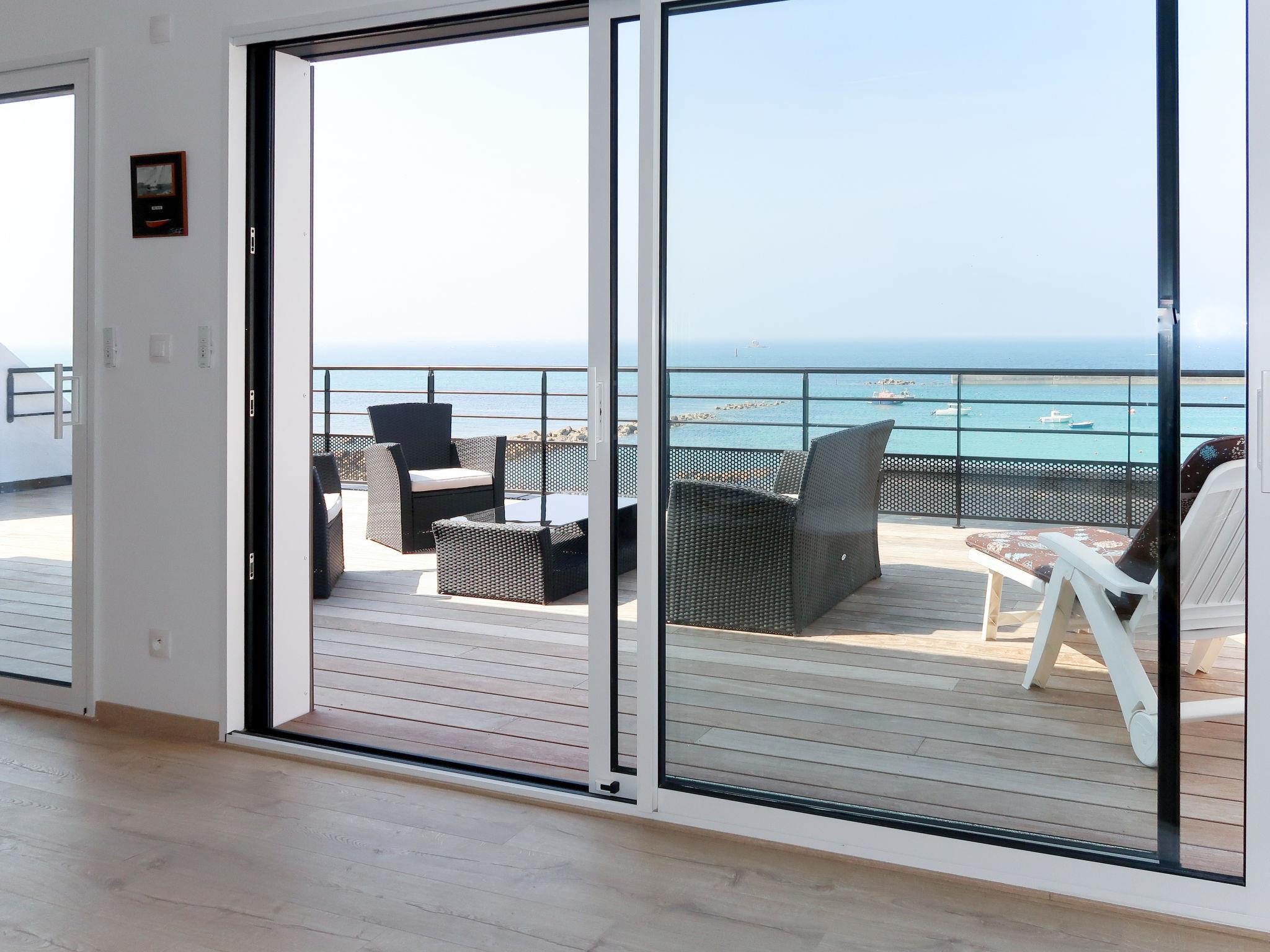 "De la Digue", 4-room terraced house 130 m2 on 2 levels. Bright, fully renovated in 2019, beautiful and modern furnishings: living/dining room with Scandinavian wood stove, dining table and TV. Exit to the terrace. 1 room with 1 french bed (160 cm, length 200 cm), shower/WC. Exit to the terrace. Open kitchen (oven, dishwasher, 4 ceramic glass hob hotplates, toaster, kettle, microwave, freezer, electric coffee machine). Sep. WC. Upper floor: open gallery with TV. Exit to the balcony. 1 room with 2 beds (90 cm, length 190 cm). 1 room with 1 french bed (160 cm, length 200 cm). Shower/WC, double hand-basin. Electric heating. Parquet floors. Large balcony, terrace partly roofed, small terrace. Terrace furniture, balcony furniture, barbecue (portable), deck chairs (5). Marvellous panoramic view of the sea. Facilities: washing machine, dryer, iron, children's high chair, baby cot. Internet (WiFi, free). Please note: non-smoking house. Smoke alarm. Instead of an enclosed bedroom, some sleeping areas are located in an open-plan area (gallery, alcove, etc.).