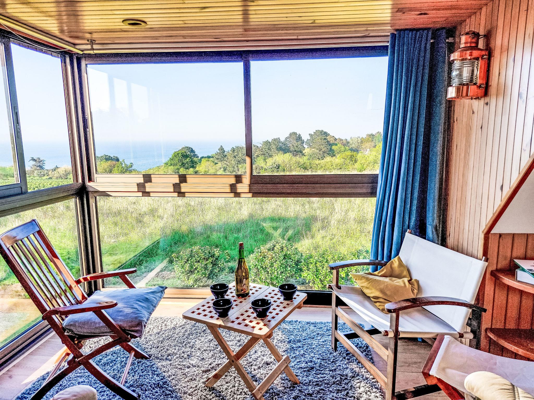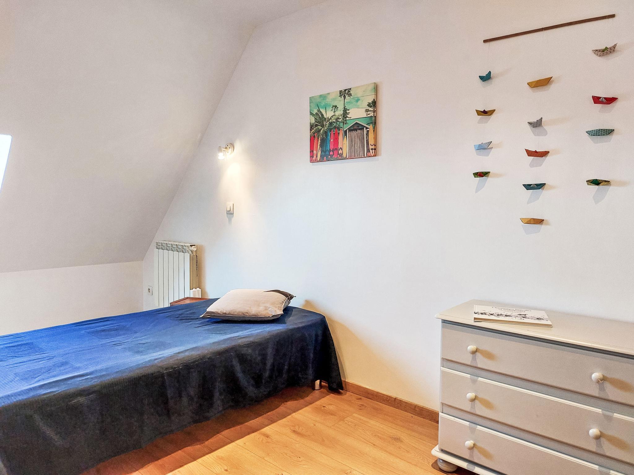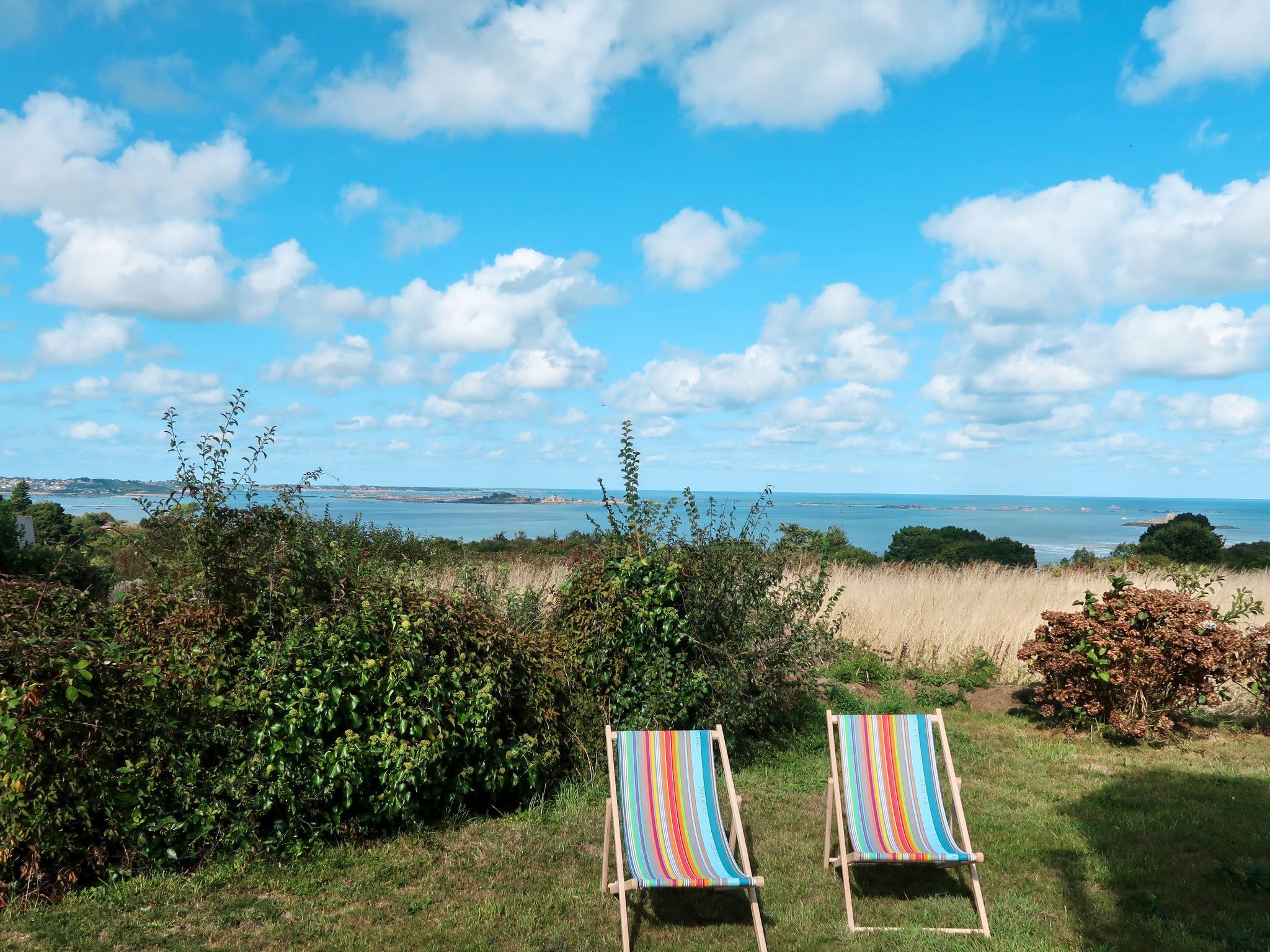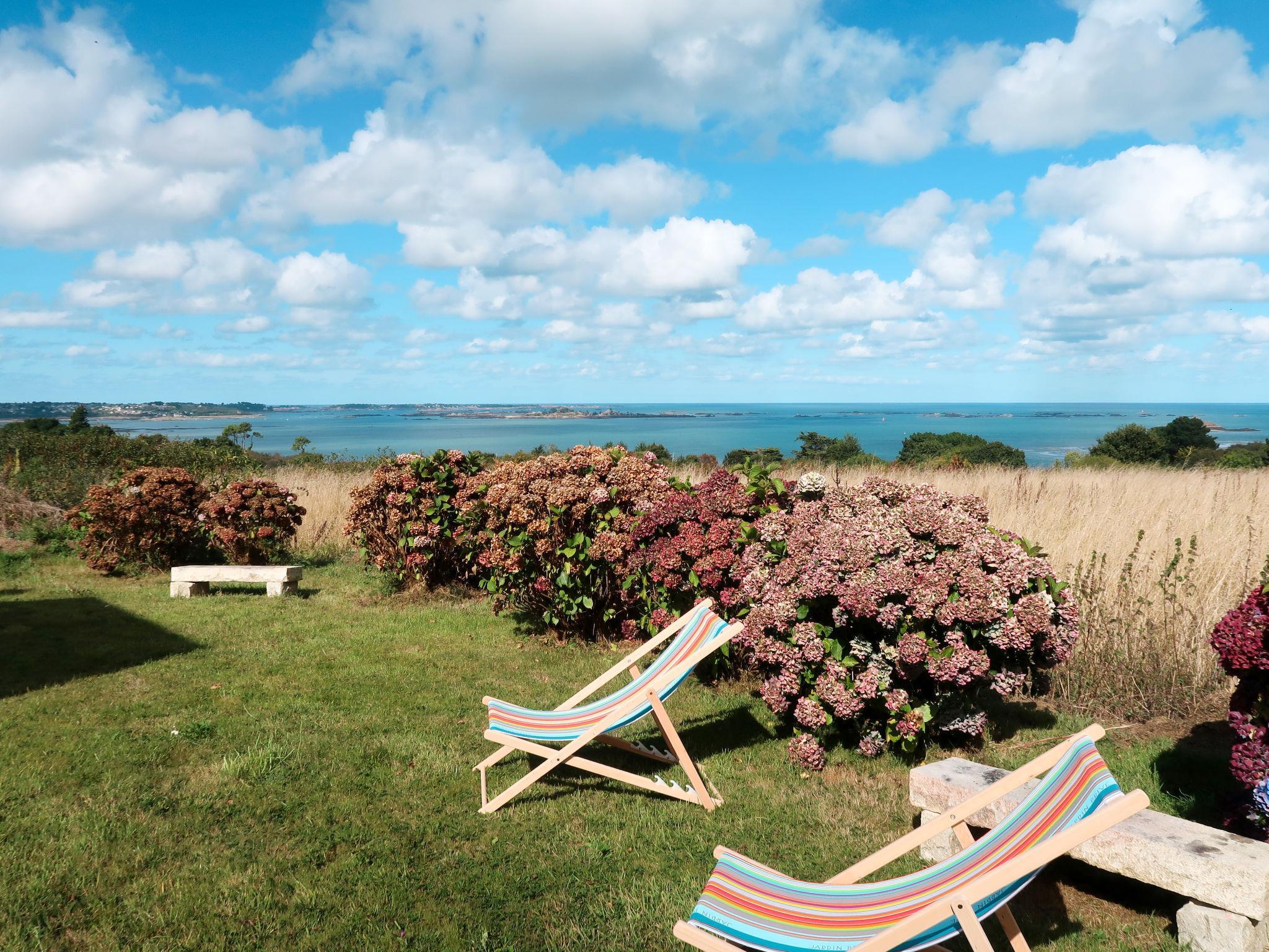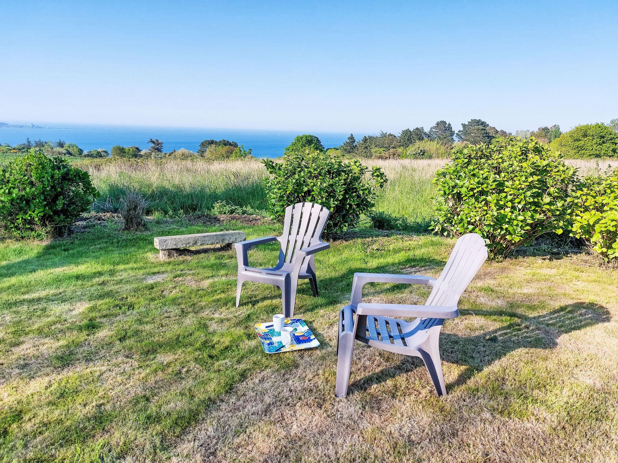 "Ti Loïk", 5-room house 100 m2 on 2 levels. Bright, beautiful and cosy furnishings: 1 room with 1 french bed (140 cm, length 190 cm). Dining room with dining table and wood-burning stove. Exit to the garden. Open kitchen (oven, dishwasher, 3 induction hot plates, toaster, kettle, microwave, freezer, electric coffee machine). Shower, sep. WC. Upper floor: living room with sloping ceilings with rooflight with 1 double sofabed (140 cm, length 190 cm), TV, radio, CD-player, hi-fi system and DVD. Walk-through room with 1 french bed (140 cm, length 190 cm). Interconnecting room with 2 beds (90 cm, length 190 cm). Sep. WC. Electric heating. Terrace furniture, barbecue (portable), deck chairs (4), box-room. Beautiful view of the sea. Facilities: washing machine, iron, children's high chair, baby cot. Internet (WiFi, free). Please note: non-smoking house. Smoke alarm.