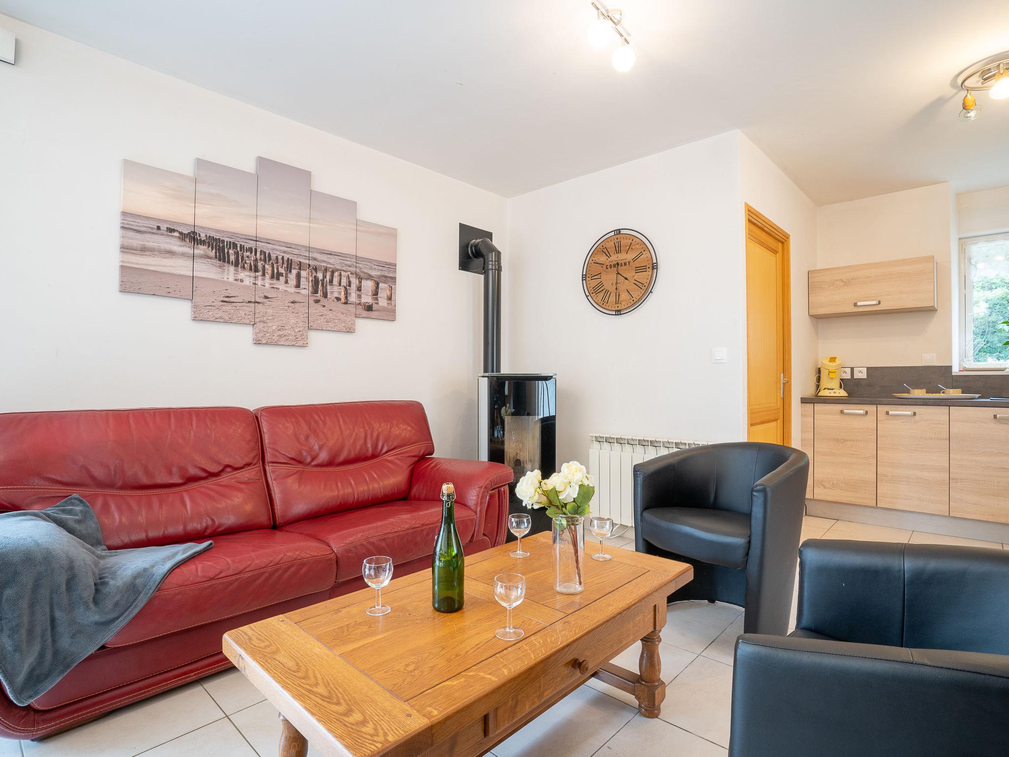 "Gîte des Perdrix", 4-room house 80 m2 on 2 levels. Beautiful and cosy furnishings: living/dining room with dining table, satellite TV, DVD and wood-burning stove. Exit to the terrace. 1 room with 1 french bed (160 cm, length 200 cm), shower. Open kitchen (oven, dishwasher, 4 induction hot plates, toaster, kettle, microwave, freezer, electric coffee machine, raclette grill). Sep. WC. Upper floor: 1 room with sloping ceilings with 1 french bed (160 cm, length 200 cm). 1 room with sloping ceilings with 2 beds (90 cm, length 190 cm). Bath/WC. Electric heating. Terrace. Terrace furniture. Facilities: washing machine, children's high chair, baby cot, hair dryer. Internet (WiFi, free). Please note: non-smoking house. Maximum 1 pet/ dog allowed. Smoke alarm.
