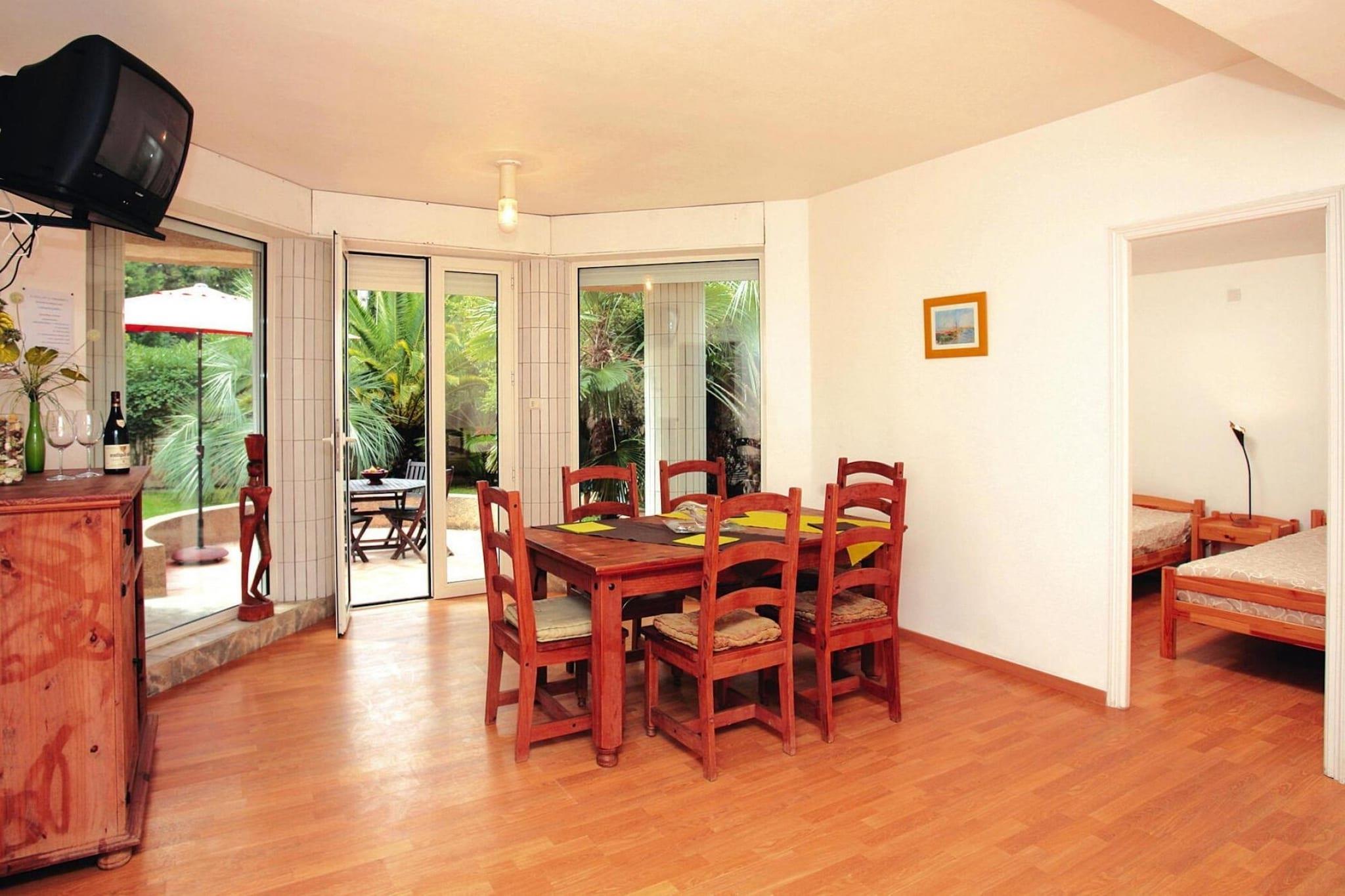 Tekøkken(kogeplade(Komfur med to kogeplader, elektrisk), kaffemaskine, køle-fryseskab), Stue/soveværelse(dobbeltsovesofa, Fjernsyn(Tyske TV-kanaler)), soveværelse(dobbeltseng), badeværelse(bruser, toilet), vaskemaskine(deles med andre gæster, betalt), balkon eller terrasse, havemøbler, parkering, swimmingpool(deles med andre gæster, udendørs), barnestol, baby crib(free)