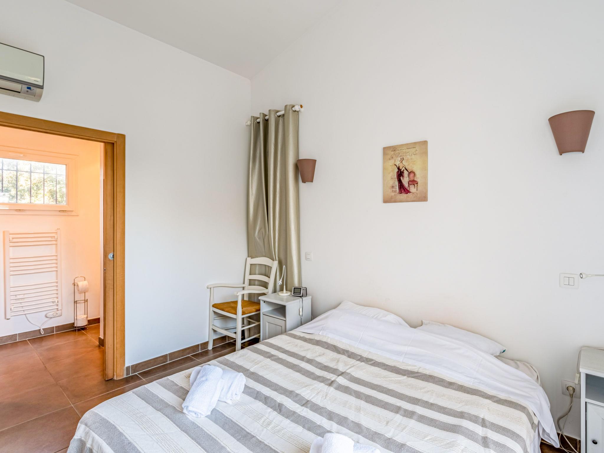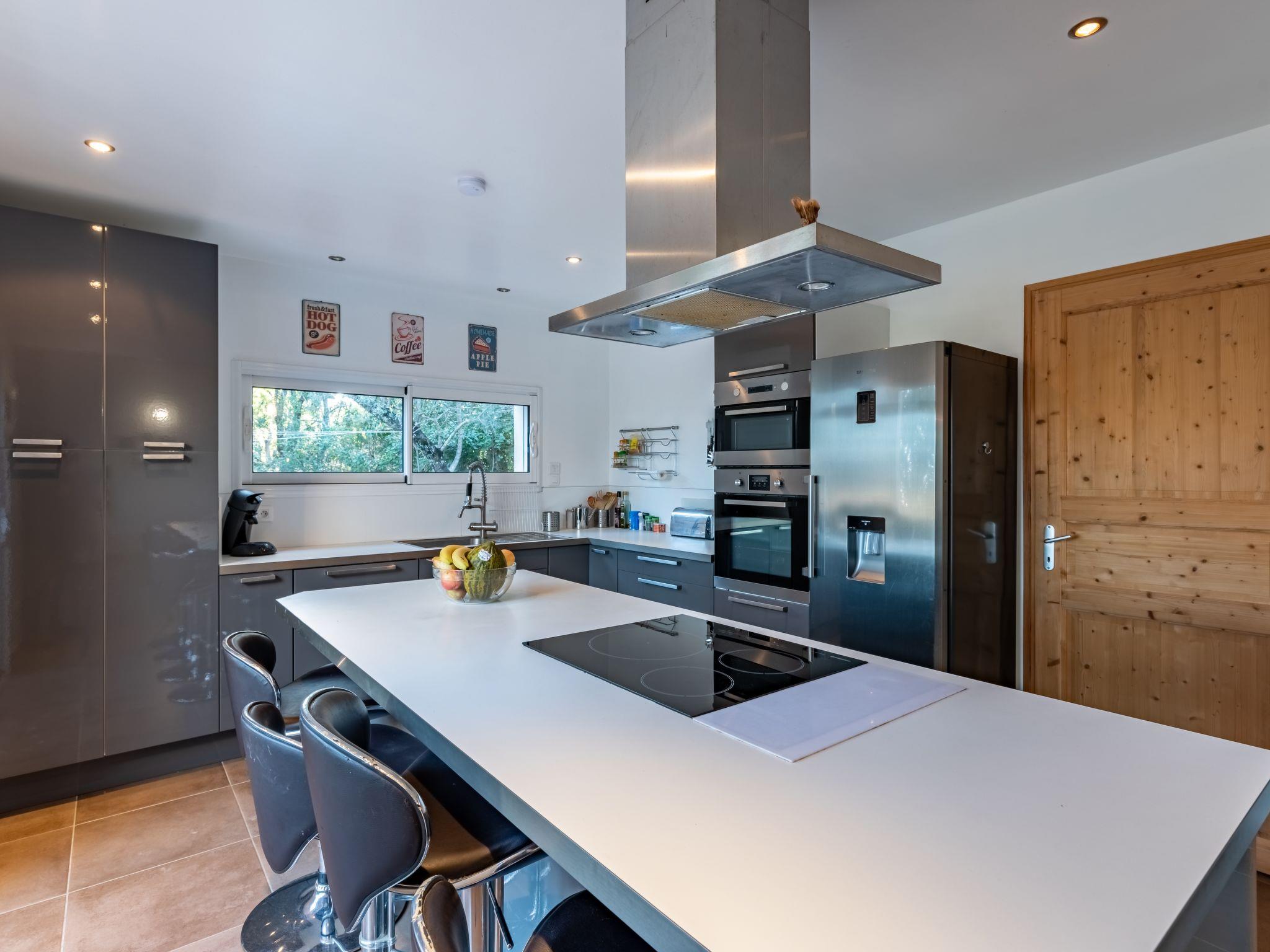 4-room house 130 m2 on 2 levels. Spacious: large living/dining room with 1 double sofabed (160 cm, length 190 cm), open-hearth fireplace (only for decoration), TV (flat screen), air conditioning. Exit to the terrace. 1 room with 1 french bed (160 cm, length 190 cm), shower/WC and TV (flat screen), air conditioning. Open kitchen (oven, dishwasher, 4 induction hot plates, kettle, microwave, freezer, electric coffee machine). Exit to the terrace. Sep. WC. Electric heating. On the lower ground floor: 2 rooms with panoramic window, each room with 1 french bed (140 cm, length 190 cm), shower/WC. Small balcony, terrace 13 m2, south facing position. Terrace furniture, deck chairs (2). Partial view of the sea. Facilities: washing machine, iron, hair dryer. Internet (WiFi, free). Please note: non-smokers only. 1 small pet/ dog allowed. Smoke alarm. 2A247001315FA