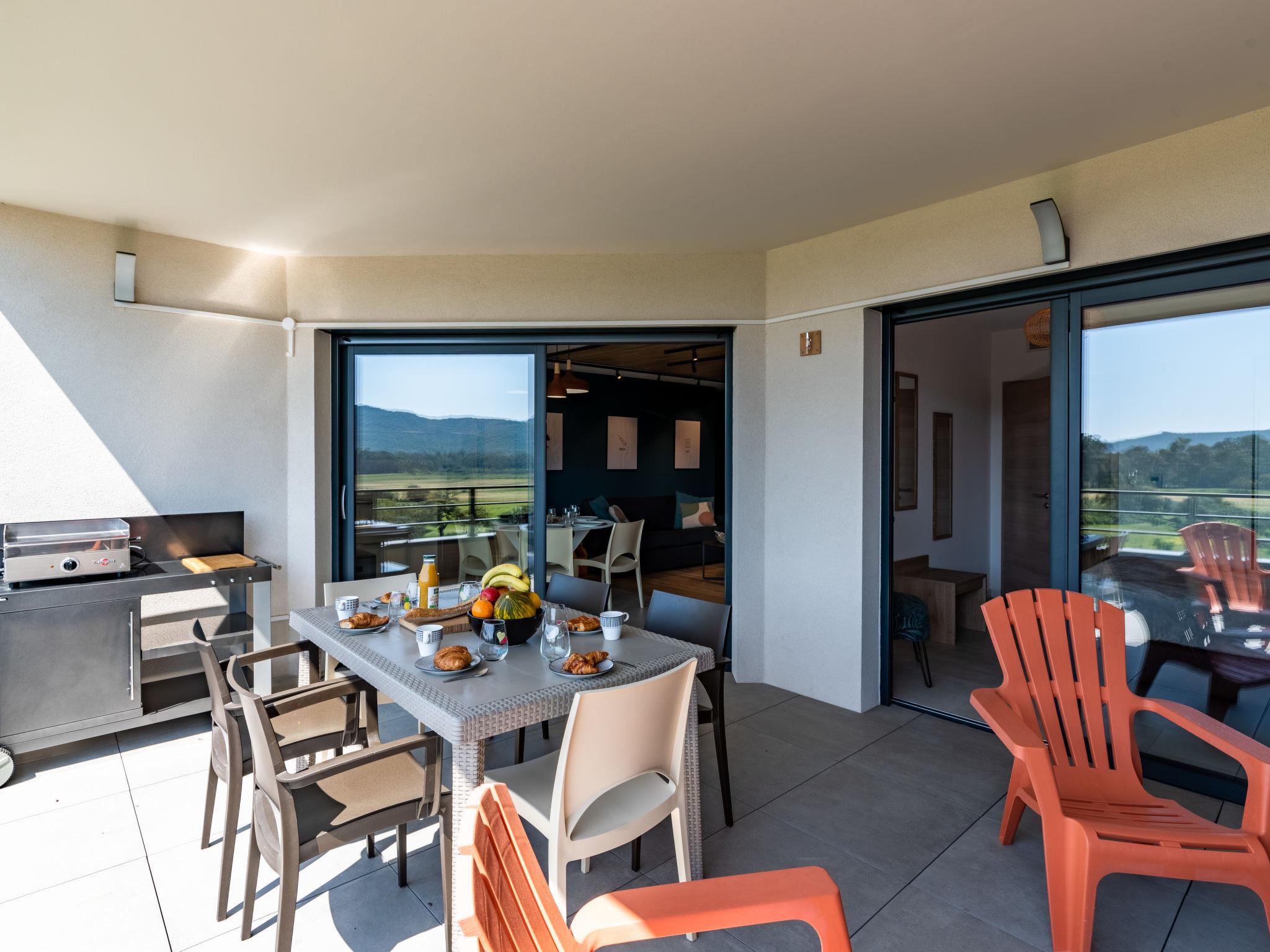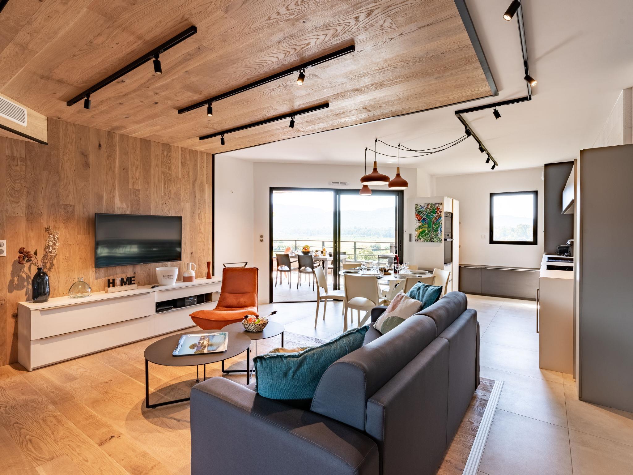 3-room apartment 72 m2 on 5th floor. Very beautiful and modern furnishings: living/dining room with 1 double sofabed (160 cm, length 200 cm), TV (flat screen). Exit to the terrace. 1 room with 1 french bed (160 cm, length 200 cm). Exit to the terrace. 1 room with 2 beds (90 cm, length 190 cm). Open kitchen (oven, dishwasher, 4 induction hot plates, toaster, kettle, microwave, freezer, electric coffee machine). Shower/WC. Electric heating, air-conditioning. Terrace 25 m2. Terrace furniture. Beautiful view of the mountains. Facilities: washing machine, dryer. Internet (WiFi, free). Parking. Please note: suitable for families. Non-smokers only. Smoke alarm. Plancha. Wine cellar. 2A247000320EC