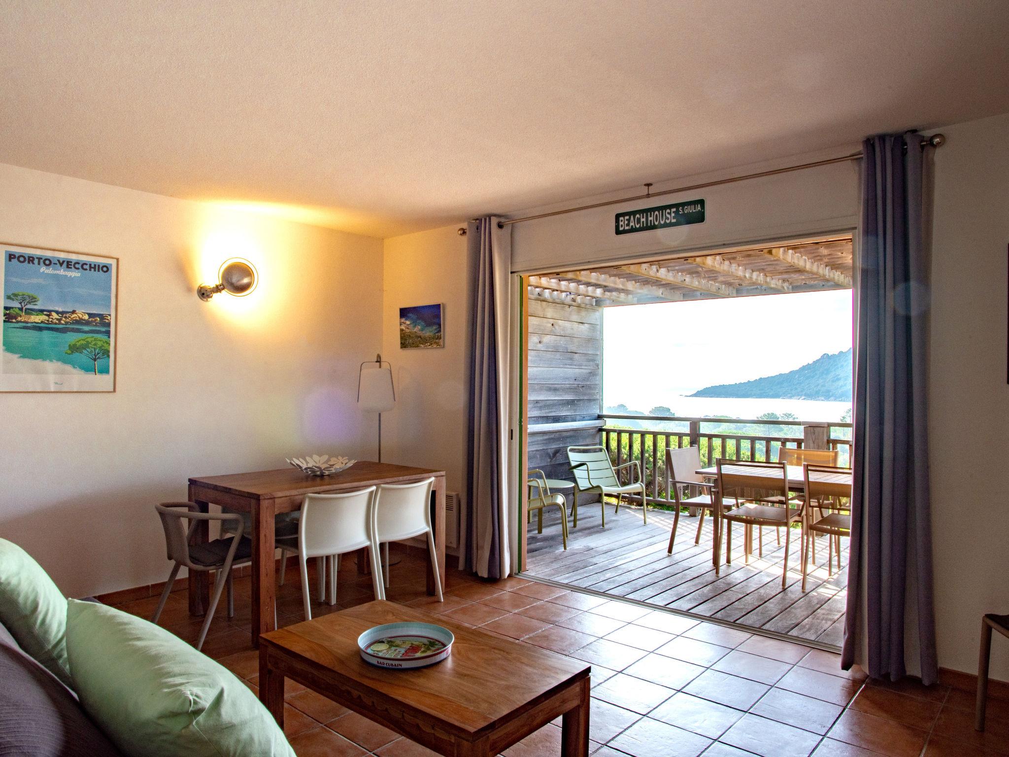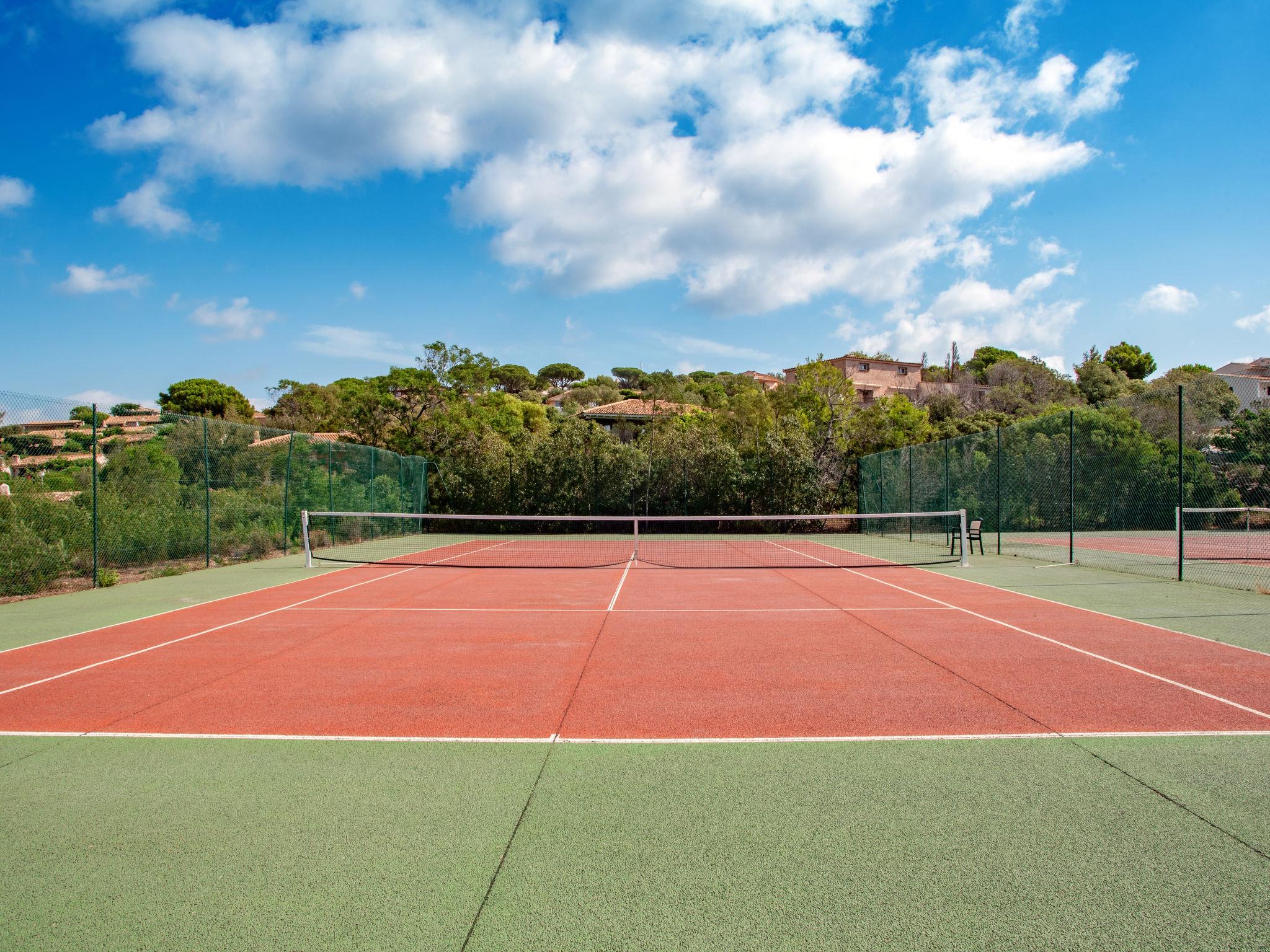 Santa Giulia 8 km from Porto Vecchio: Beautiful, cosy resort "Les Hameaux de Santa Giulia", surrounded by trees. 59 houses in the residence. In the district of Santa Giulia 8 km from the centre of Porto Vecchio, 30 km from the centre of Bonifacio, 143 km from the centre of Bastia, in a sunny, elevated position on a slope, 500 m from the sea, direct access to the beach. For shared use: terraced garden, 4 ha with plants and trees, natural garden, swimming pool heated, fenced (15 x 8 m, seasonal availability: 01.Apr. - 30.Sep.). Outdoor shower, tennis, terrace. In the complex: reception, WiFi. Parking at the house on the premises. Shop 400 m, supermarket 8 km, restaurant, bar 400 m, bus stop 3 km, sandy beach "Santa Giulia" 500 m. Please note: car recommended. Residence with electric gates. There is an annual music festival on Santa Giulia beach at the end of August. Wi-Fi only at the reception.