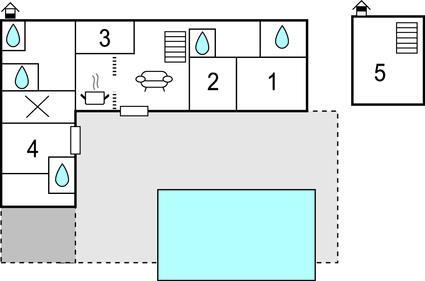 Bemærk: Et af soveværelserne med eget bad er tilgængeligt udefra. Soveværelse 5 ovenpå har ingen dør.