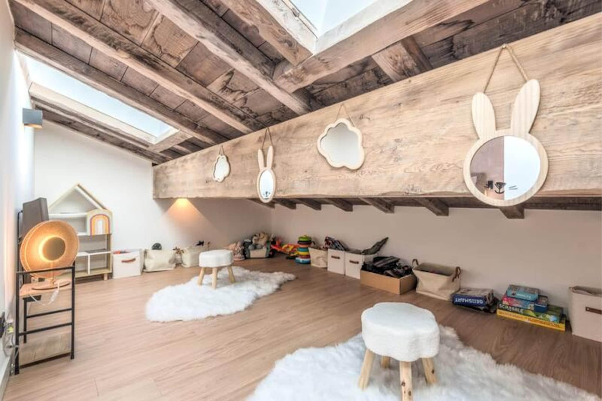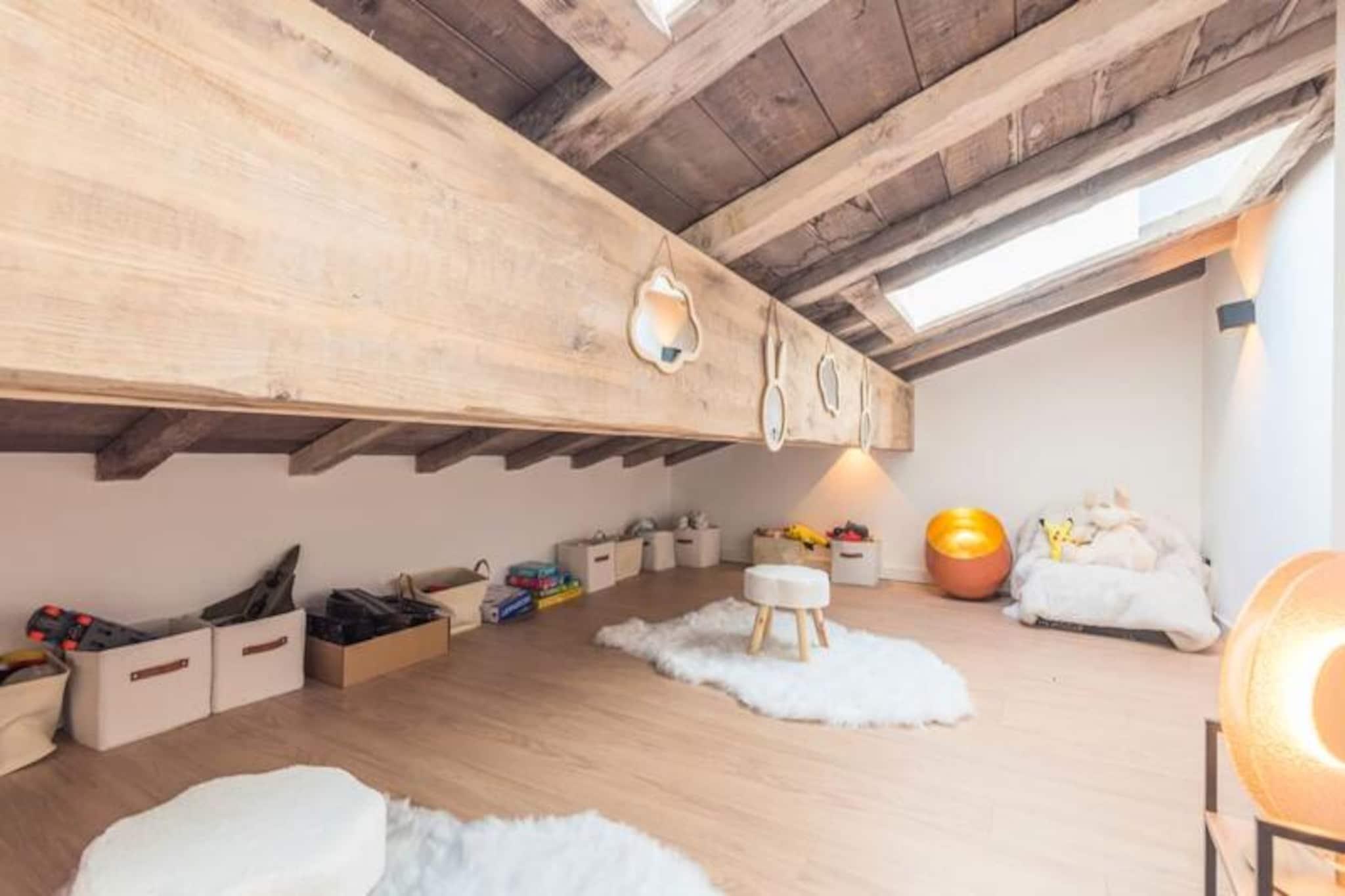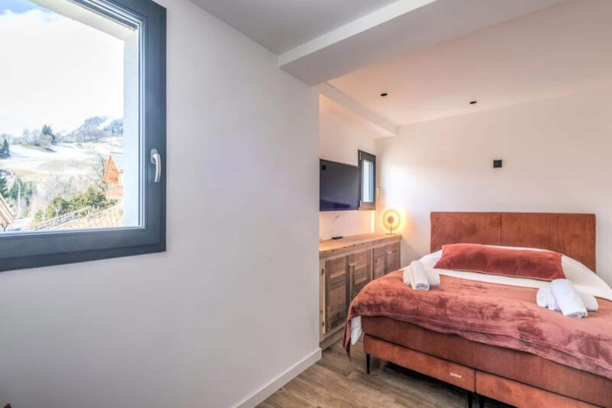 I den maleriske landsby Praz-sur-Arly, hvor de majestætiske Alper rejser sig for at hilse på himlen, tilbyder dette elegante dobbelthus et idyllisk tilflugtssted for op til otte gæster. Charmen af ??gammelt træ og moderne komfort blandes problemfrit og skaber en varm og indbydende atmosfære, perfekt til familieferier eller en ferie med venner. Her føles hvert øjeblik som en flugt ind i hjertet af naturens storhed. \n\nMed et rummeligt areal på 165 m² kan hytten prale af et gennemtænkt design. Den åbne opholdsstue har en rummelig stue og spiseplads, der åbner ud til en balkon med betagende udsigt over bjergene. Det fuldt udstyrede køkken, komplet med førsteklasses apparater såsom kaffemaskine, ismaskine og opvaskemaskine, sikrer ubesværet madlavning. Ovenpå tilbyder soveværelset en kingsize-seng og eget badeværelse, mens underetagen huser tre queensize-soveværelser, to stilfulde badeværelser med italienske brusere og yderligere faciliteter såsom et spillerum, Wi-Fi og satellit-tv. Praktiske funktioner såsom et skiskab, privat parkering og centralvarme sikrer et behageligt ophold året rundt. \n\nPraz-sur-Arly ligger i hjertet af Haute-Savoie og tilbyder direkte adgang til skiområdet Espace Diamant, der kan prale af 192 km pister for vintersportsentusiaster. Om sommeren forvandles regionen til et paradis for vandrere, mountainbikere og eventyrlystne med aktiviteter som paragliding og rafting. Landsbyens savoyard-charme afspejles i dens traditionelle arkitektur, lokale markeder og gourmetrestauranter, der serverer raffinerede retter lavet af regionale råvarer. \n\nUanset om du er tiltrukket af spændingen ved alpine eventyr eller bjergenes fredfyldte skønhed, lover denne hytte en uforglemmelig ferie fyldt med komfort, stil og de franske alpers tidløse charme.