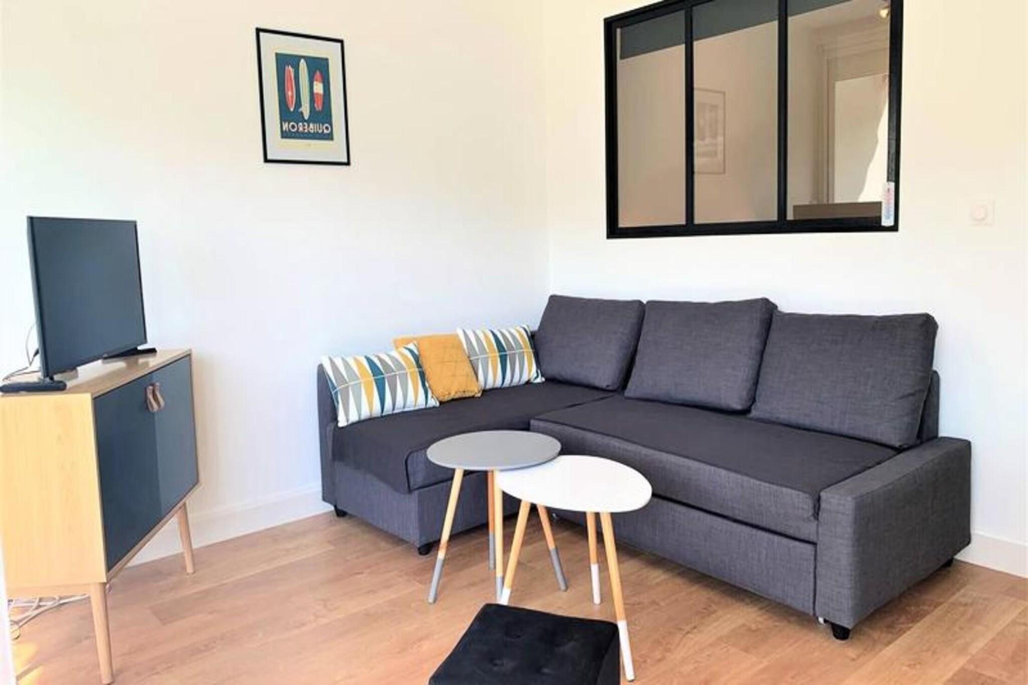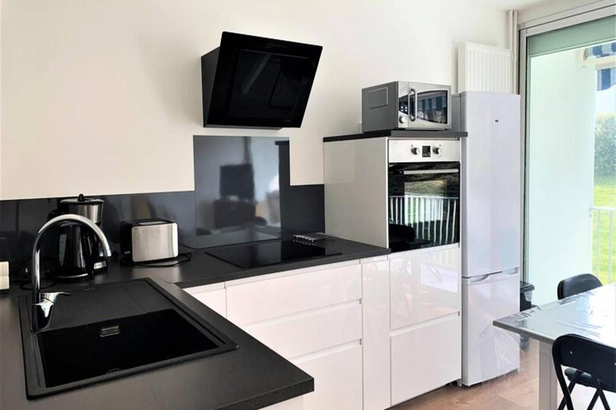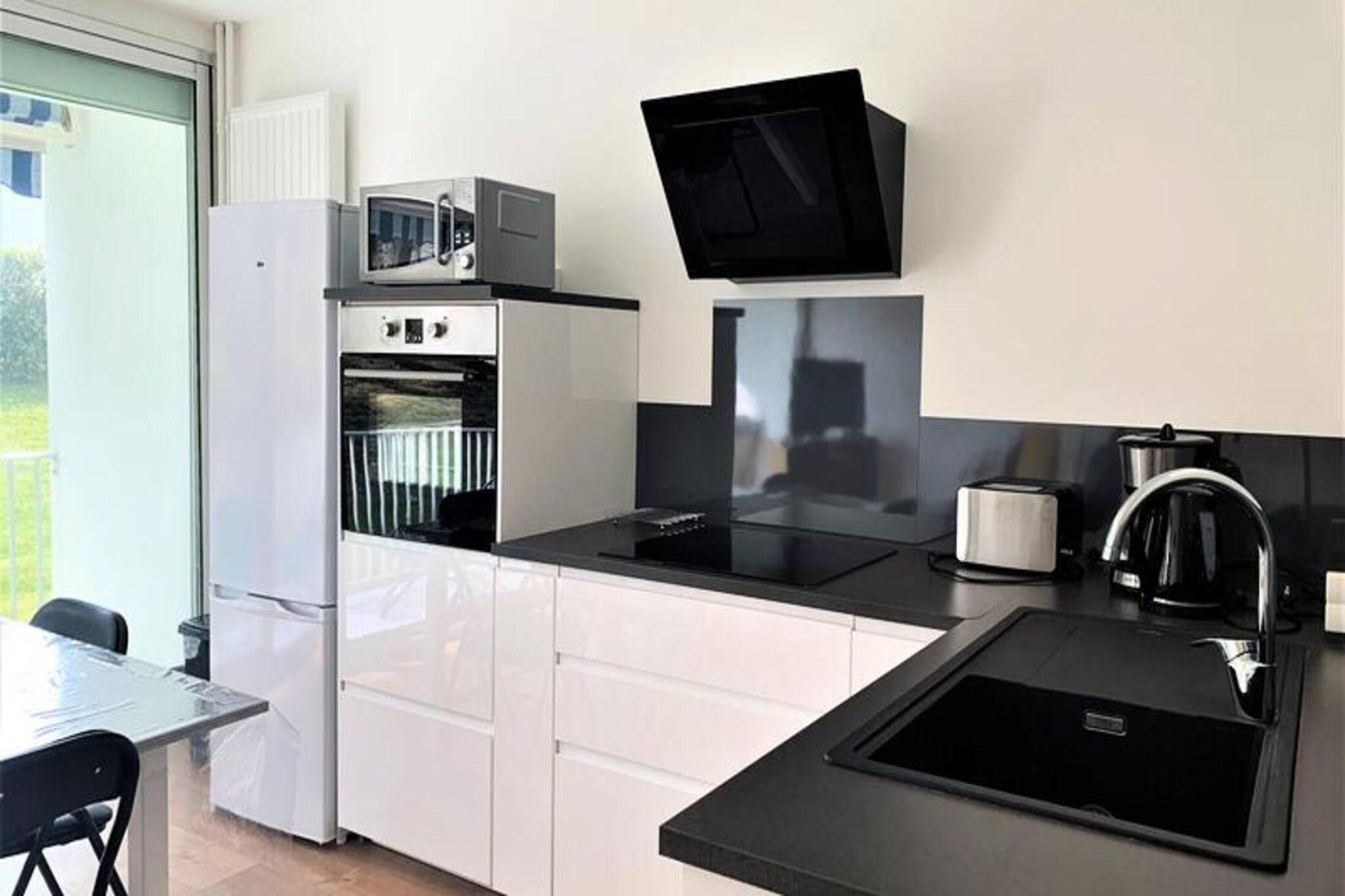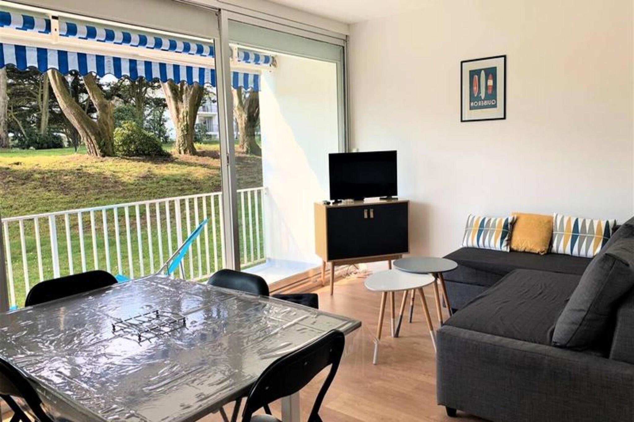 This beautifully renovated 2-room apartment is perfect for a stay for up to 3 people, featuring a comfortable 160x200cm bed in the bedroom and a 140x190cm convertible sofa in the living room. The apartment is located on the ground floor and offers a peaceful setting, with a south-facing loggia furnished with garden furniture for guests to enjoy the fresh air. Pets are not allowed, ensuring a quiet environment. The accommodation is also equipped with duvets for added comfort. A private, closed garage space is included in the basement, and shared bicycle storage is available for outdoor enthusiasts. The apartment's prime location, just a few steps from Goviro beach, offers easy access to the stunning coastline and thalassotherapy center, perfect for relaxation and wellness. The town center of Quiberon is only 1.6 km away, with charming cafes, markets, and shops that add to the local atmosphere. Visitors can stroll along the sea, exploring the nearby attractions and enjoying the beautiful surroundings. Designed for convenience and comfort, the apartment features a fully equipped open kitchen with modern appliances, including an oven, induction hob, microwave, fridge/freezer, and dishwasher. A spacious bathroom with a walk-in shower and a washing machine ensures guests can feel at home. Additional services, such as end-of-stay cleaning, linen rental, and a wifi minibox, are available for a more comfortable stay, while heating and energy are included in the weekly price.