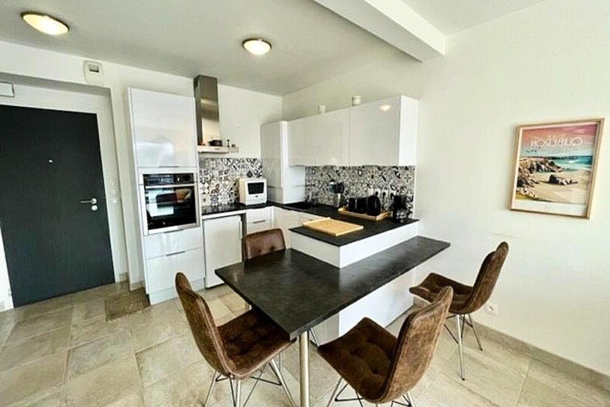 This cozy 2-room apartment offers a comfortable stay for up to 4 people. It includes a bedroom with a 140cm bed, a convertible sofa in the living room, and ample storage with a cupboard. The property is pet-friendly with an additional fee, allowing guests to bring their pets along. For added convenience, there is a private parking space (No. 14) and a south-west facing balcony with garden furniture. A consumption package is required, except from May to September, with optional end-of-stay cleaning and linen rental services available. Located just 300 meters from both the city center and the large beach of Quiberon, this apartment offers easy access to local cafes, shops, and markets. Guests can enjoy a variety of seaside activities or explore the charming town with its quaint streets and vibrant atmosphere. The property’s quiet and secure location provides a peaceful retreat while still being close to everything Quiberon has to offer. The apartment features a fully equipped kitchen with an oven, 3-burner ceramic hob, microwave, dishwasher, refrigerator, kettle, toaster, and coffee maker, perfect for preparing home-cooked meals. The bathroom includes a washing machine for longer stays, and the separate WC offers additional privacy. Guests can relax in the living room with a TV, or unwind on the balcony, enjoying the fresh air and view.