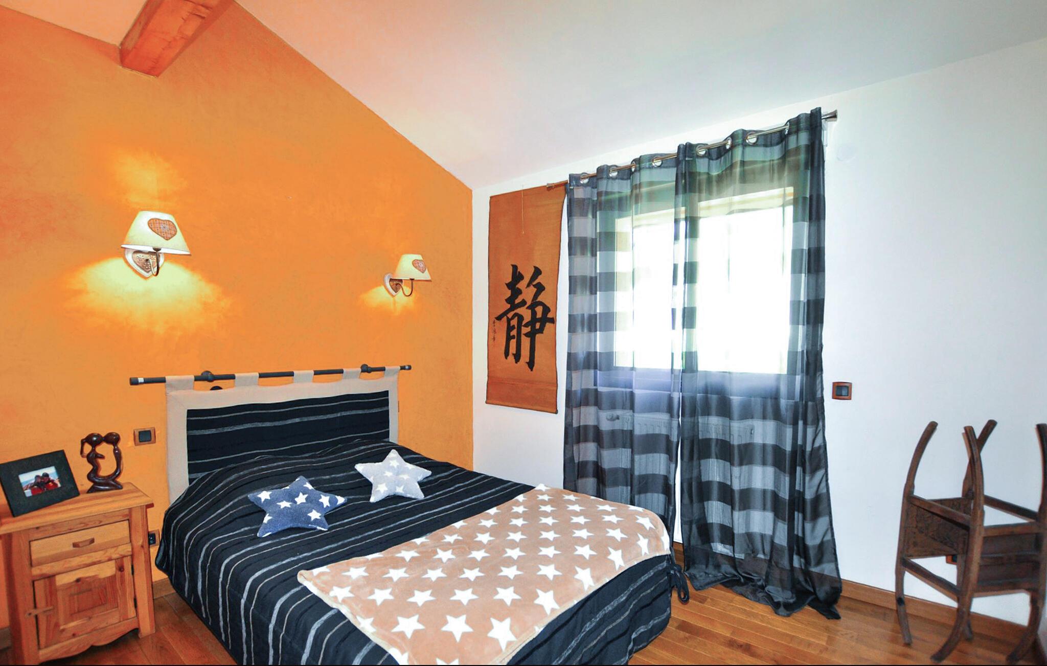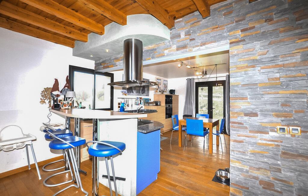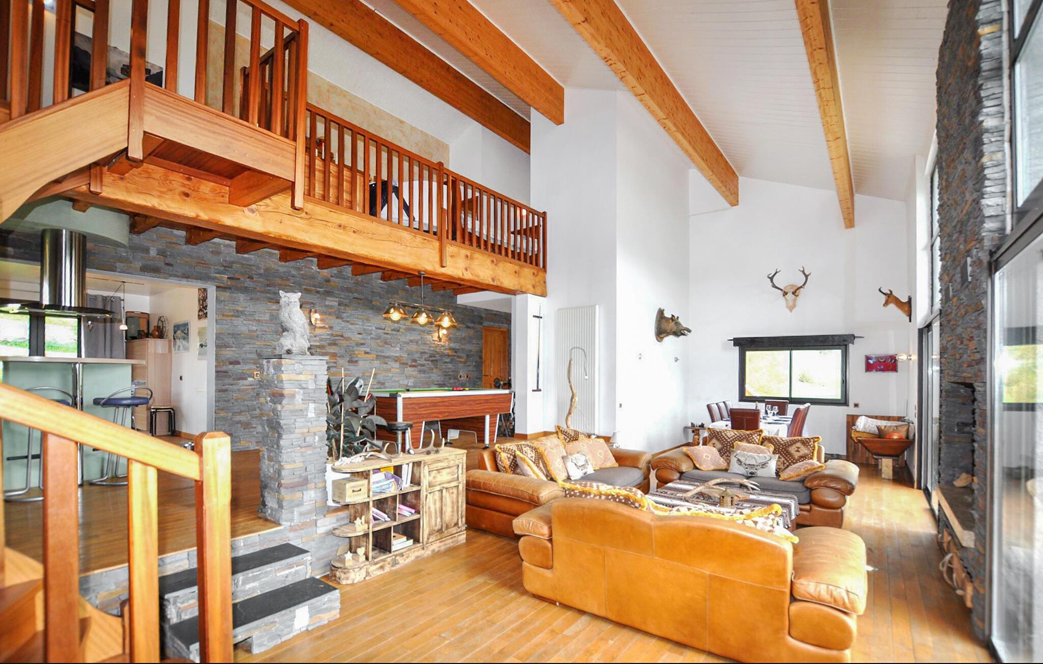 Dette smagfulde feriehus kombinerer rustik stil med moderne komfort og giver jer masser af plads til længe ventede familiesammenkomster eller en afslappende ferie med venner. Glæd jer til store gruppemåltider, snup et spil billard og snak om svundne tider med et glas vin i den indbydende sofa, mens pejsen tilføjer ekstra hygge.